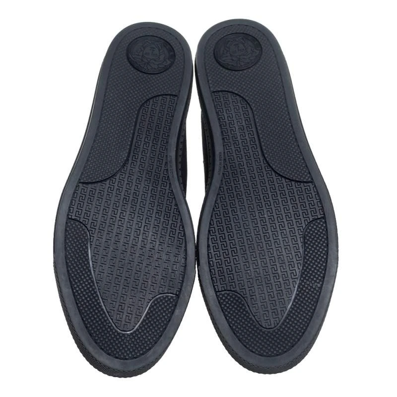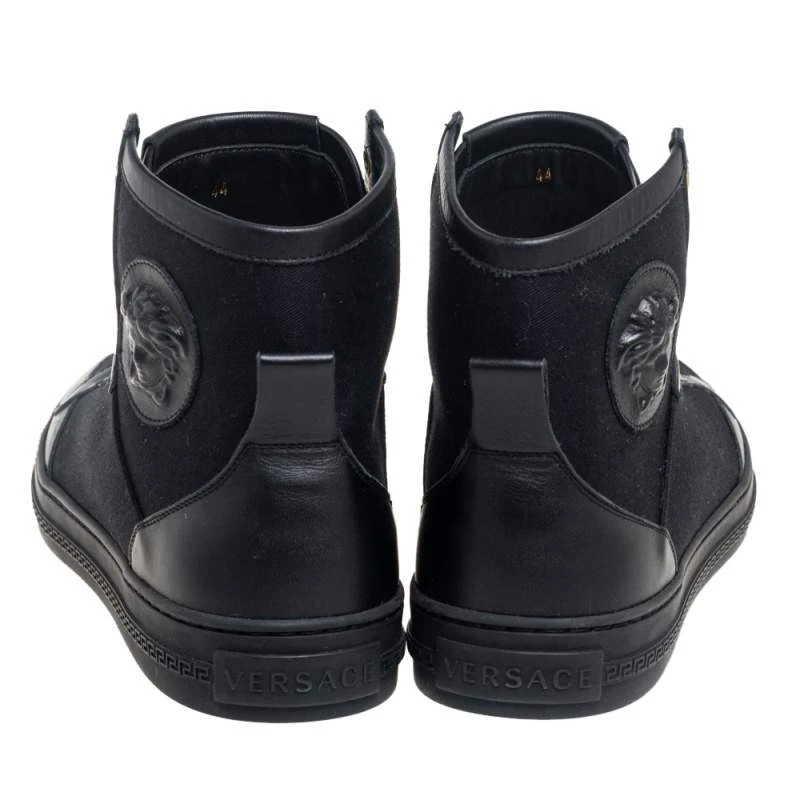 Coming in a classic high-top silhouette, these Versace sneakers are a seamless combination of luxury, comfort, and style. They are made from leather in a black shade. These sneakers are designed with the label’s logo on the sides, laced-up vamps, and comfortable insoles.