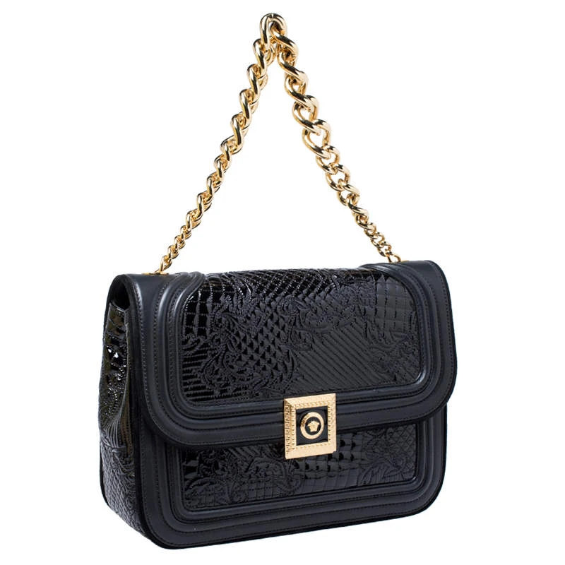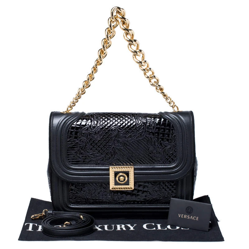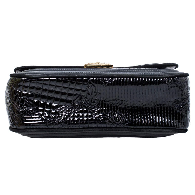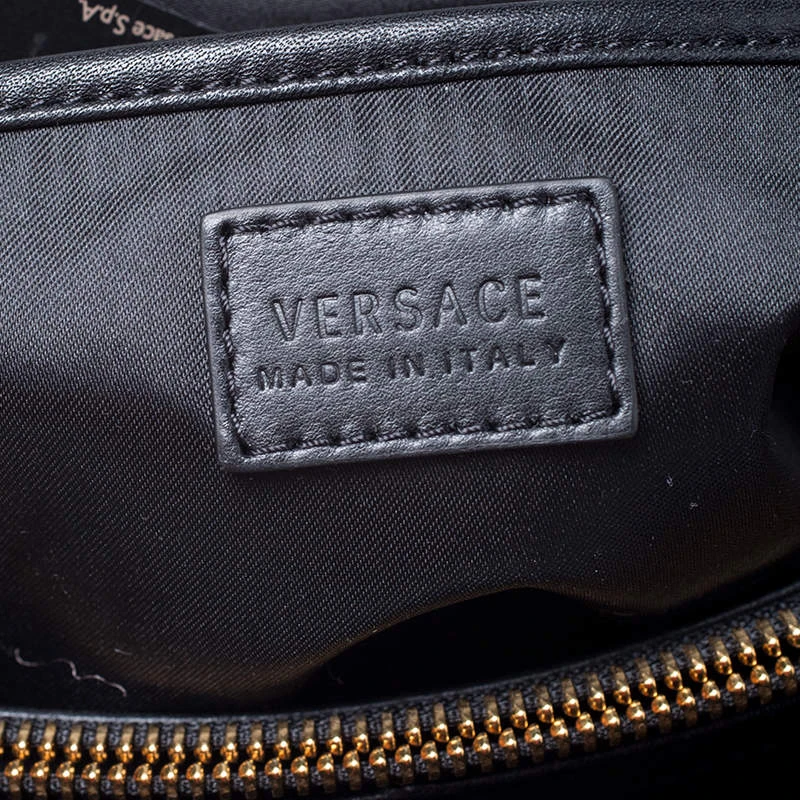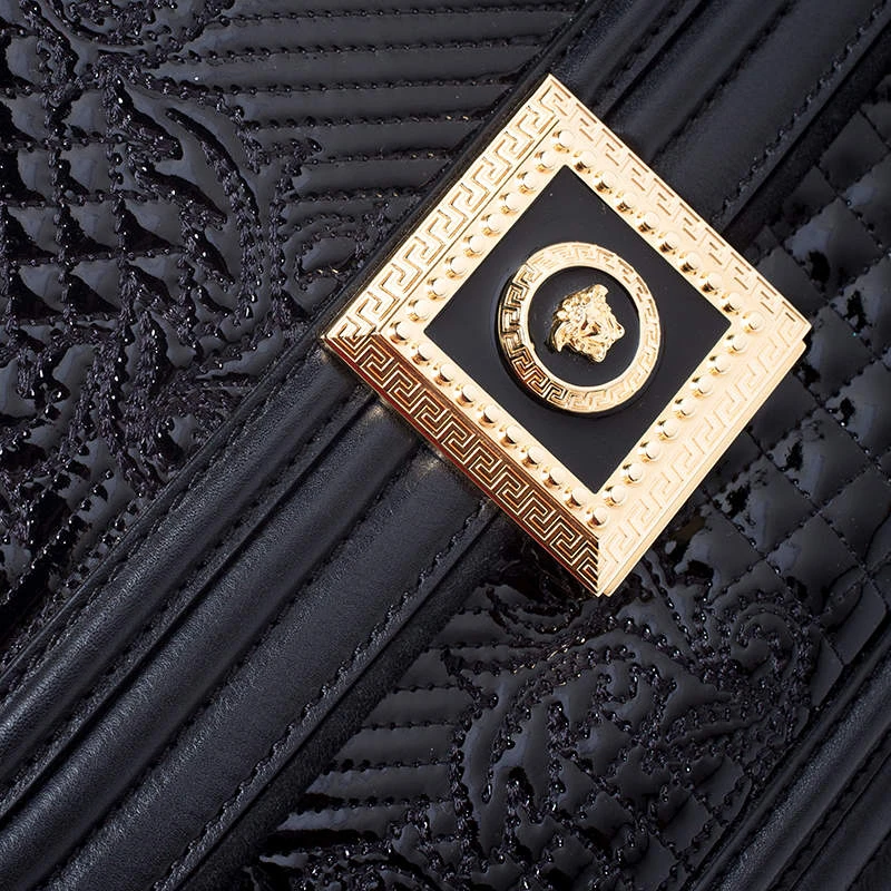 Embrace the prevailing trends in style with this chic bag by Versace. An example of luxe fashion, this beautifully crafted bag comes with a spacious nylon interior. Made in a leather and patent leather body, this bag can effortlessly be fashioned with both off-duty and formal looks.