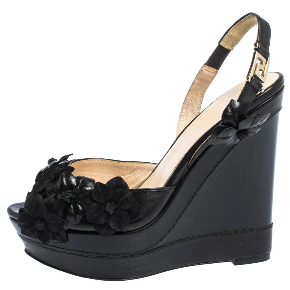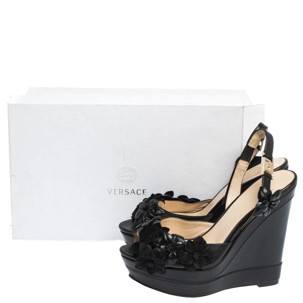 A perfect blend of comfort and high-fashion, these leather and suede sandals will sing in harmony with your style. The Versace sandals feature peep toes, flower details and slingbacks. They are balanced on wedge heels.