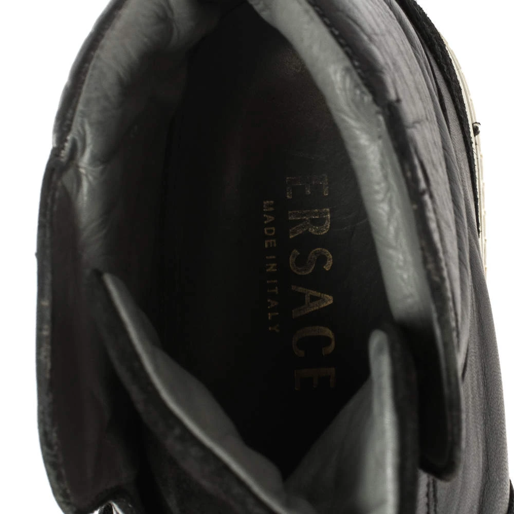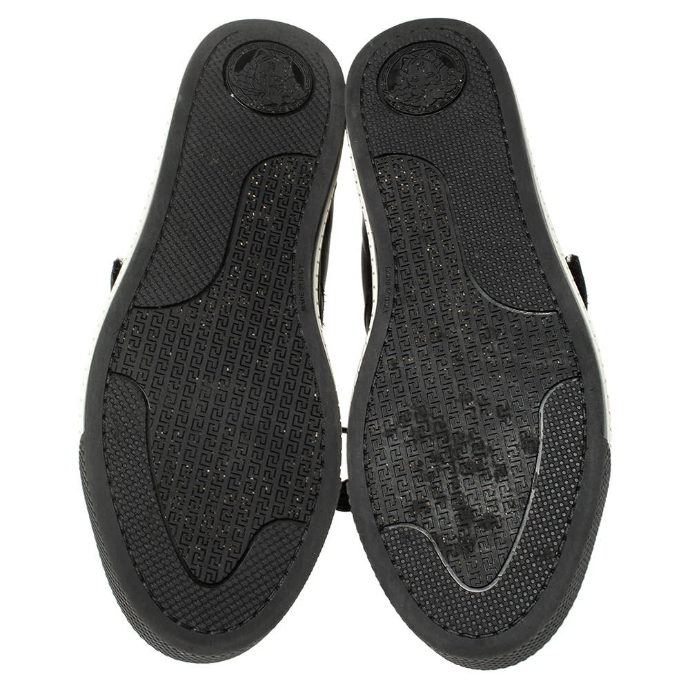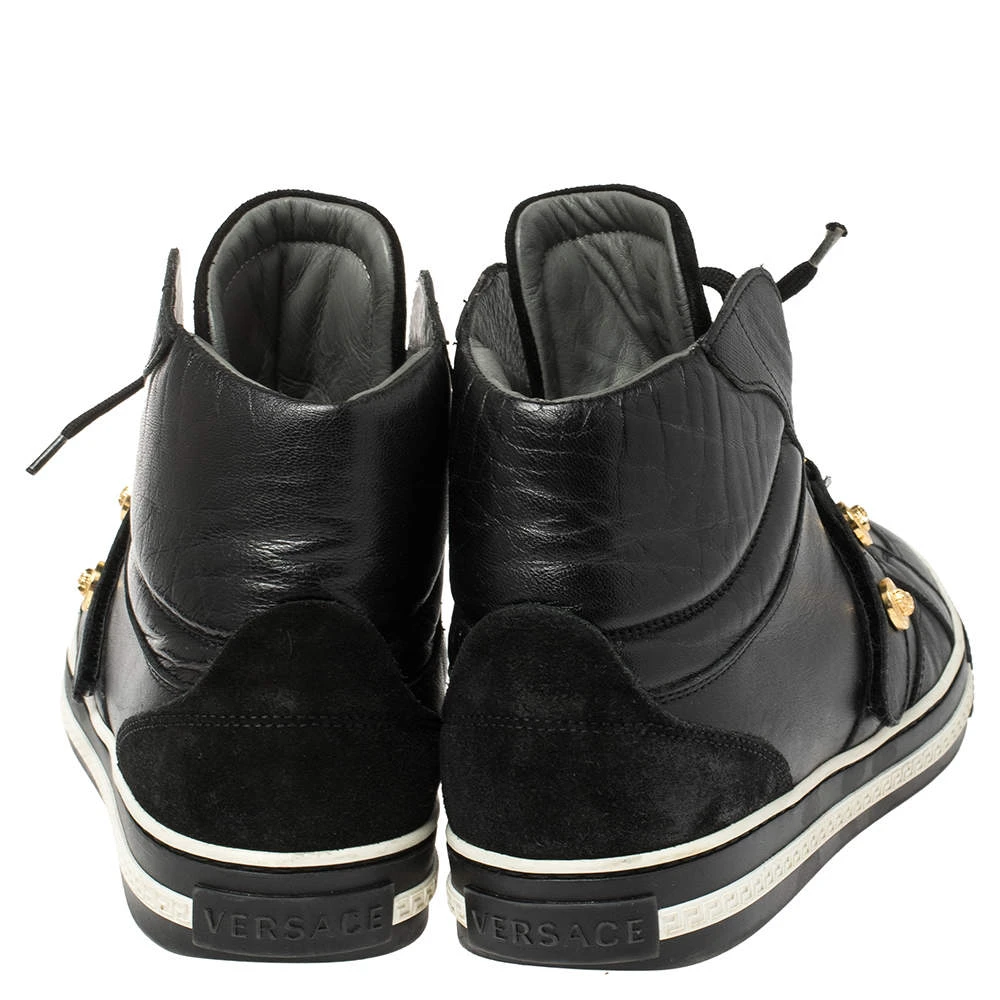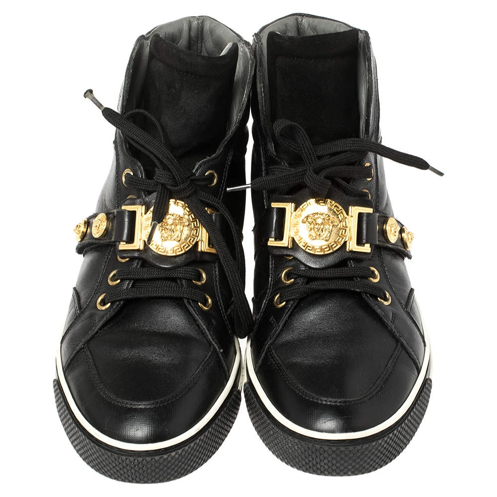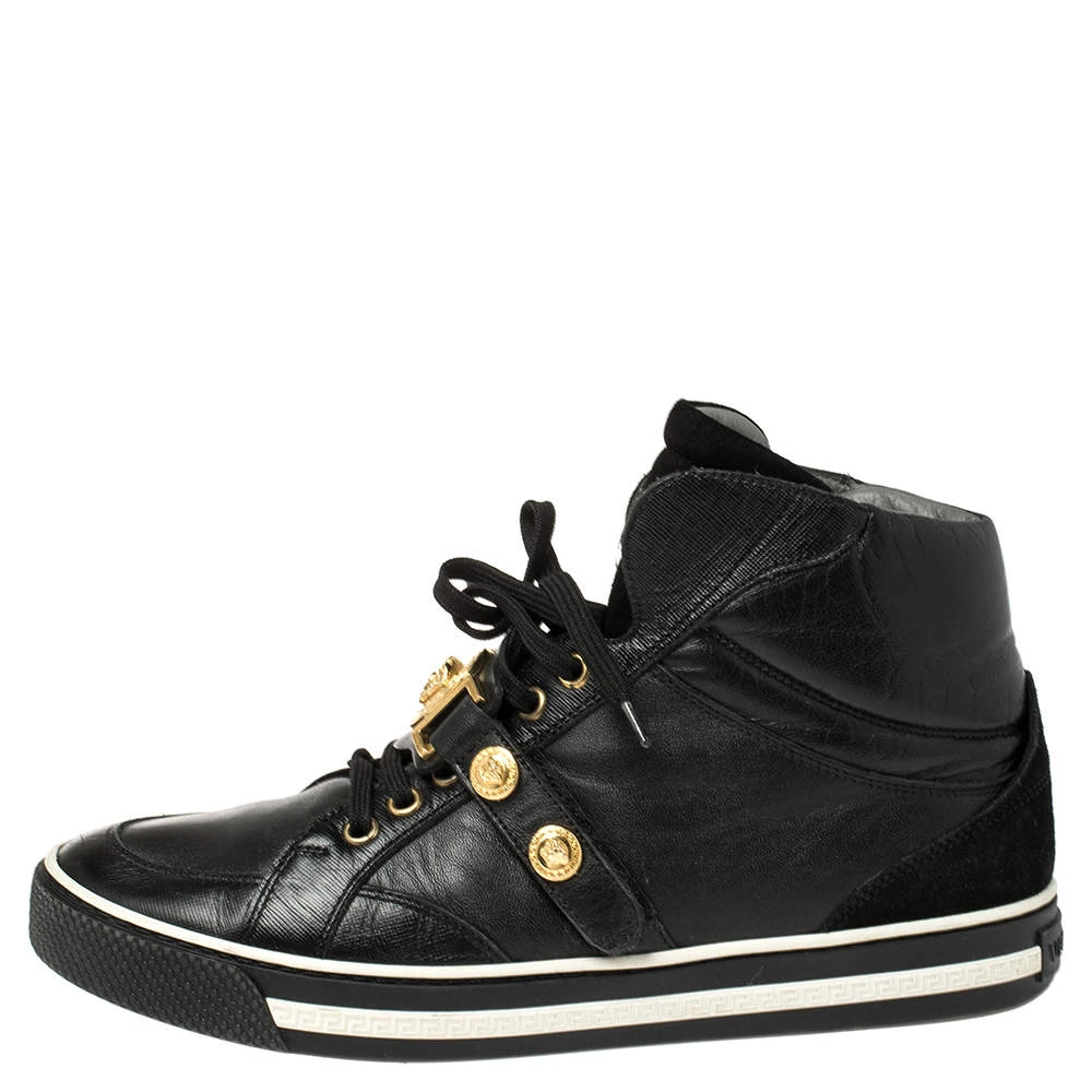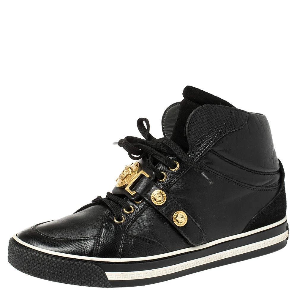 Brimming with fabulous details, these Versace sneakers are crafted from leather and suede into a high-top silhouette and feature round toes and the signature Medusa logo detailing, and lace-ups on the vamps. Comfortable insoles and a trendy appeal make these sneakers a must-buy.