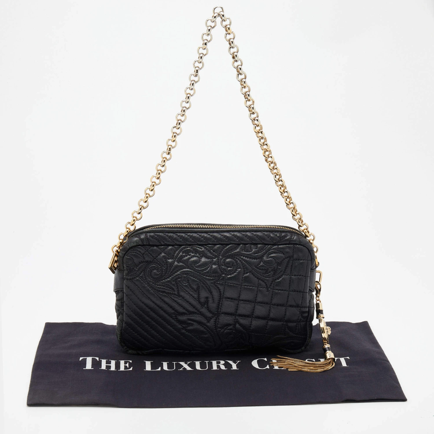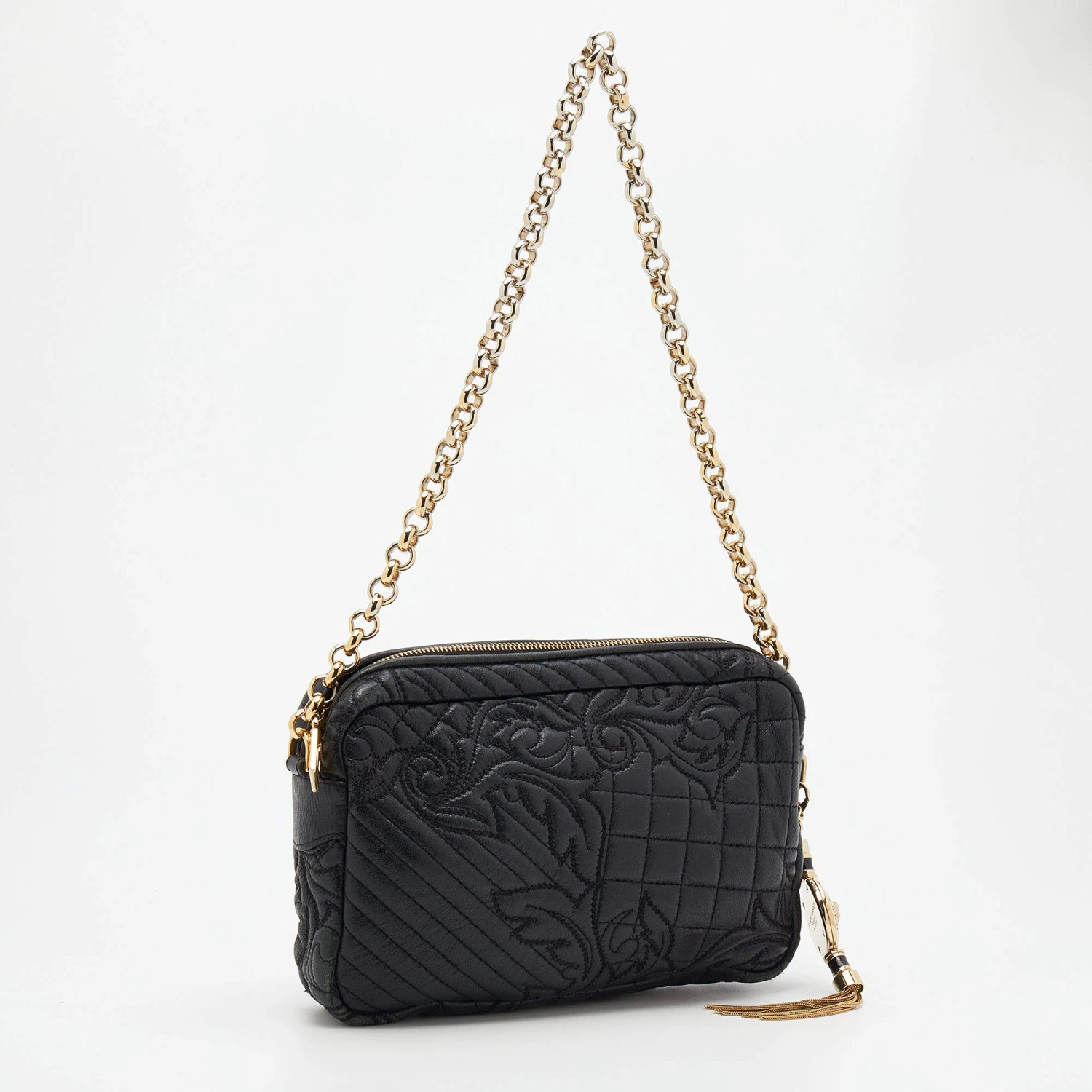 How gorgeous is this bag from Versace! Crafted from black leather and gold-tone hardware, it carries an outstanding design. It has a fabric interior secured by a zipper, and it is held by a chain strap. The tasselled-Medusa charm uplifts its beauty and makes it a buy you will not regret.