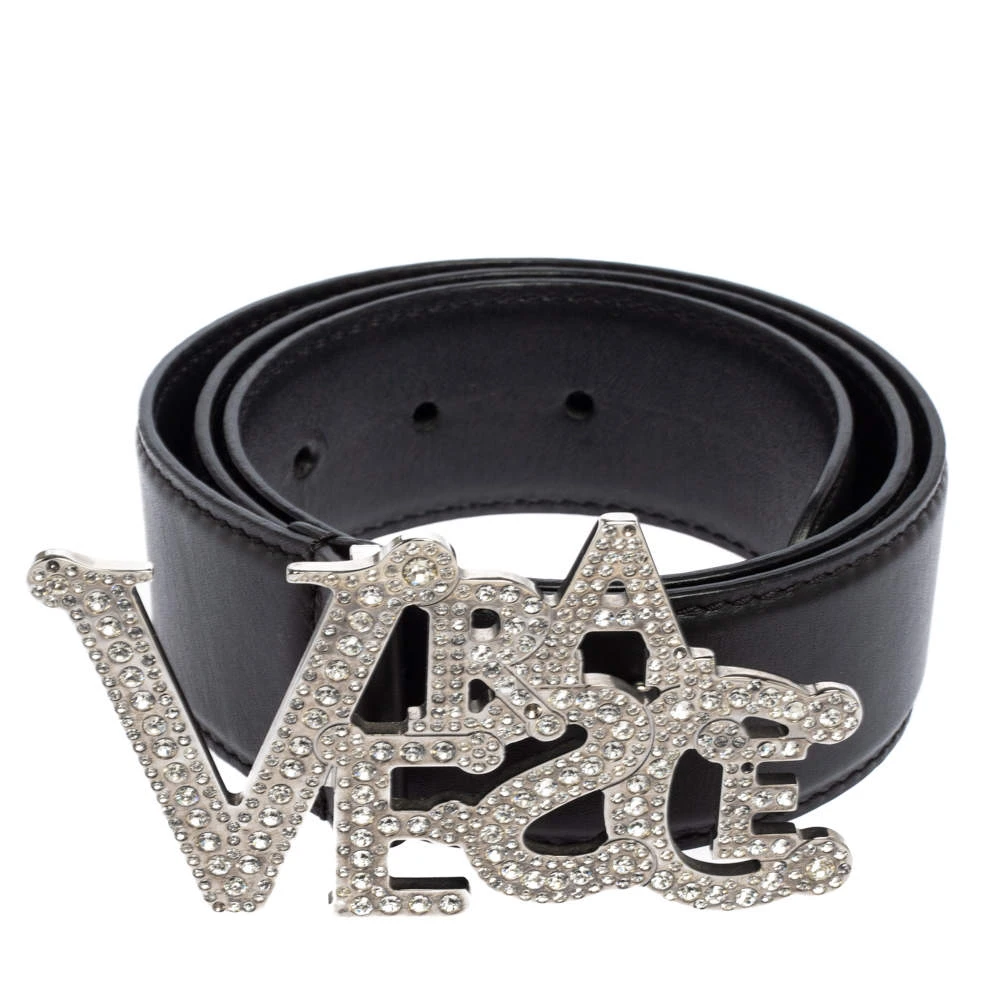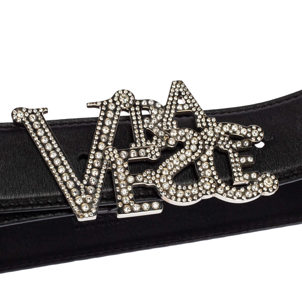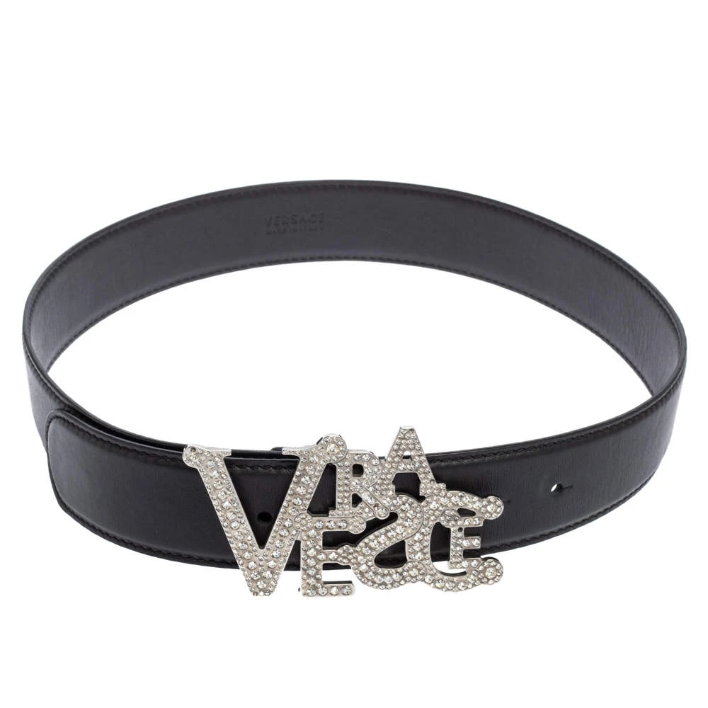 Versace has adorned this black belt with a unique logo buckle embellished with crystals. Crafted from leather in Italy, style your jeans and trousers with this attractive belt.