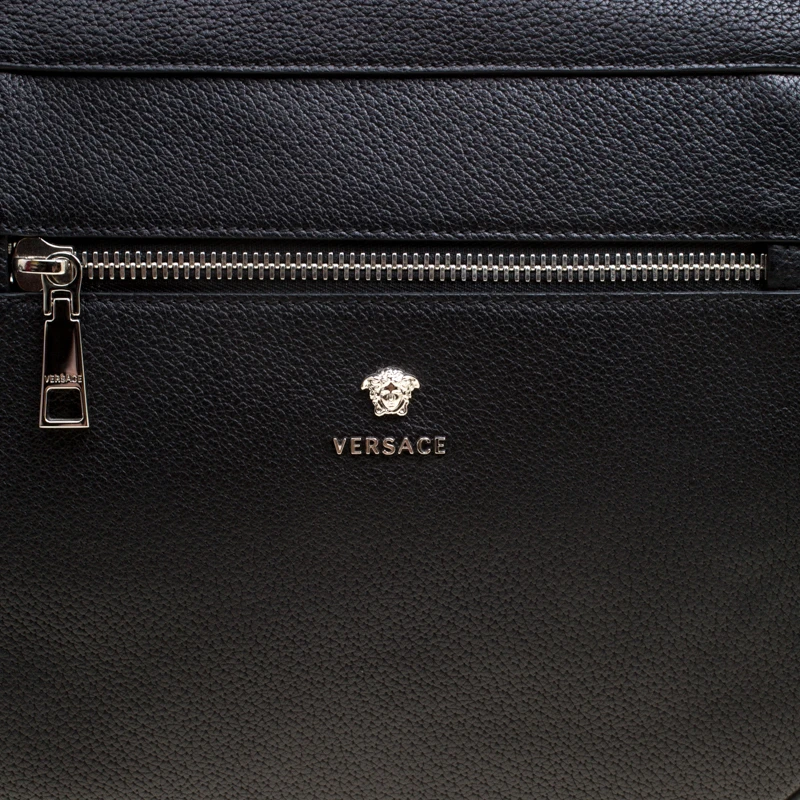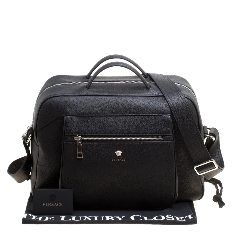 This investment-worthy duffel bag from Versace owns an aura of elegance and subsequently, it transfers the same to its bearer. It is crafted from smooth black leather into a sturdy and durable structure. It features a zipped pocket to the front accented with the silver-tone brand label and the signature Medusa logo. The zip top leads to an interior that has a fabric lining and features a zip pocket. It is complete with two top handles that can be handheld to flaunt this beauty in contemporary fashion along with a shoulder strap for times when you want to march freely. Lay your hands on this chic creation today and travel in style.
