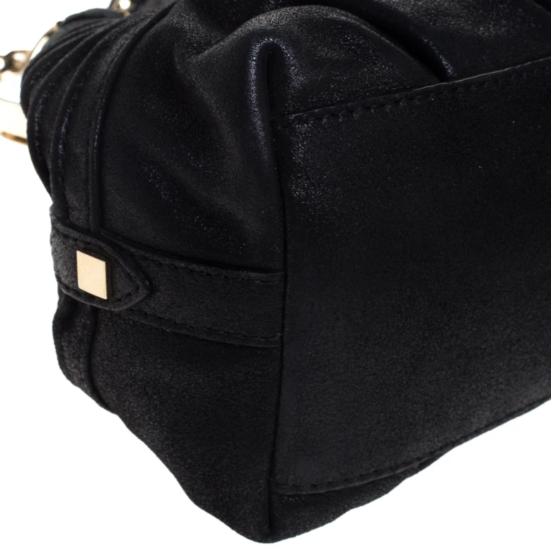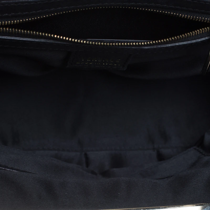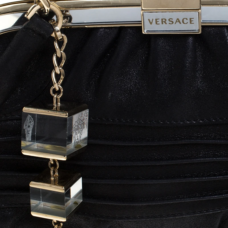 Featuring a textured exterior, this Versace satchel exudes just the right amount of luxury and style. Crafted from leather in Italy, this piece has a gold-tone framed top and an interesting charm dangling at the front. It features dual top handles and a fabric-lined interior that houses a zip pocket. Its unique shape lends it a vintage touch.