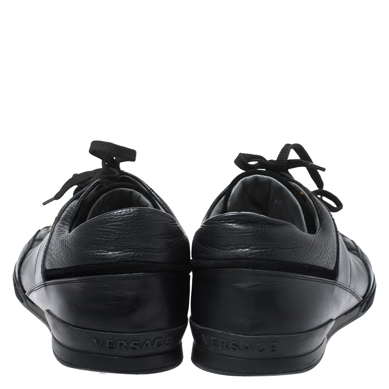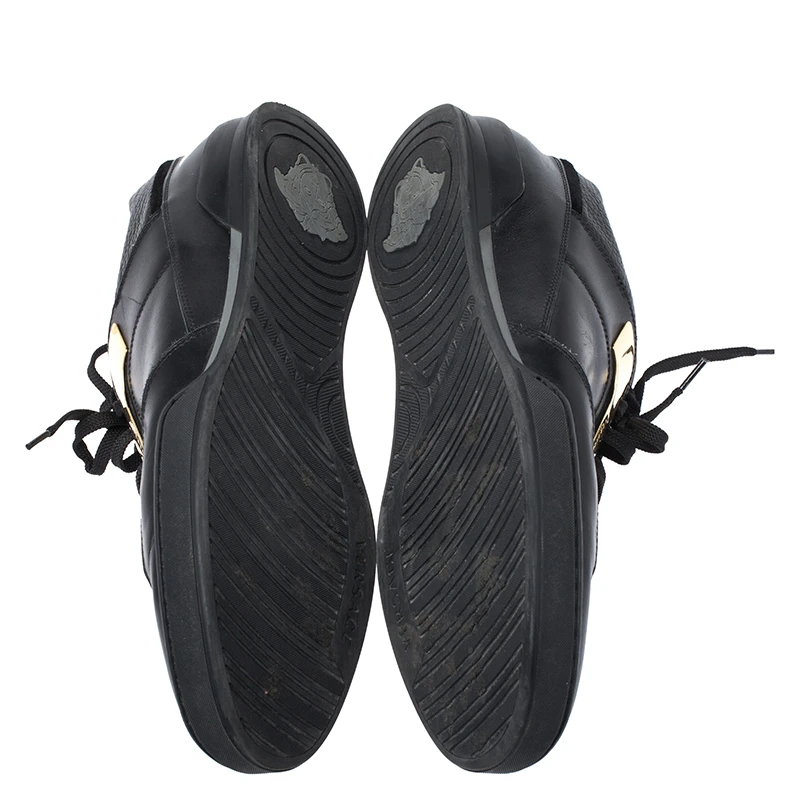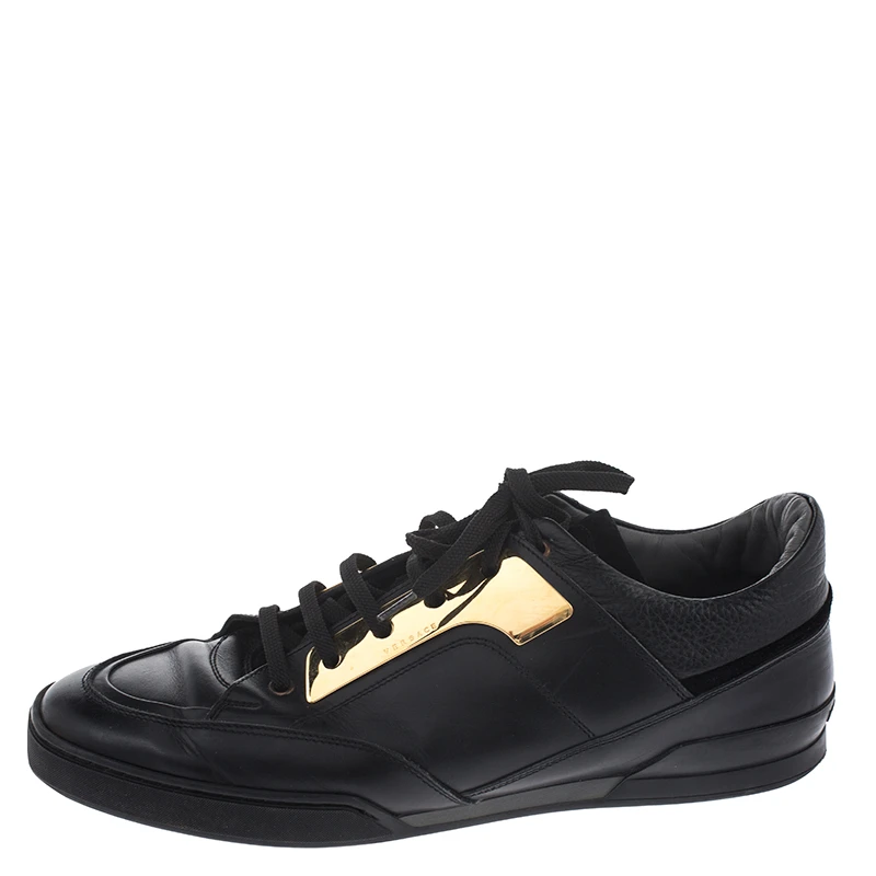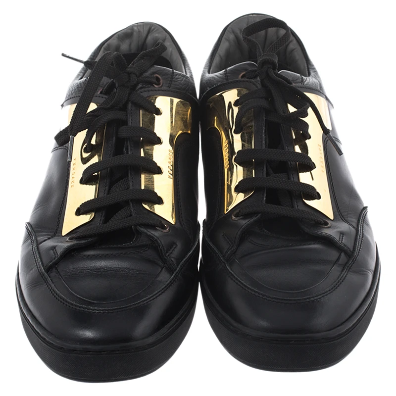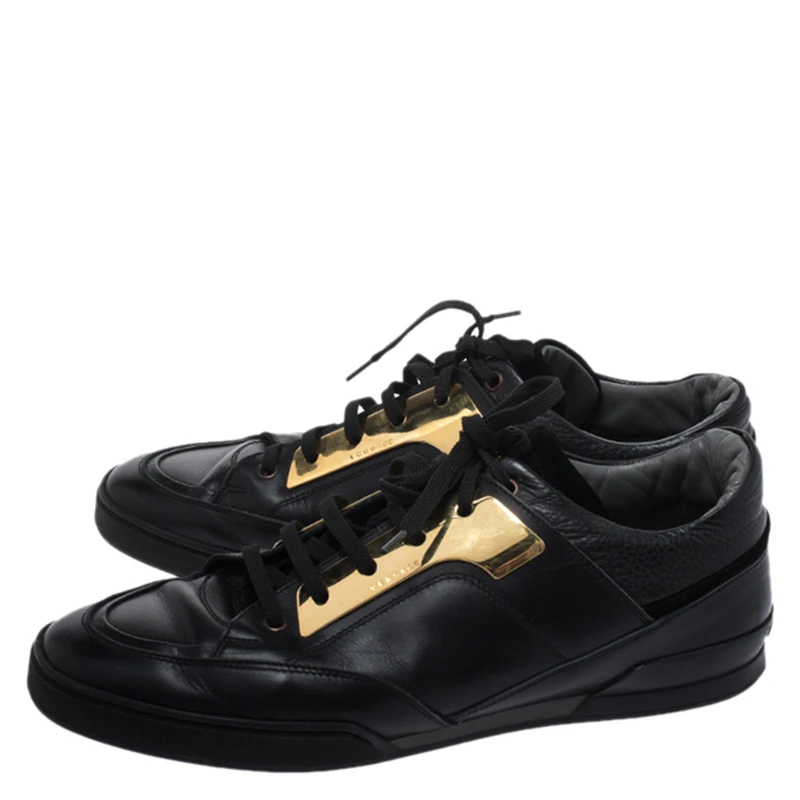 This unique pair of Versace sneakers is all you need to look smart and stylish. They are crafted from black leather in a low top silhouette with gold-tone plates as well as lace-ups on the vamps. The rubber sole on these sneakers ensures durability.