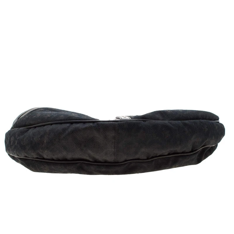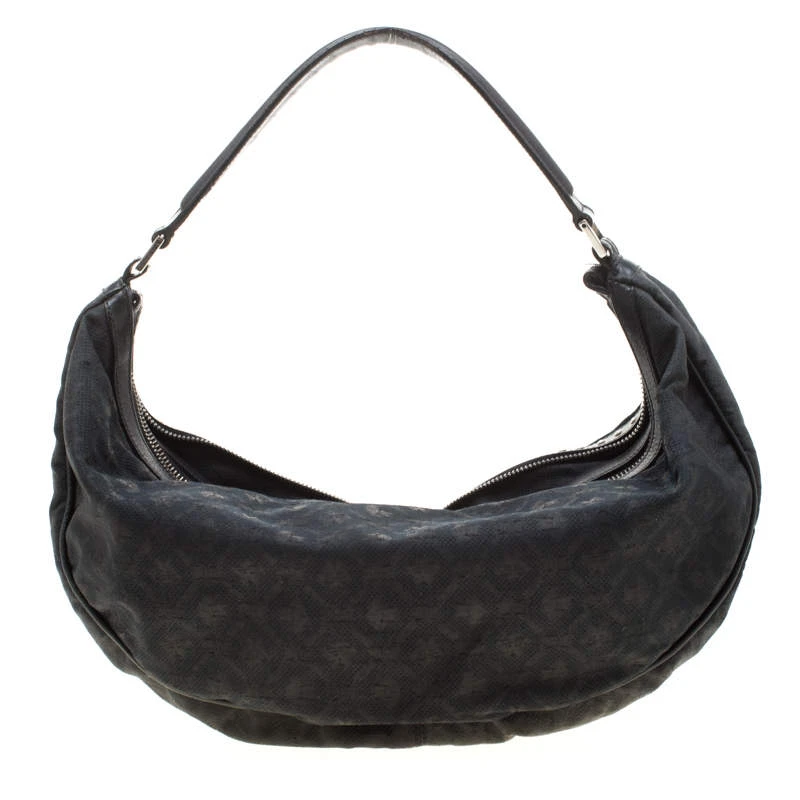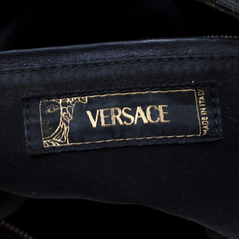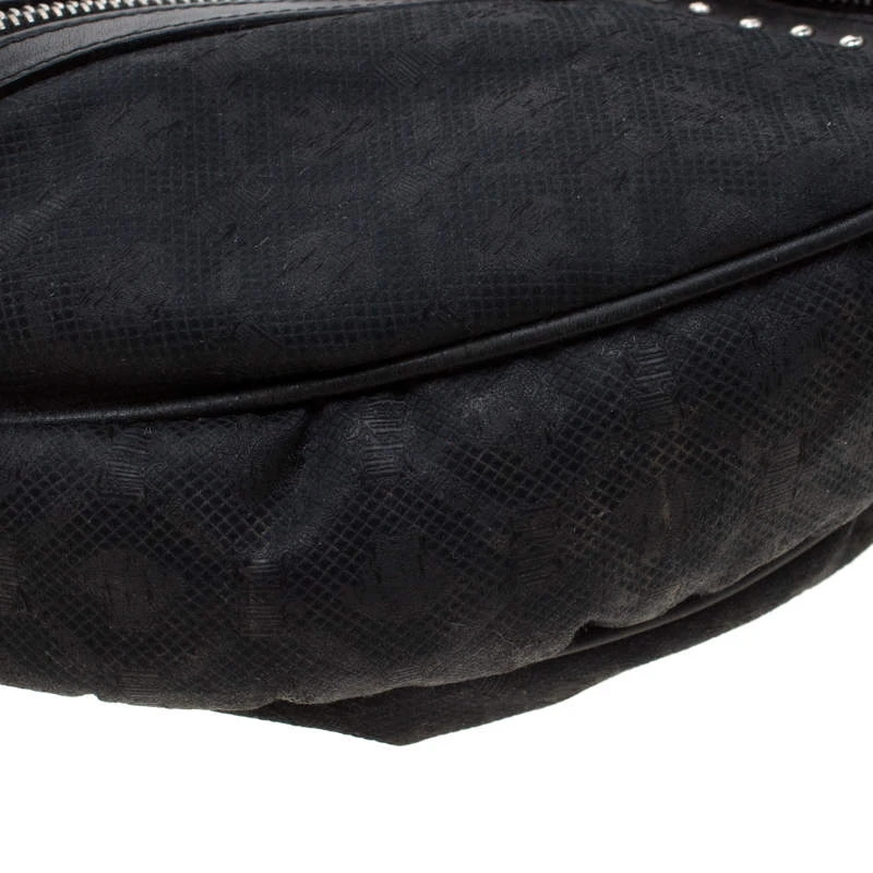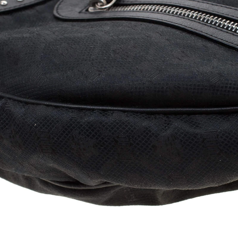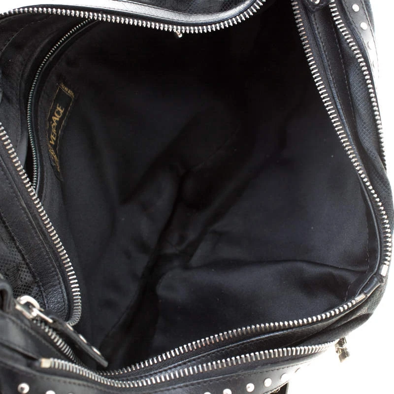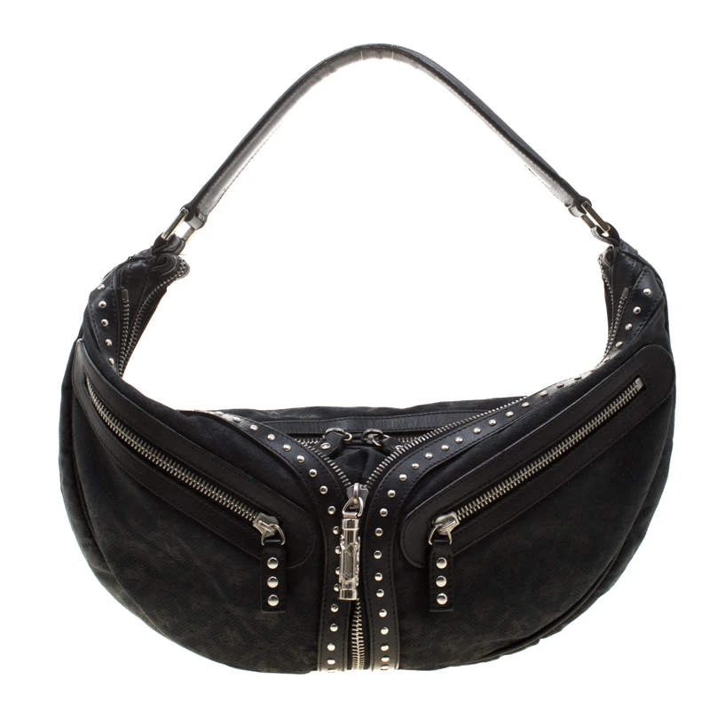 This black hobo by Versace is just what you need to create an edgy, chic look. Made from printed canvas and leather trim, it is detailed with silver-tone studs and multiple zippers and pockets to create the bold look. The interior is lined with black satin and features a zip pocket.