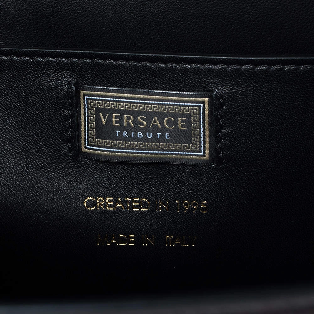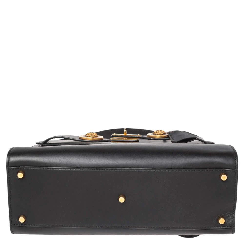 Make a striking appearance with this fashionable bag by Versace. This elegant creation is at once a fashion statement as well as a rational necessity. It is crafted from leather and is adorned with gold-tone signature Medusa motifs and a turn lock. Lined with leather, it has a spacious interior where you can stow your basics. This pretty piece is complete with a top handle and a strap.