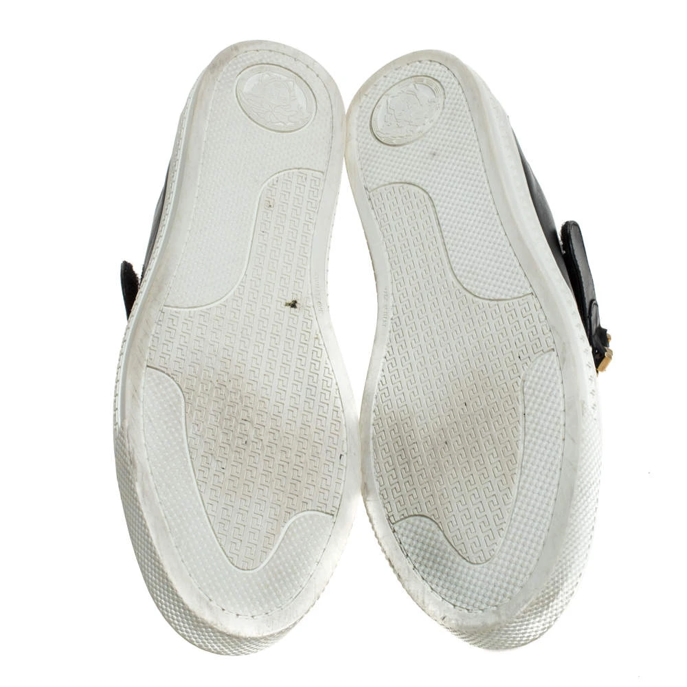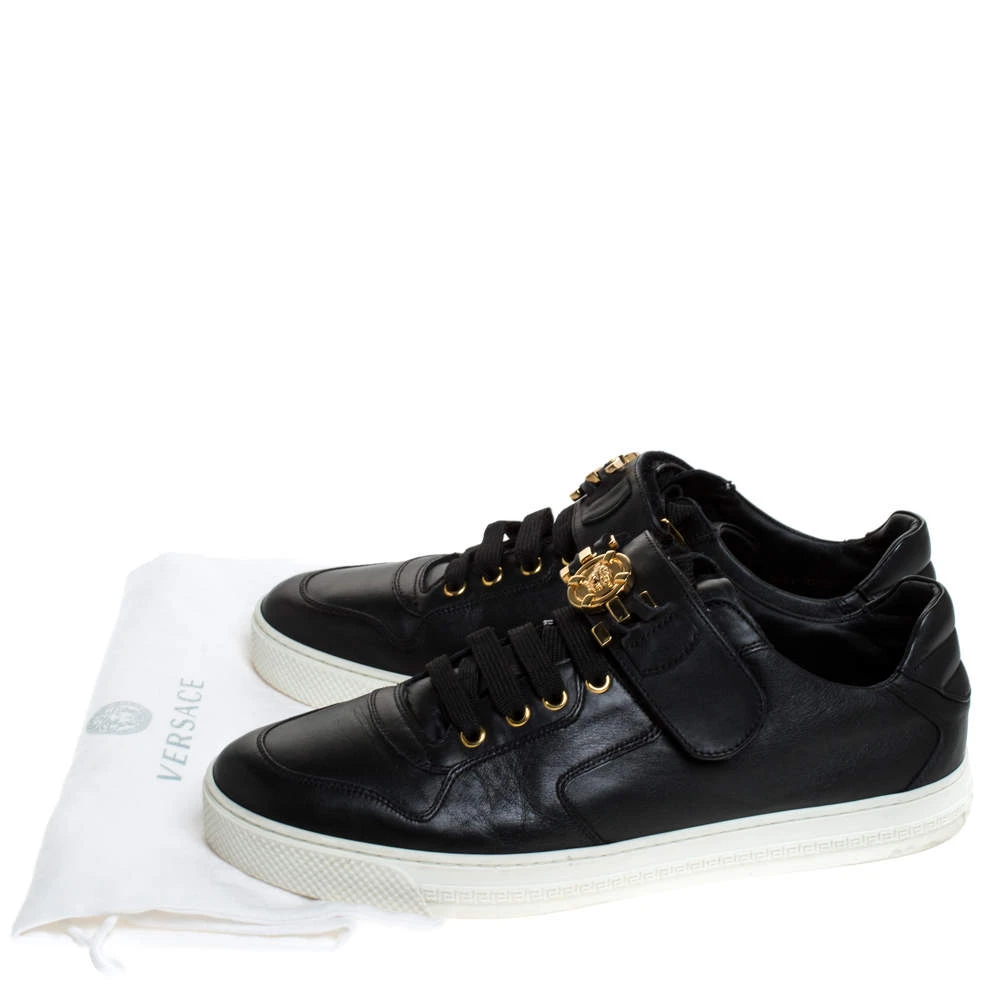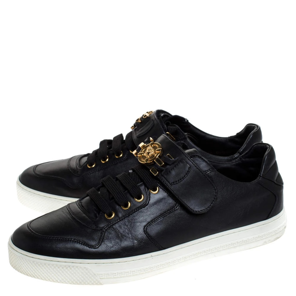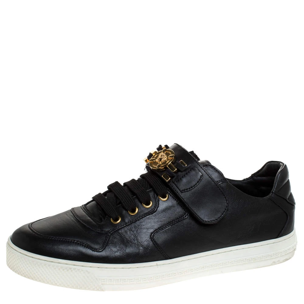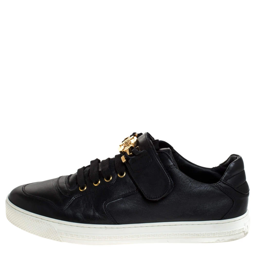 These leather sneakers are the epitome of versatility, meant to lend a luxe twist to your outfit. Looking fashionable in your casuals is as easy as slipping in these gorgeous black sneakers. Designed by Versace, they feature the Medusa detail, lace-up vamps and velcro straps.