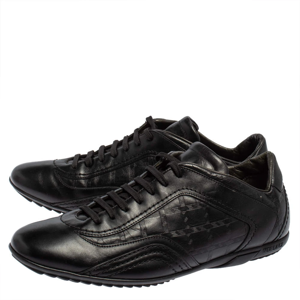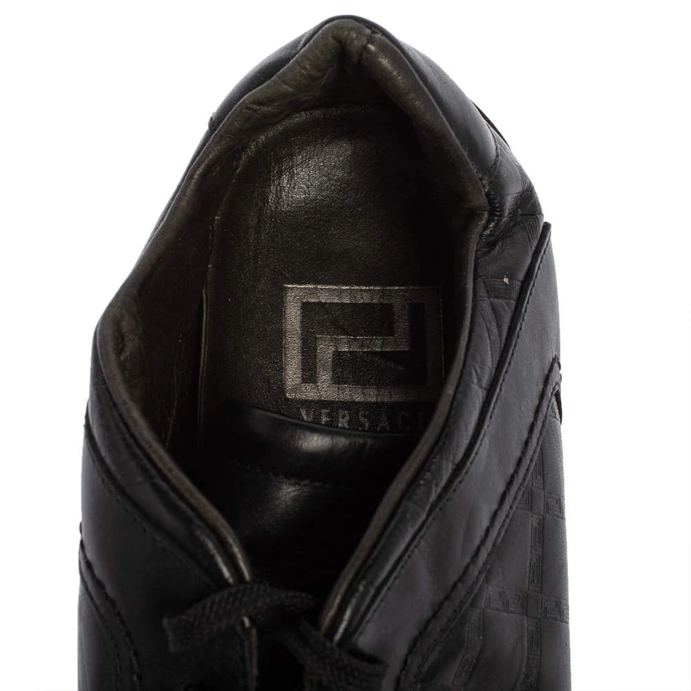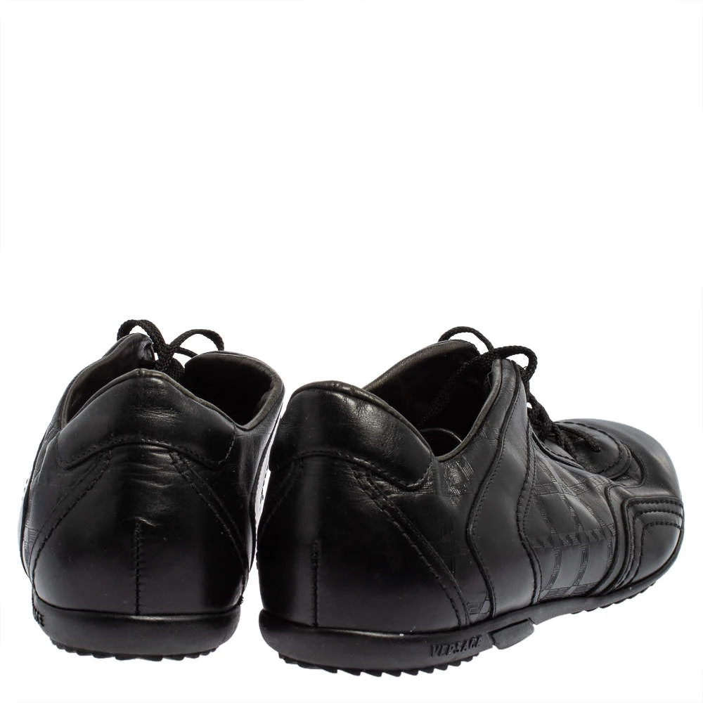 Minimal yet stylish, these low-top sneakers from Versace are worthy of being worn by you! They have been crafted from black leather and styled with round toes, the signature Greek Key embossings on the sides, and lace-ups on the vamps. They are complete with comfortable leather-lined insoles and tough rubber soles.