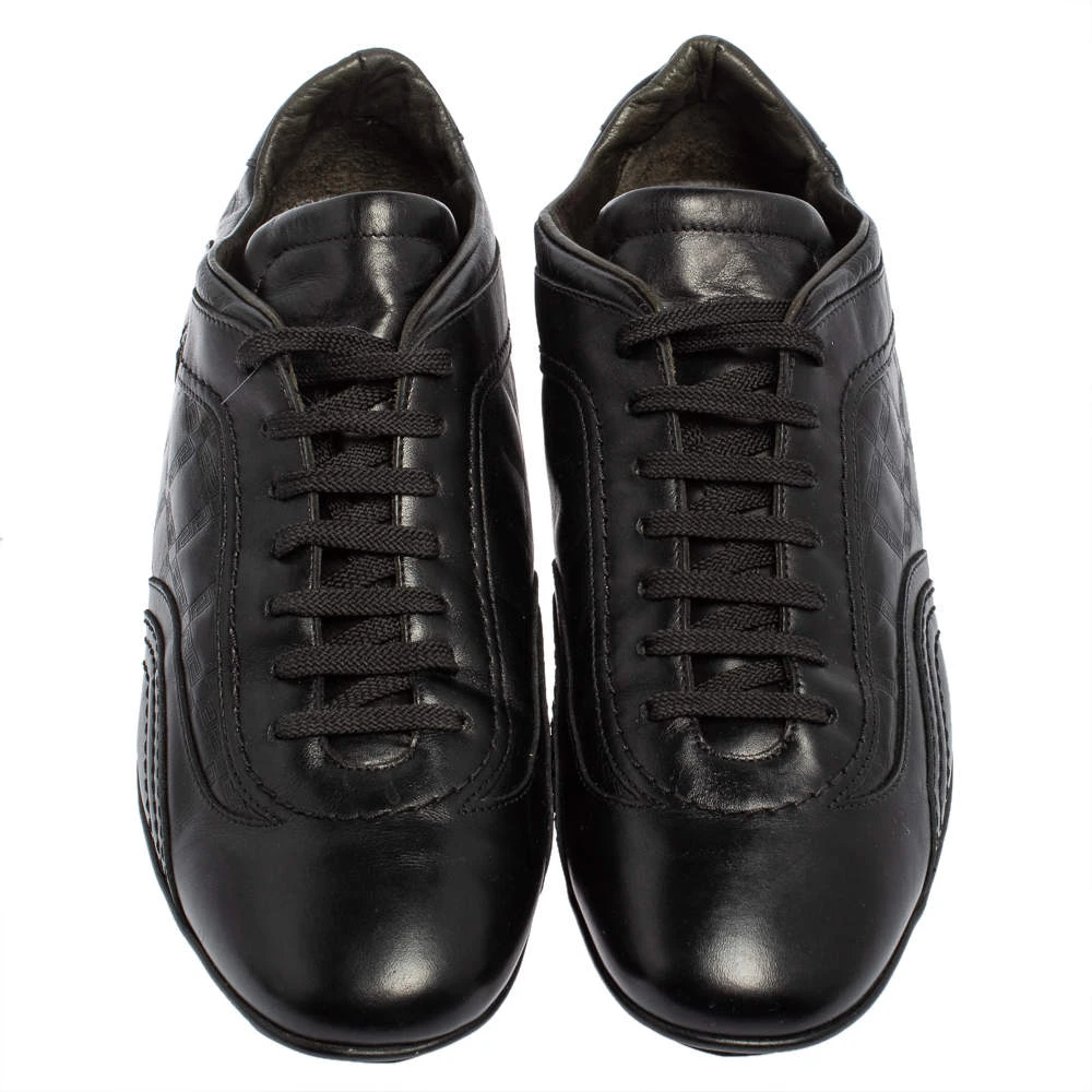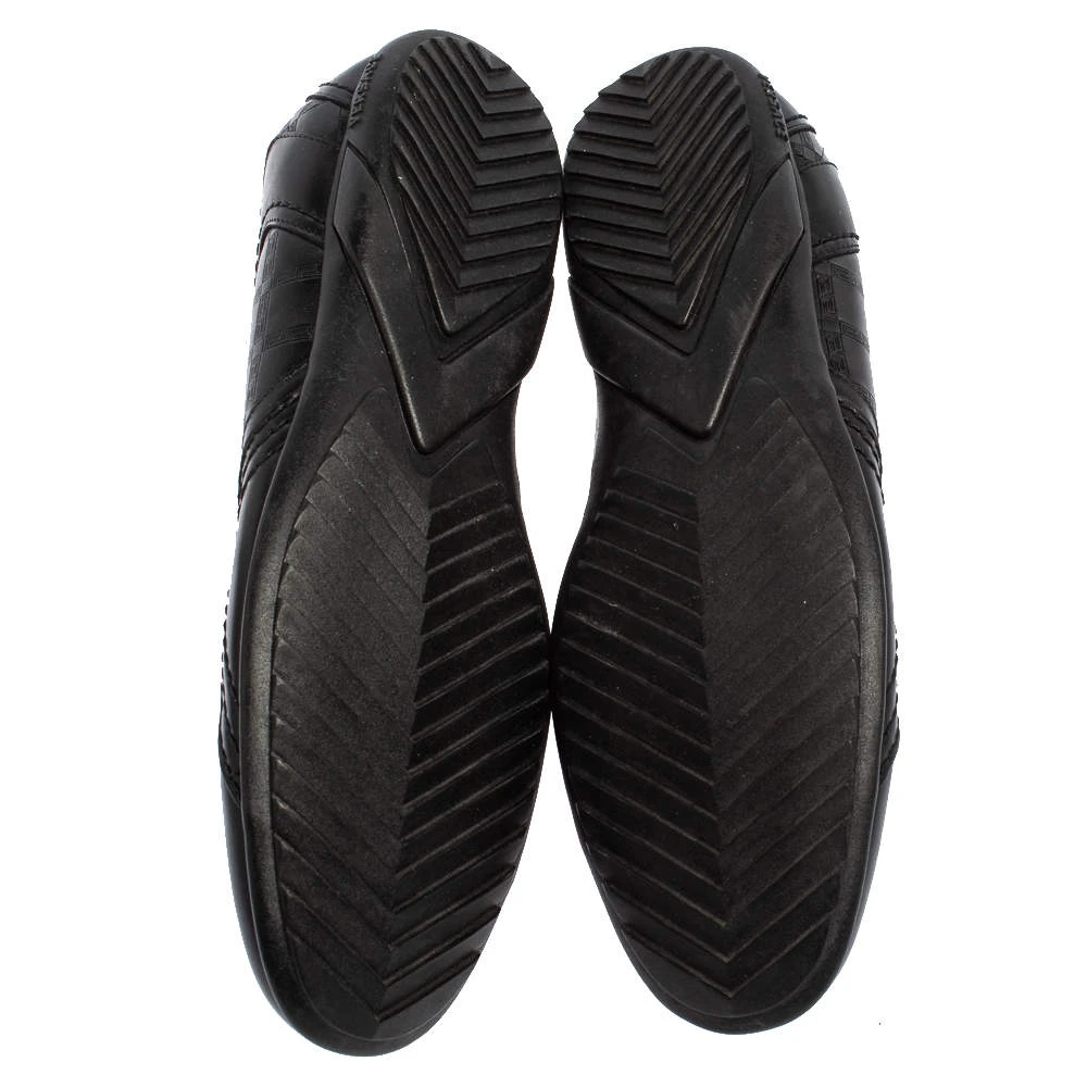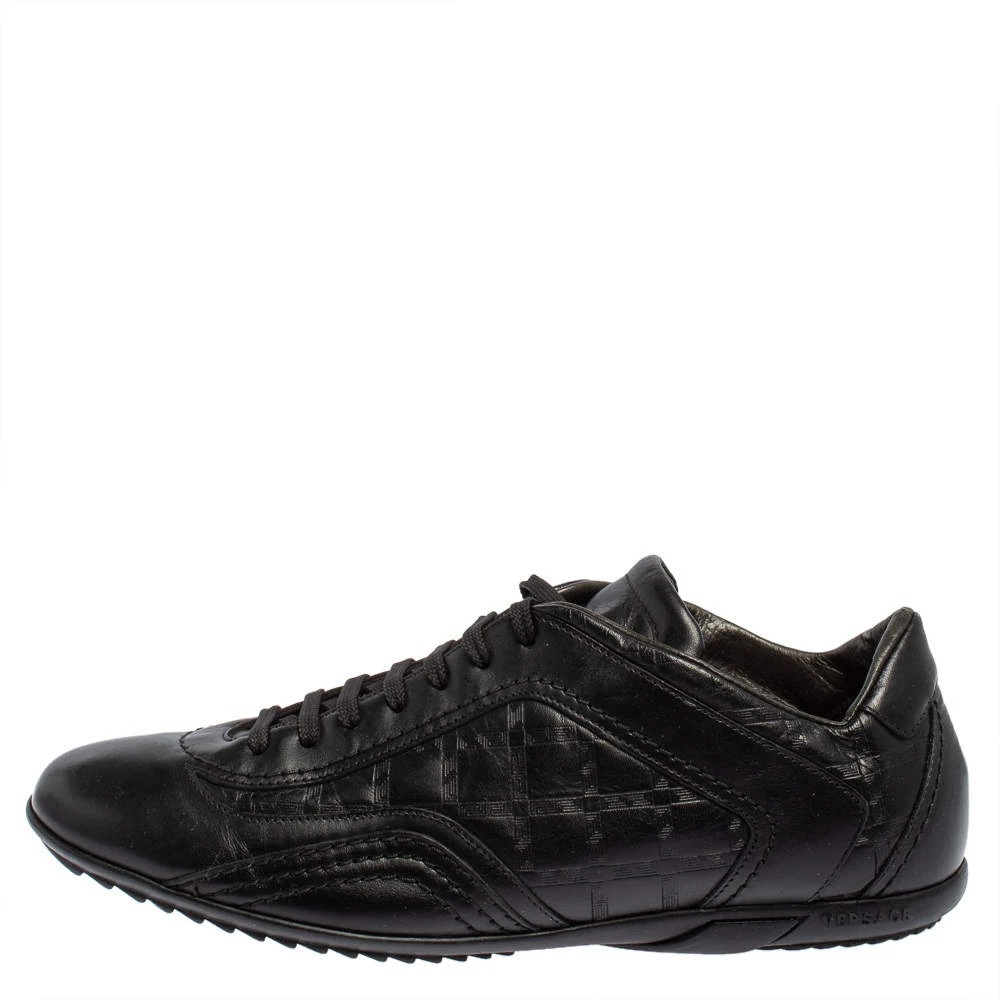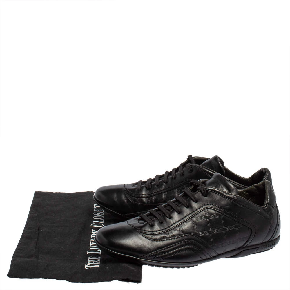 Minimal yet stylish, these low-top sneakers from Versace are worthy of being worn by you! They have been crafted from black leather and styled with round toes, the signature Greek Key embossings on the sides, and lace-ups on the vamps. They are complete with comfortable leather-lined insoles and tough rubber soles.