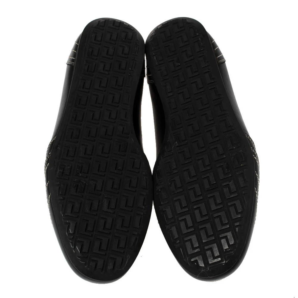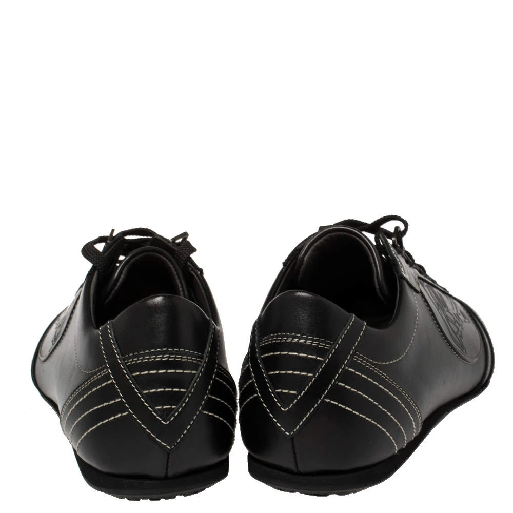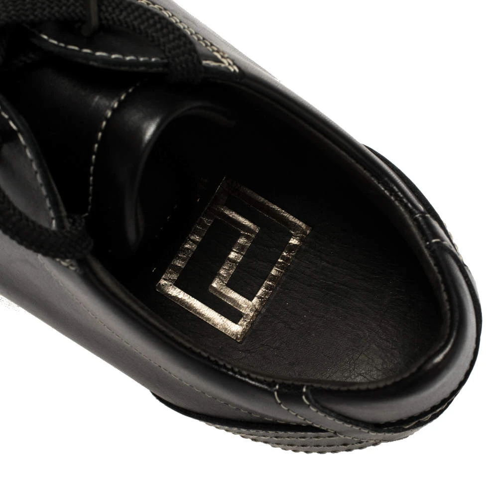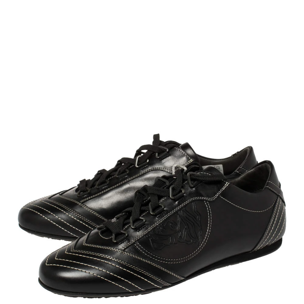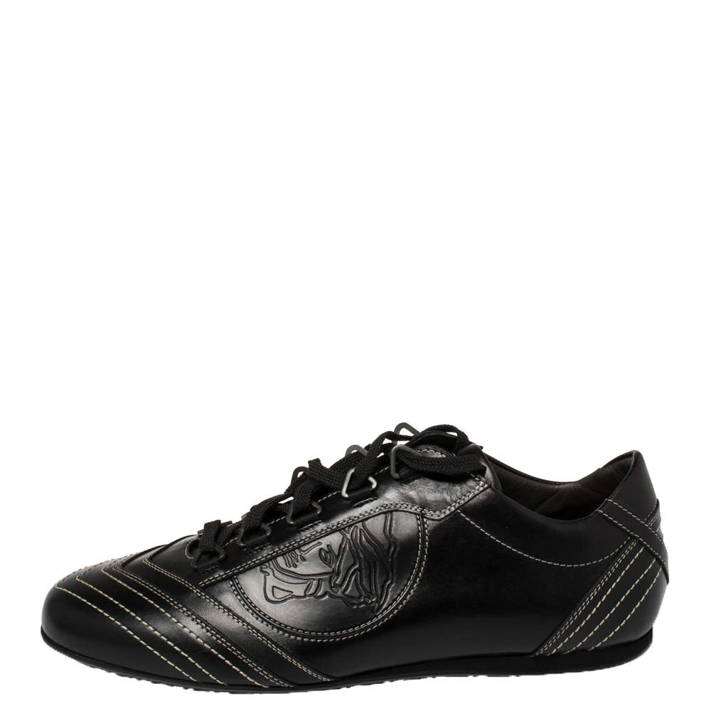 Elevate your style quotient with these trendy and chic sneakers from Versace! These low-top sneakers are crafted from black leather and styled with round toes, contrasting stitches, lace-ups on the vamps, and the signature Medusa logo detailing on the sides. They are complete with leather-lined comfortable insoles and durable rubber soles.