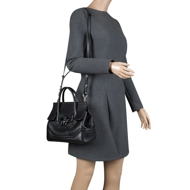 This Pallazo Empire tote from Versace is a fabulous piece. The bag comes in a luxurious black exterior made from leather and designed with their signature Medusa motif on the flap that reveals a spacious canvas interior. It features dual top handles, a removable shoulder strap and protective feet at the bottom. High on appeal and effortlessly stylish, this tote deserves to be in your arms.