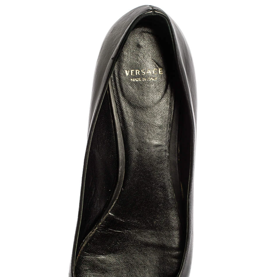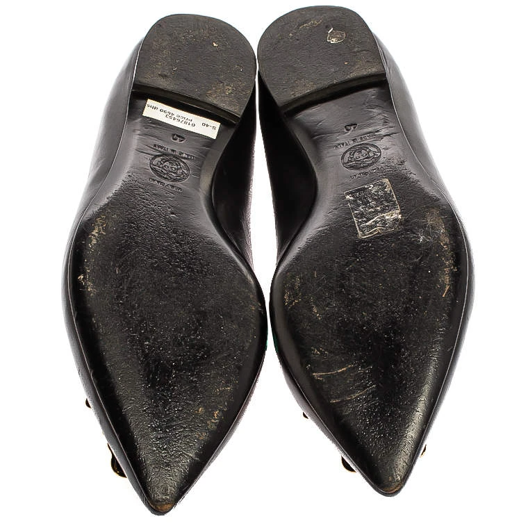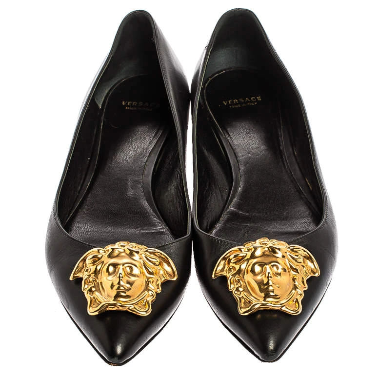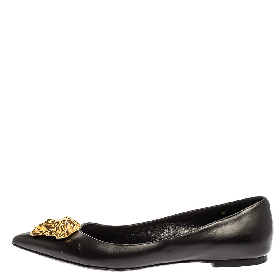 This pair of Versace ballet flats are a style statement with a timeless design. Crafted from black leather, they feature pointed toes accented with the iconic Medusa motif in gold-tone metal and leather soles. They bring a touch of glamour to every outfit they are paired with.