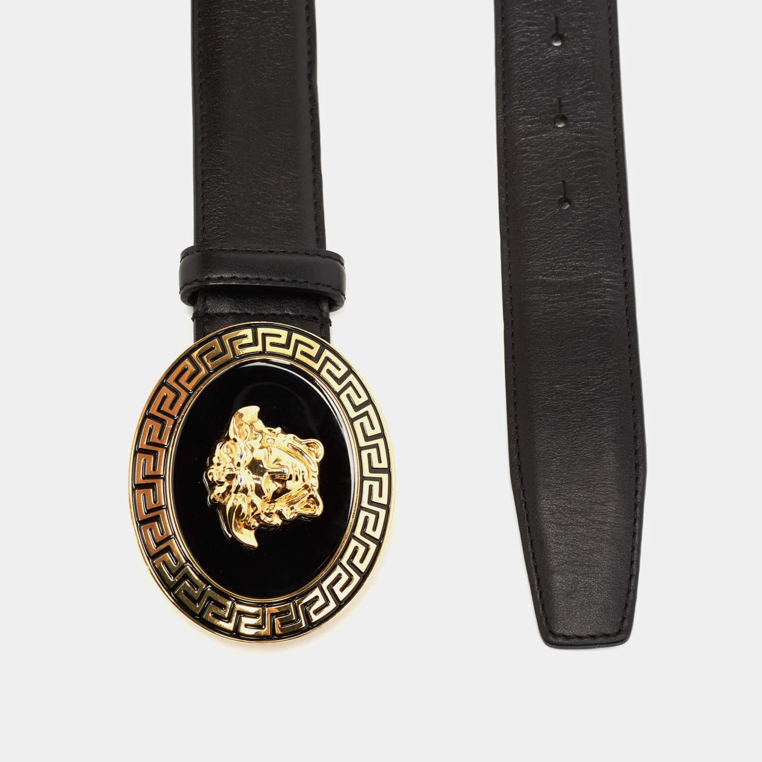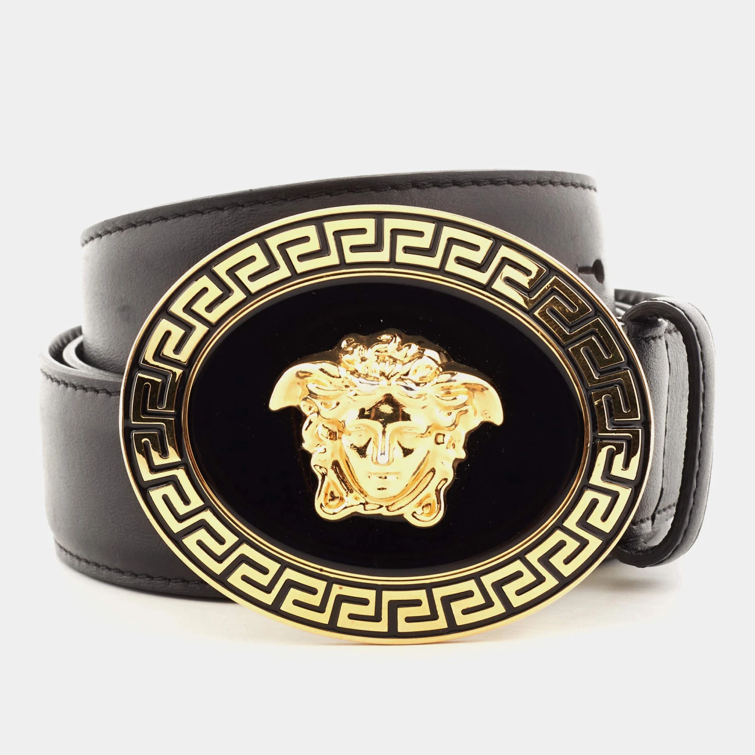 Accessorise right with this belt from Versace. It is made from classic black leather and has a sleek design with a gold-tone metal Medusa buckle at the front.