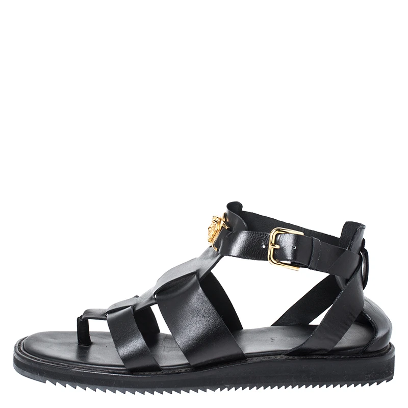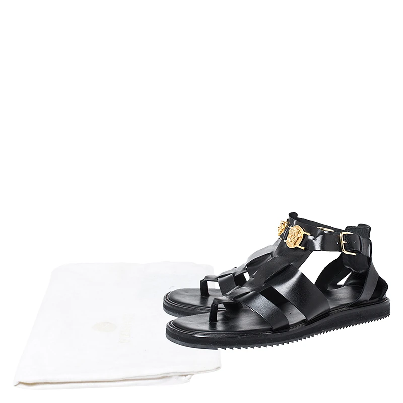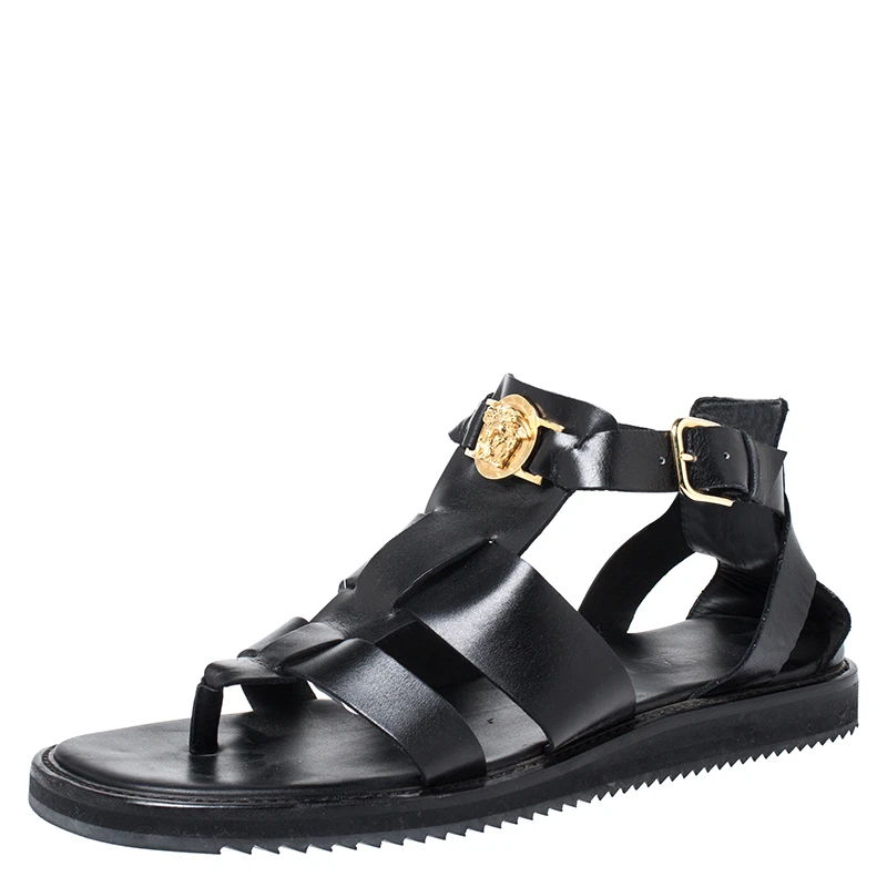 Versace Black Leather Medusa Gladiator Flat Sandals Size 43 For Men
