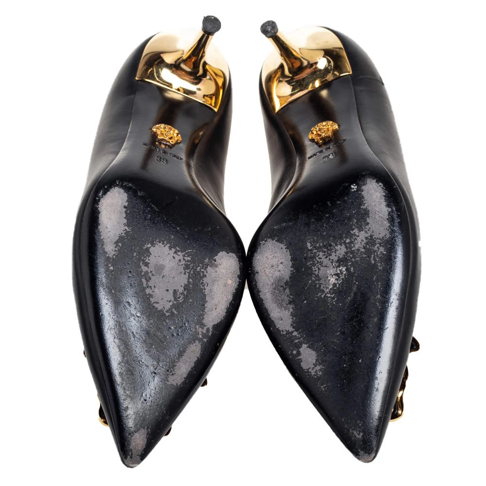 Bring signature charm and skill to your feet with these beautiful pumps from the House of Versace. They are decorated with a gold-tone Medusa Head motif on the black leather exterior. They showcase pointed toes, a slip-on style, and 6 cm heels. Pair them with your attire for a classy touch.