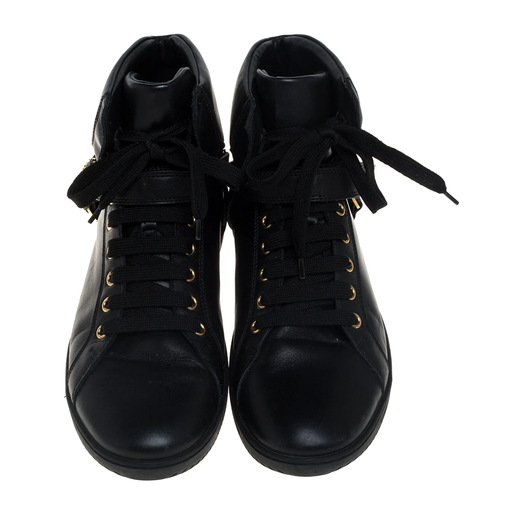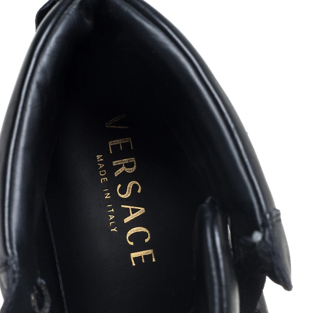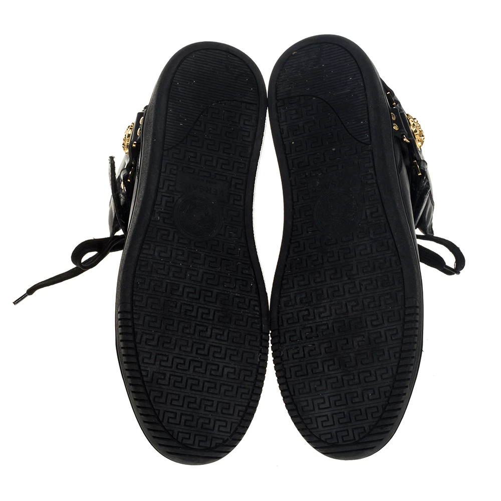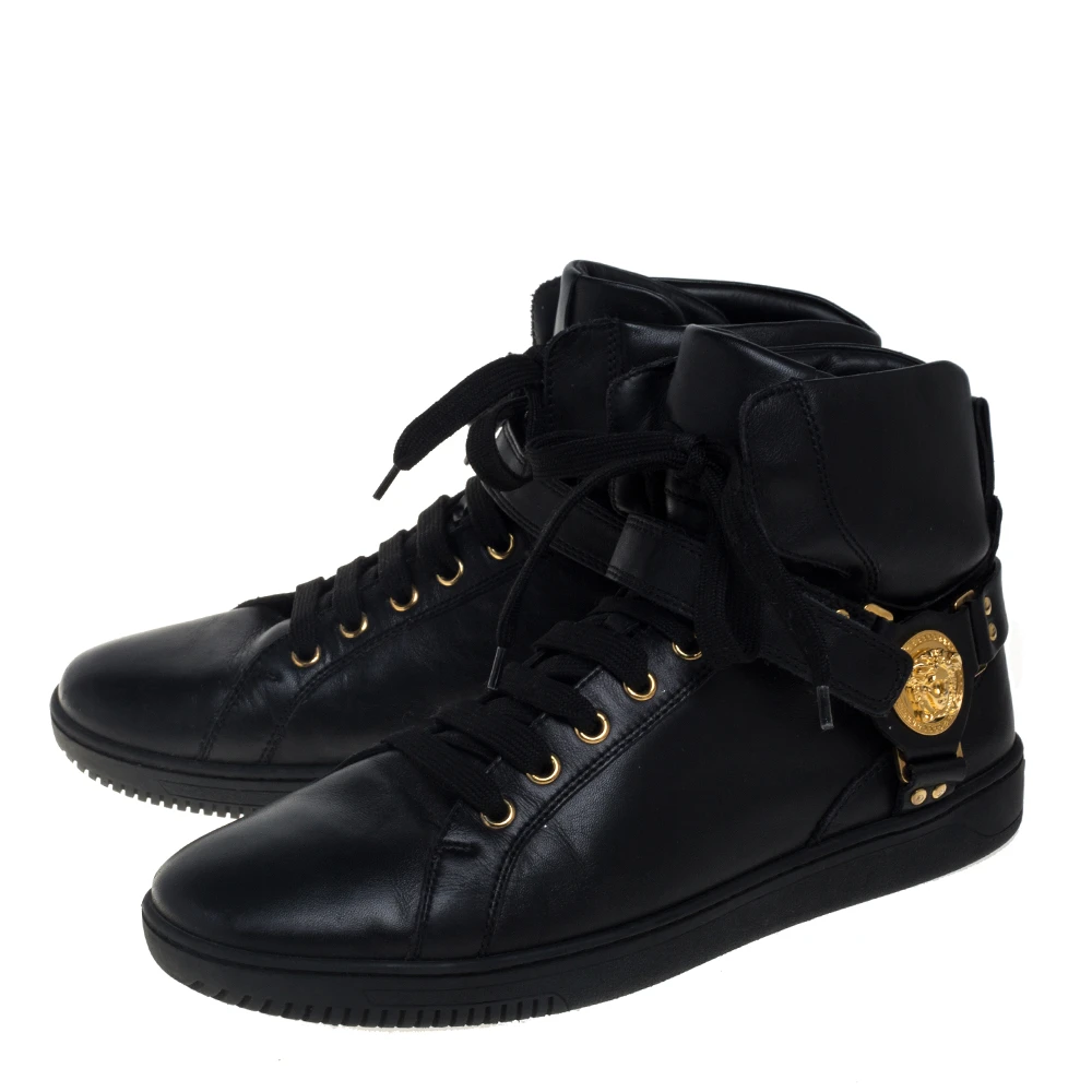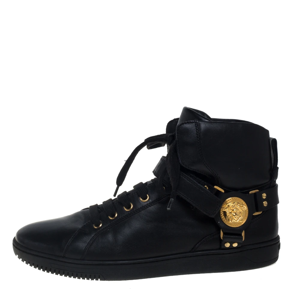 Brimming with luxe details, these Versace sneakers are crafted from leather into a high-top silhouette and feature lace-up vamps, gold-tone hardware, and the Medusa logo. Comfortable soles and a trendy appeal make these sneakers a must-buy.