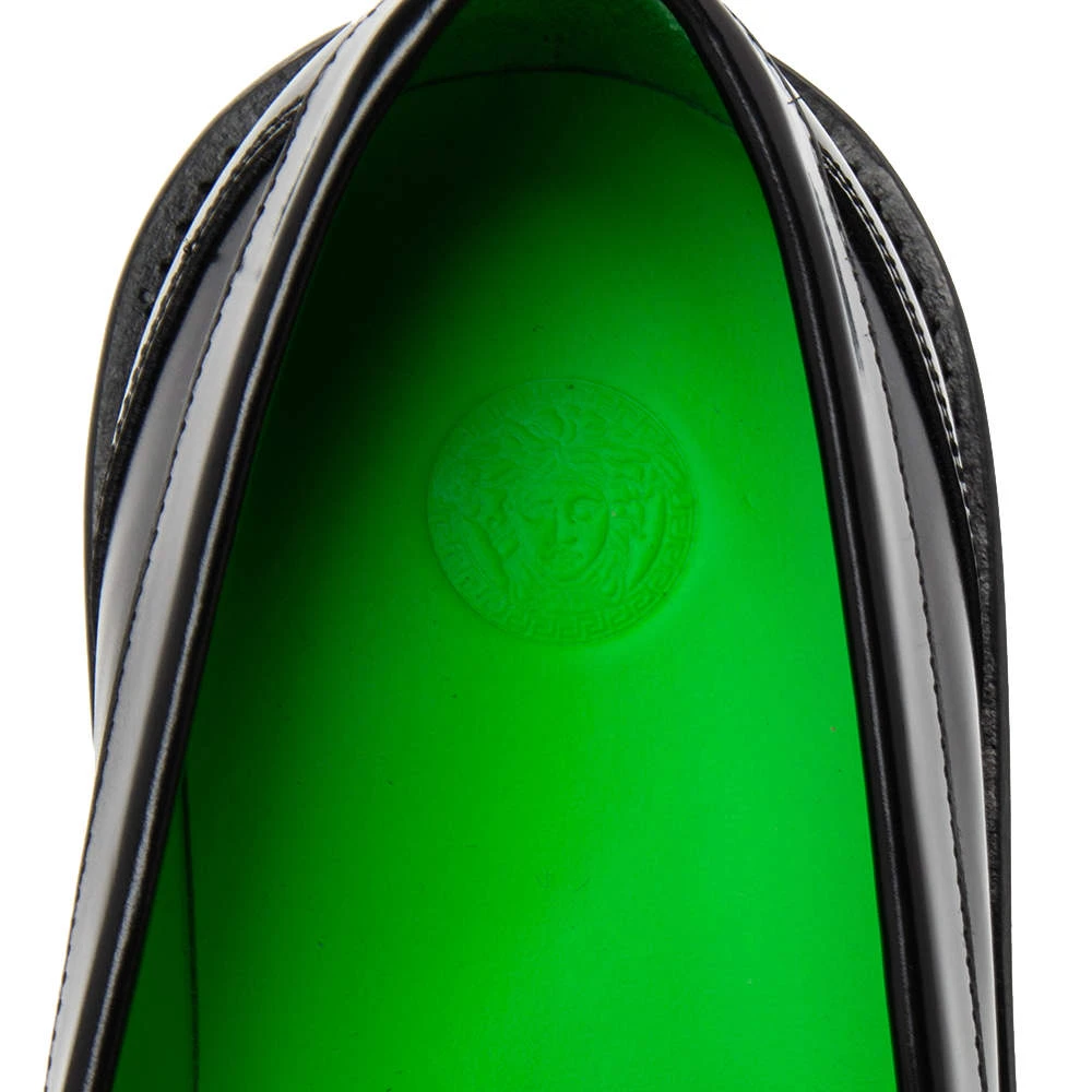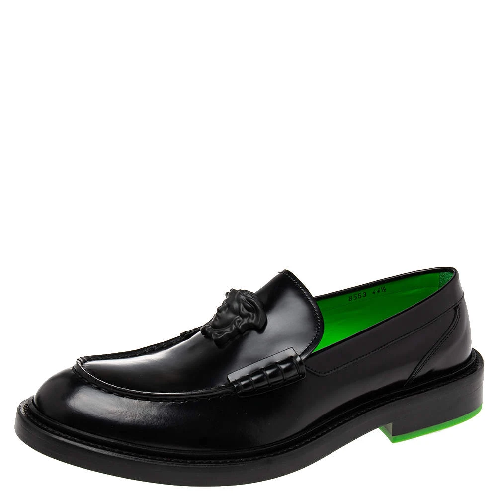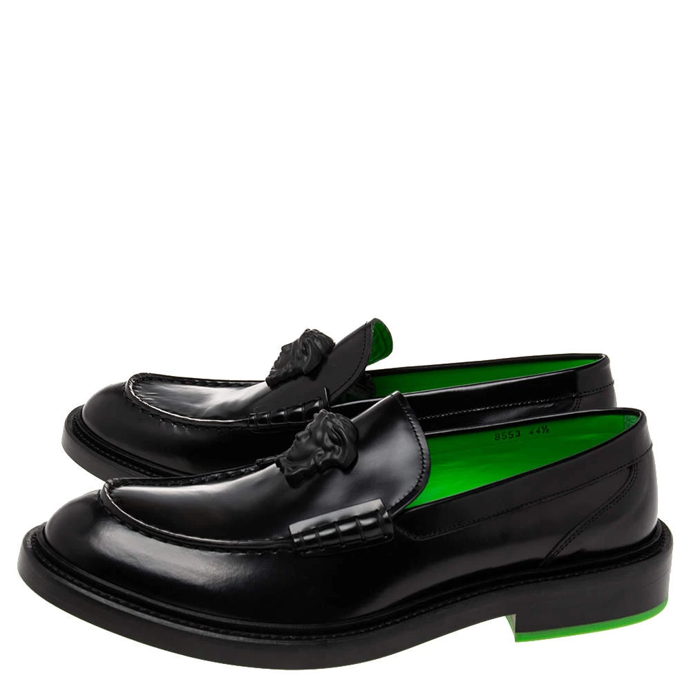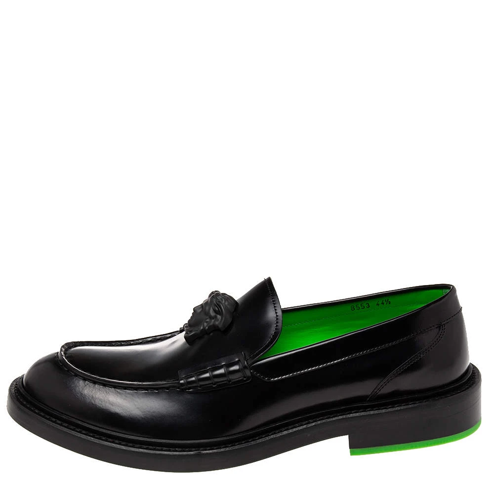Step out of the house with a confident stride and the Versace magic on your feet when you wear these black loafers. Defined by a shiny finish, they feature a signature tonal Medusa head, low heel, round toe, and notched vamp. Lined with leather, the slip-on construction ensures comfort and flexibility in walking.