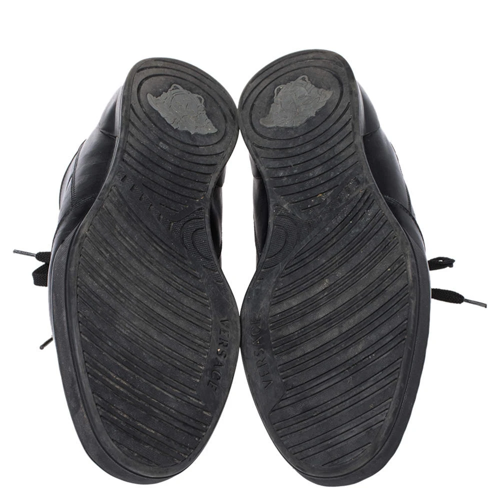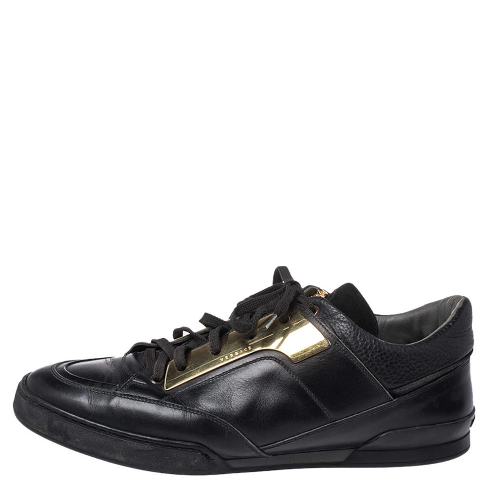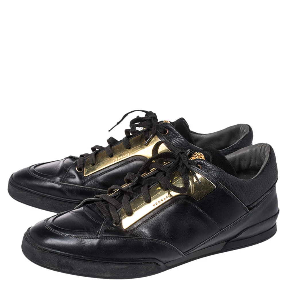 These leather sneakers are the epitome of versatility, meant to lend a luxe twist to your outfit. Looking fashionable in your casuals is as easy as slipping in these gorgeous black sneakers. Designed by Versace, they feature the Medusa detail, lace-up vamps, gold-tone hardware and rubber soles.
