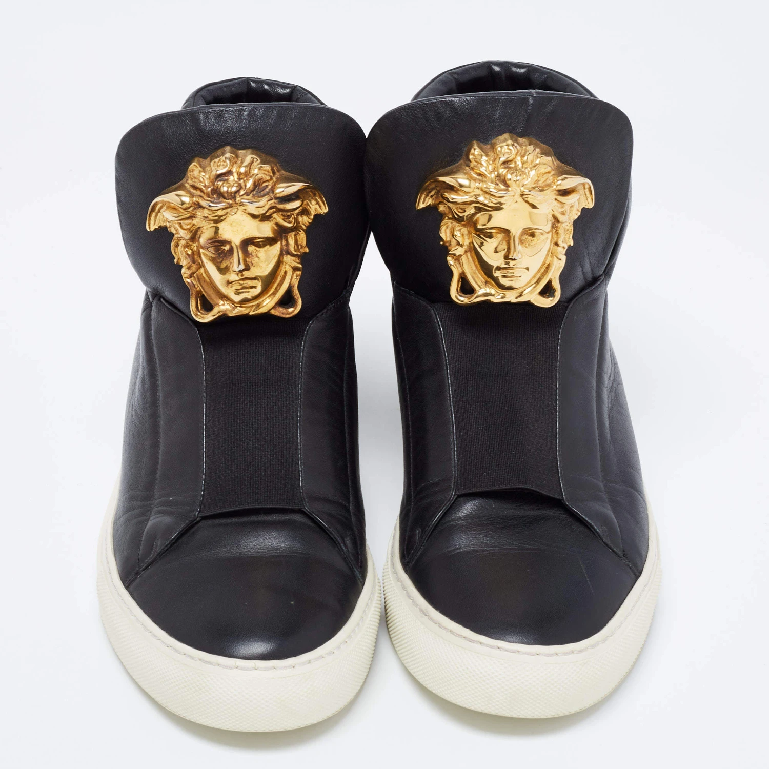 Sneakers are sought-after for reasons like comfort, ease, and casual style. These Versace ones fit right in as they are stylish and snug. They come crafted from black leather into a design of elastic panels and the Medusa logo on the front.