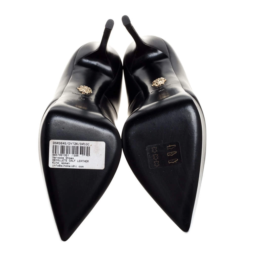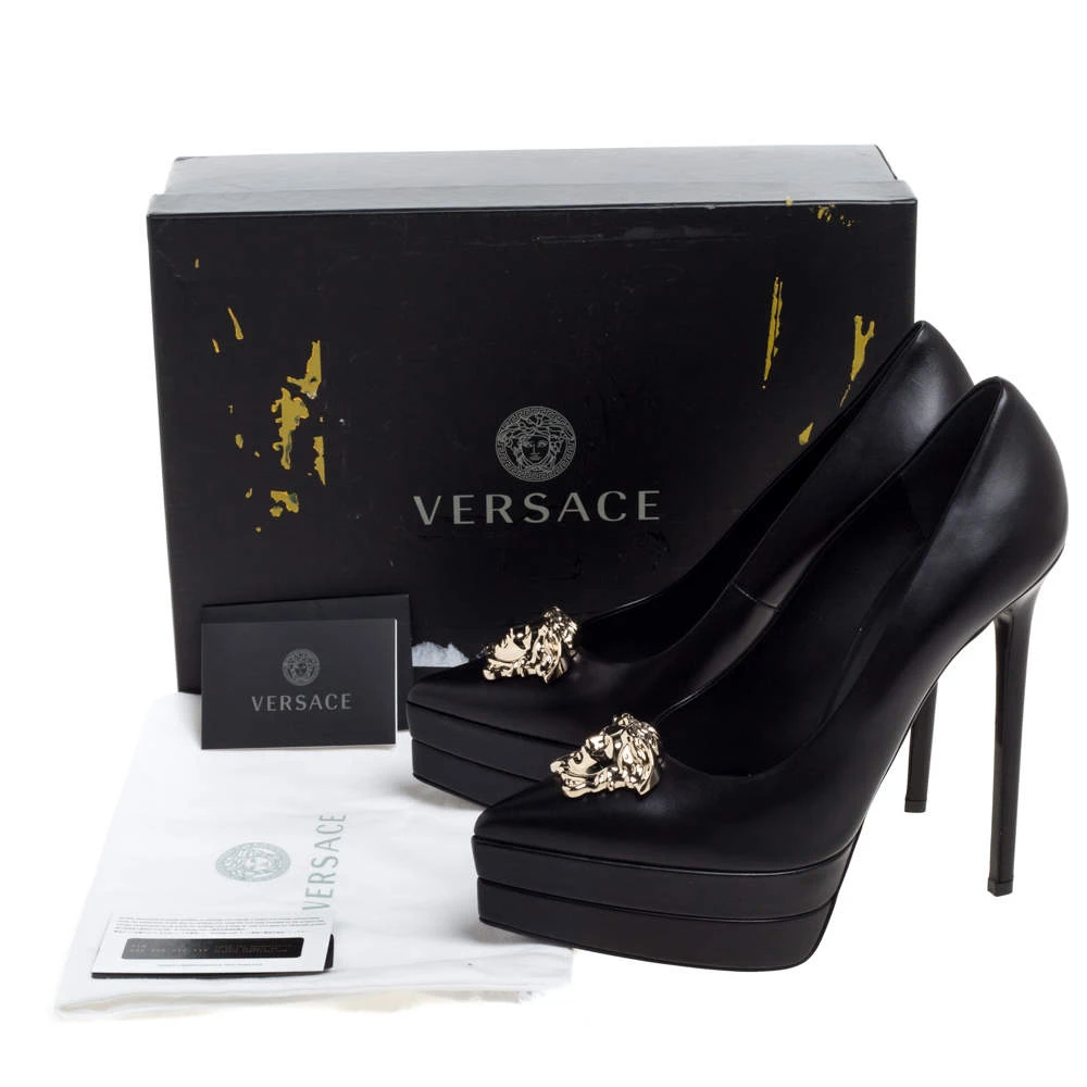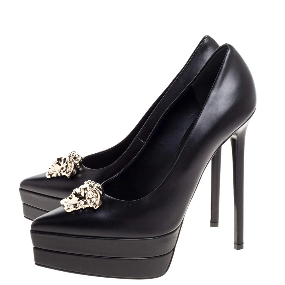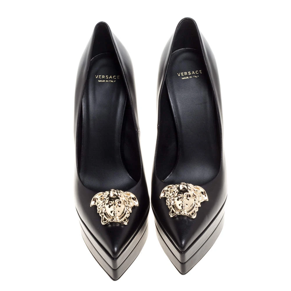 Designed to perfection, these pointed-toe pumps are from the luxury house of Versace. They are covered in leather, detailed with the Medusa logo and balanced on 15 cm heels and platforms. Feel your best every time you slip into these black pumps.