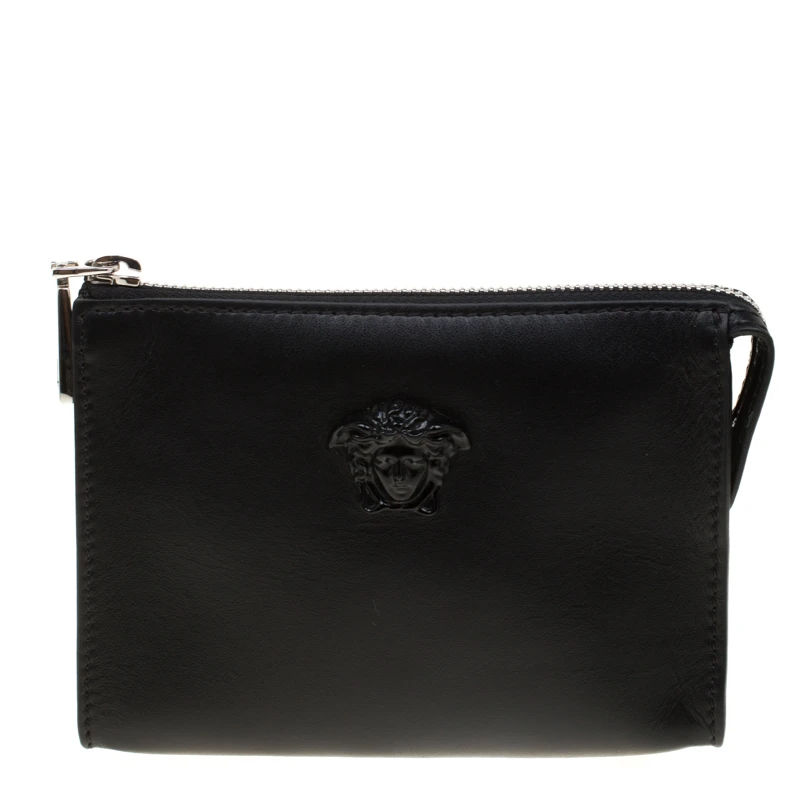 Finely crafted from leather, this Versace pochette is a worthy buy! The piece features the Medusa emblem on the front and a fabric interior secured by a zipper. This pochette is handy and stylish.