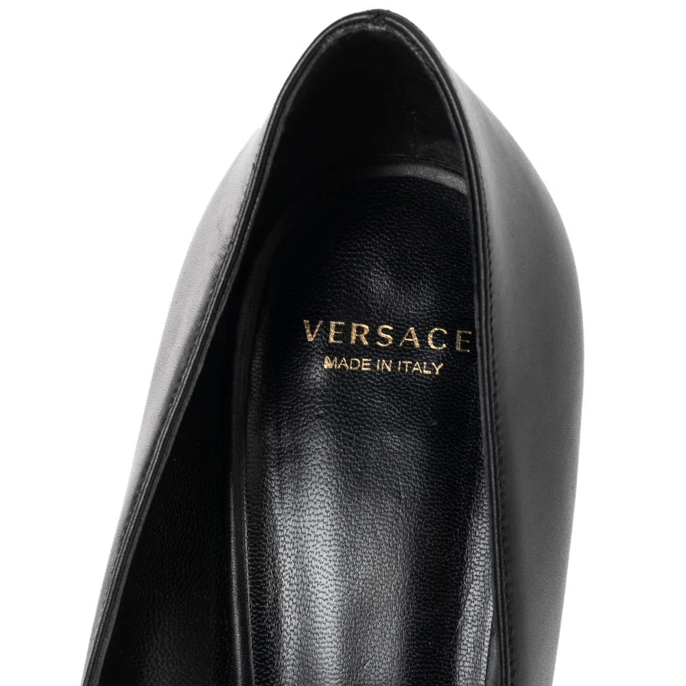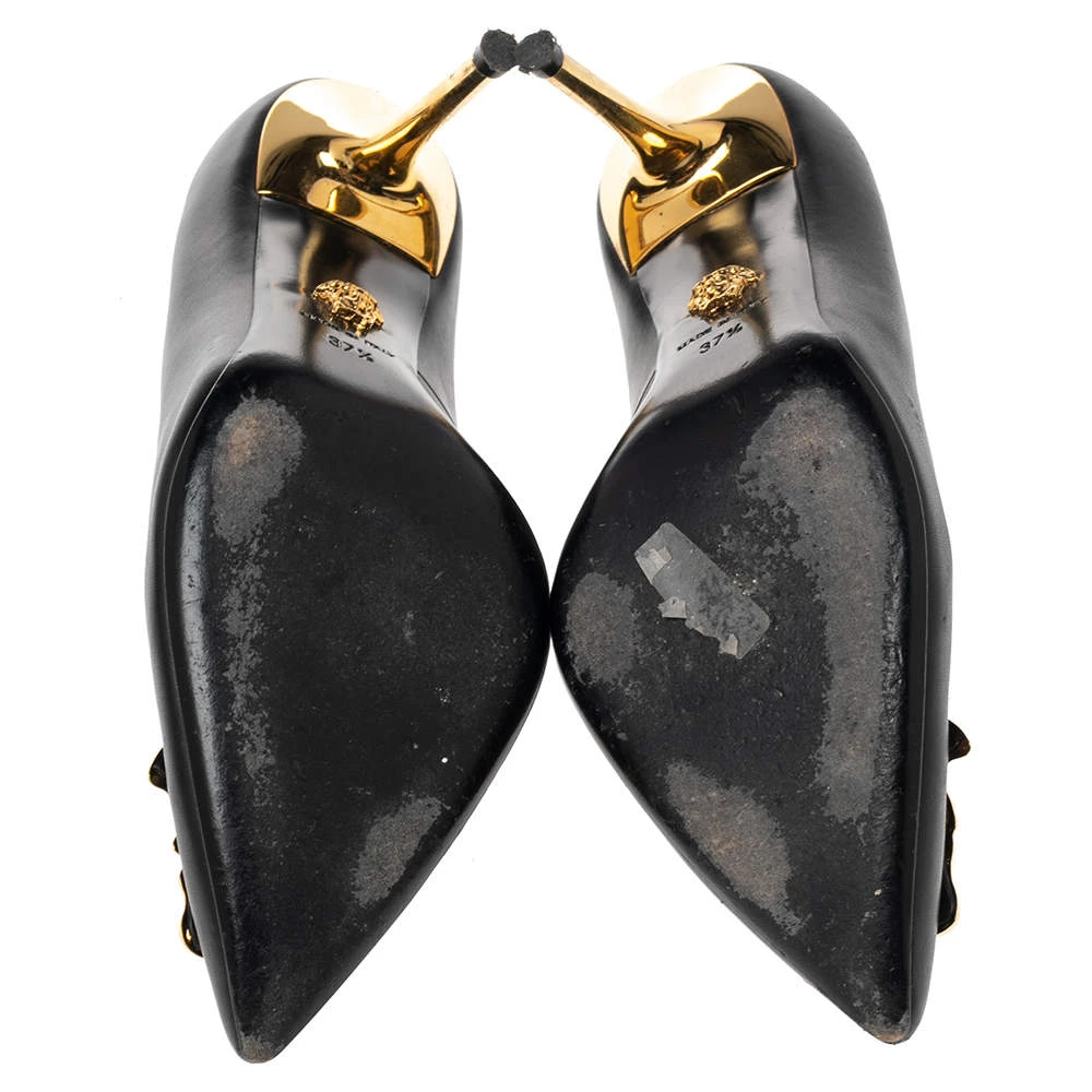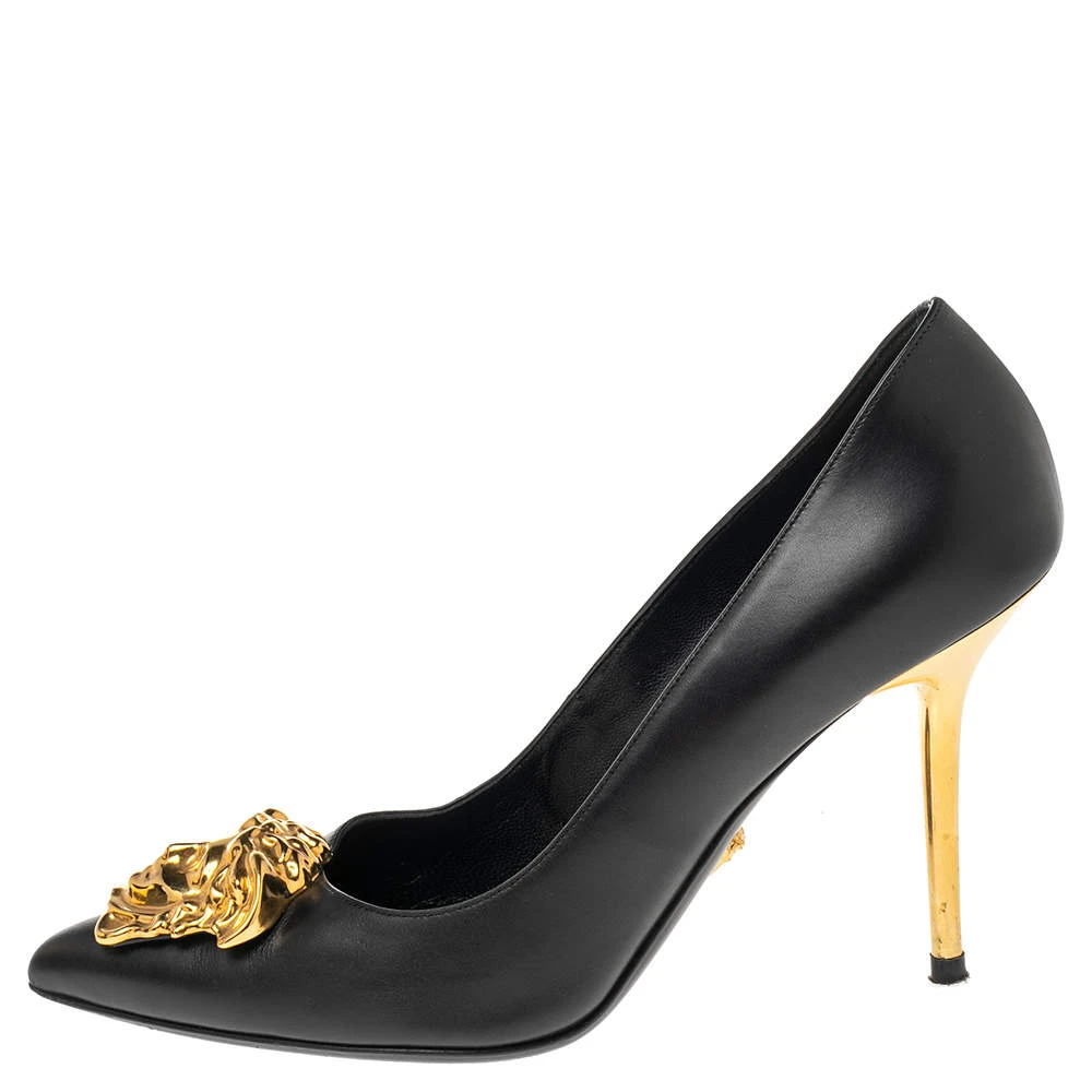 This pair of Versace pumps are a style statement with a timeless design. Crafted from black leather, they feature pointed toes accented with the iconic Medusa motif in gold-tone metal, 10 cm heels, and leather soles. They bring a touch of glamour to every outfit they are paired with.