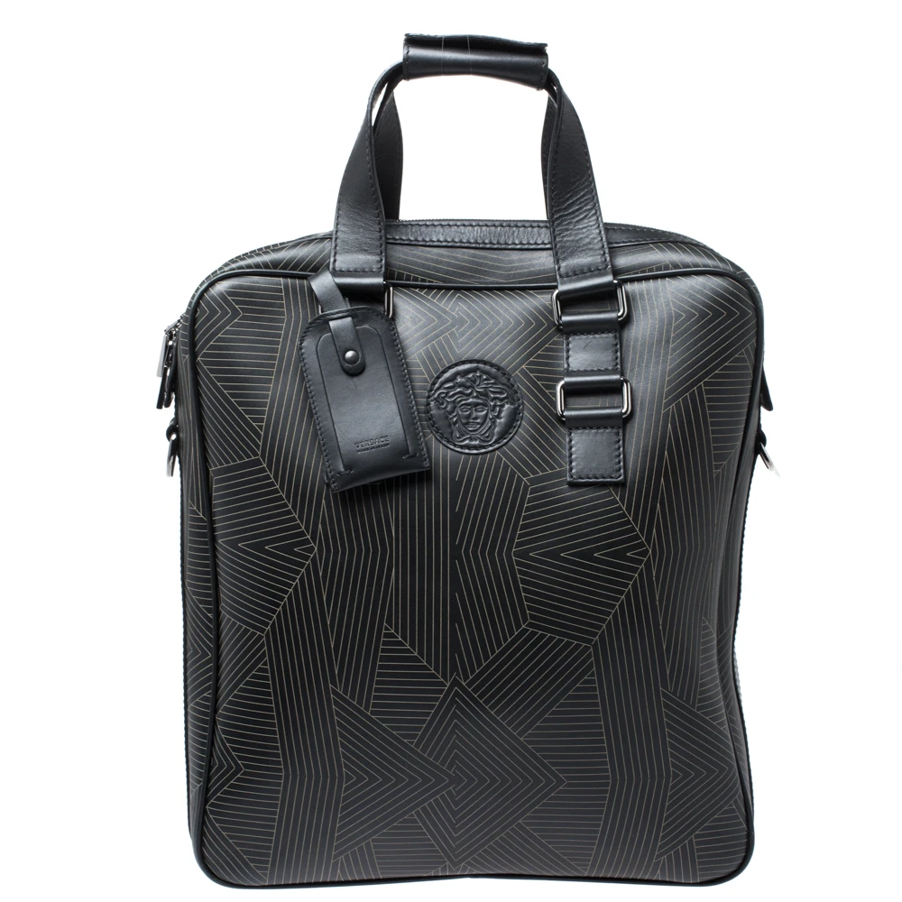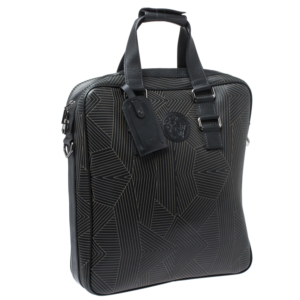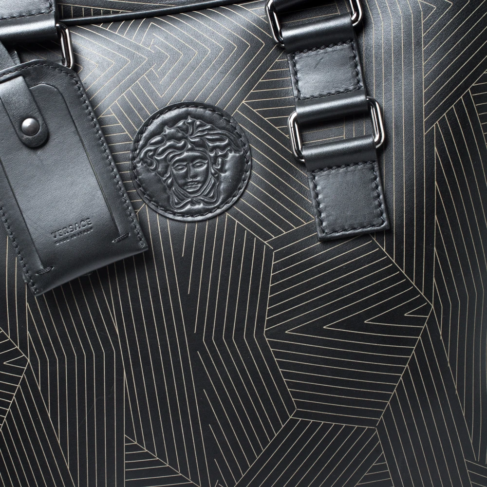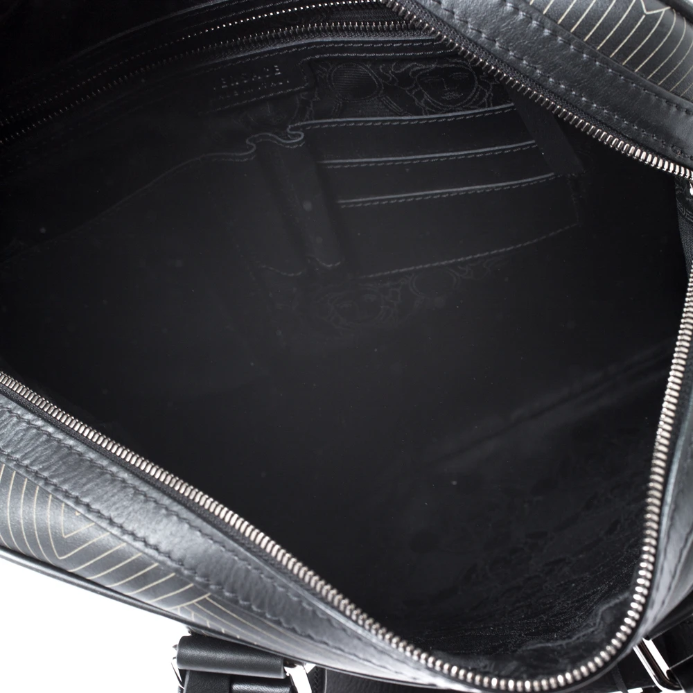This stunning briefcase tote will elevate your everyday look instantly. Designed to deliver style and functionality, this creation from Versace is a must-have. It is has been crafted in Italy and is made of black leather. It features a lovely pattern on the exterior which is further enhanced with the signature Medusa logo. It is held by dual handles, a shoulder strap. It features a top-zip closure that opens to a fabric-lined interior with a zip pocket, patch pockets and enough space to carry all your essentials. The creation is finished with silver-tone hardware.