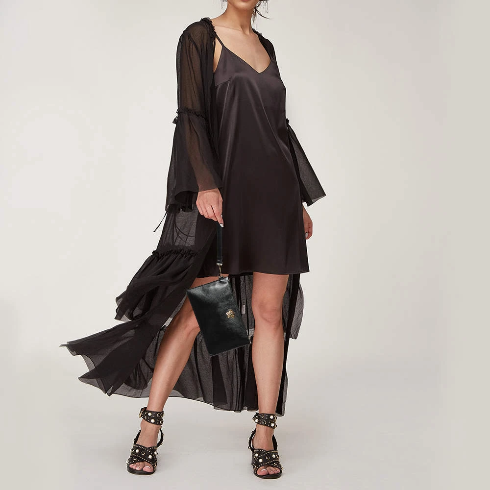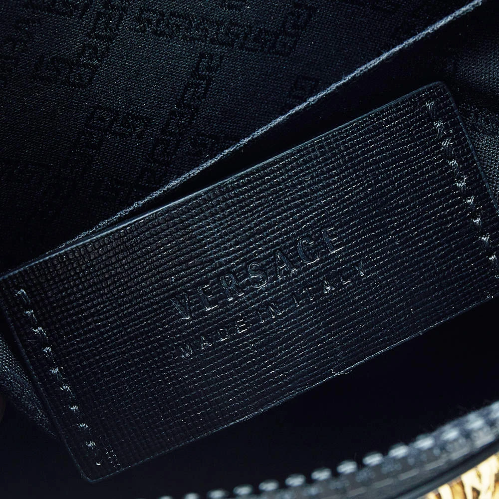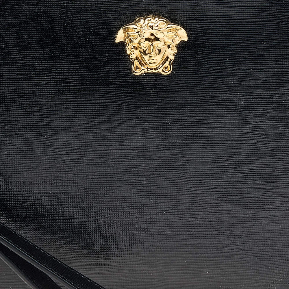 Organize your essentials in style with this Versace creation. The zip clutch has a textured leather outer in black with the Medusa motif in gold-tone metal at the front. It is lined with fabric.