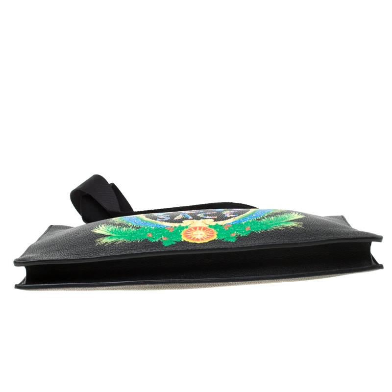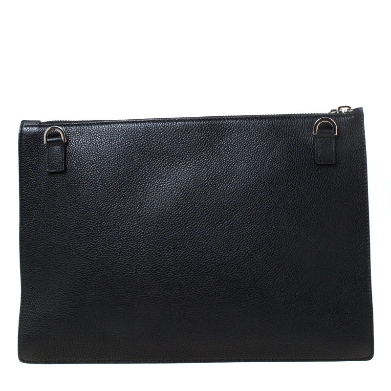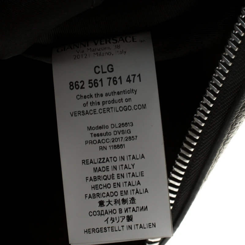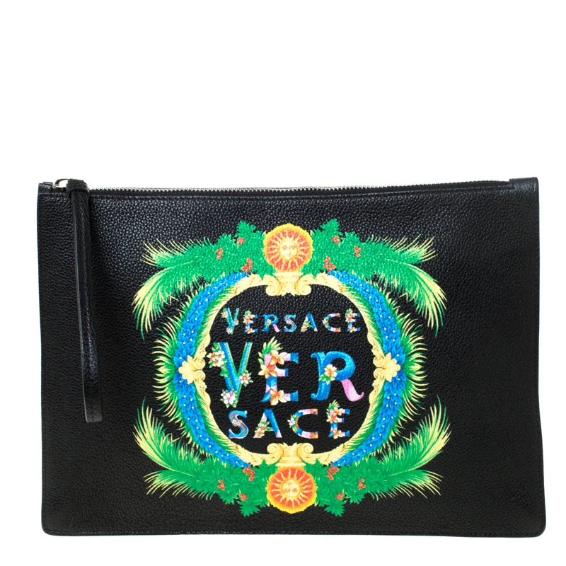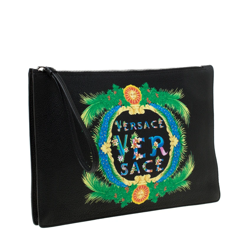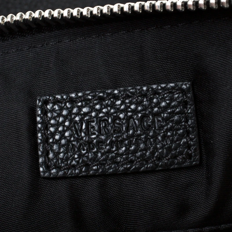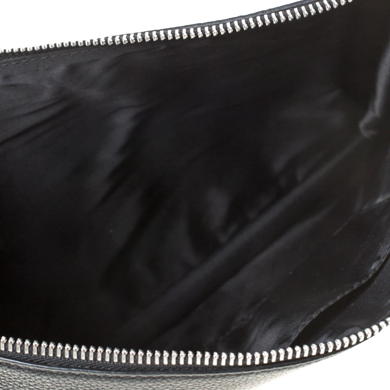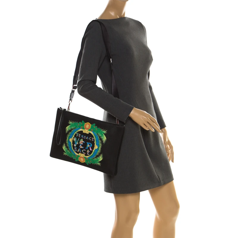 Our eyes are hooked on this gorgeous clutch from the house of Versace. Strike a balance between femininity and boldness with this black leather clutch that comes with a shoulder strap. The zip-top closure opens to a nylon lined interior and the clutch flaunts a print on the front.