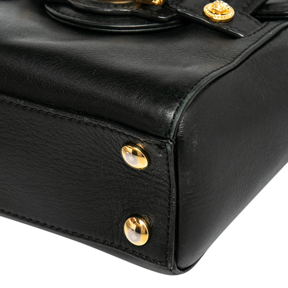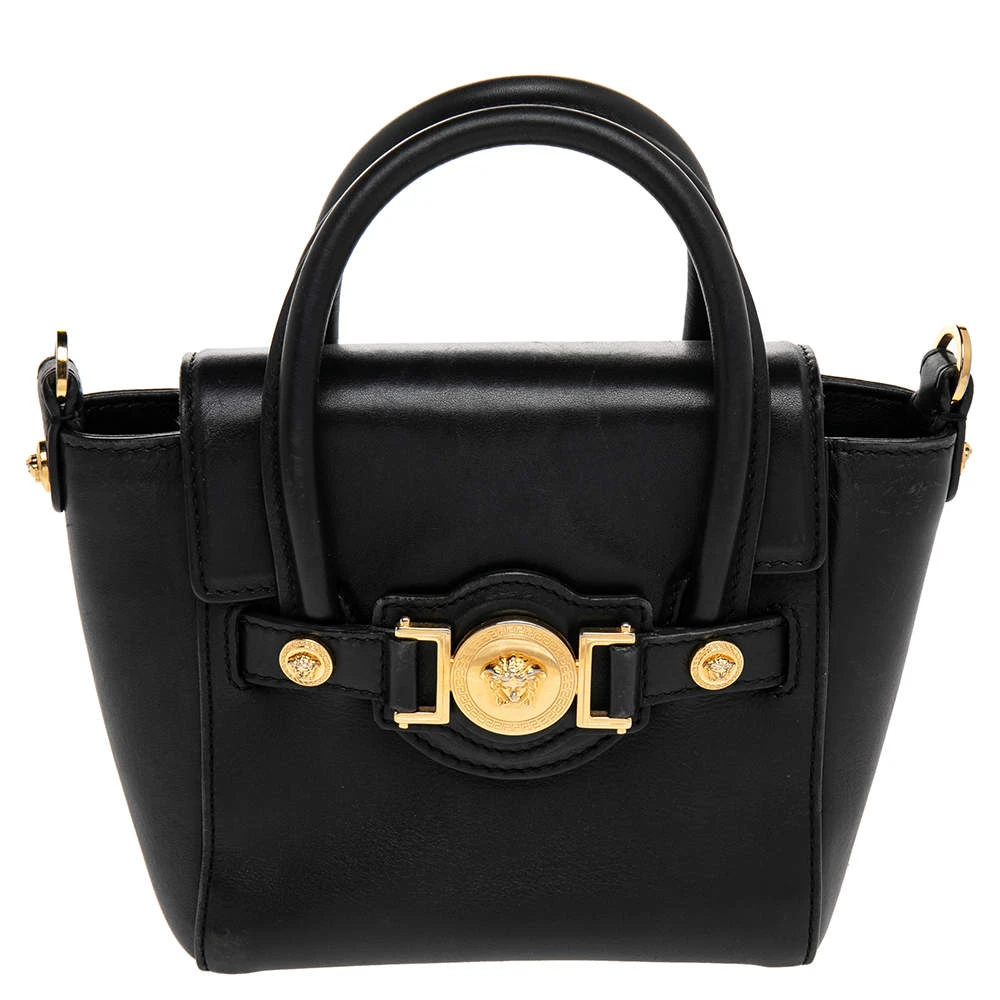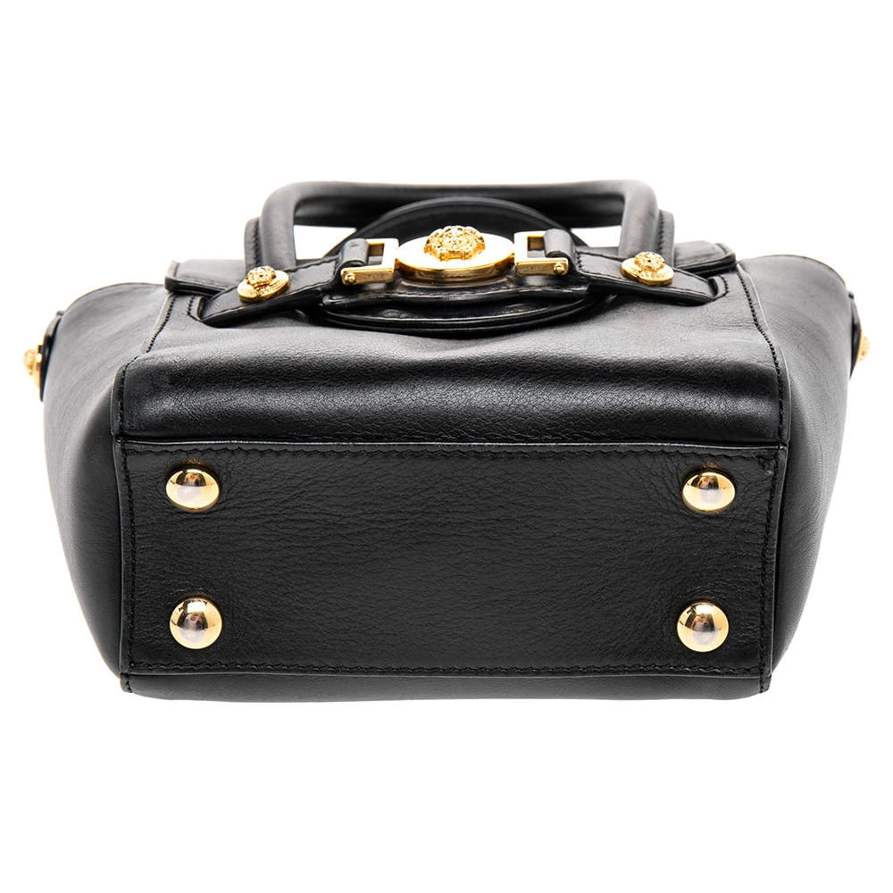 This Versace leather satchel has an alluring design. Beautifully crafted, the bag comes with a highly durable exterior detailed with the Medusa motif on the front, a fabric interior, two handles, and a shoulder strap. The creation is ideal for daily use.
