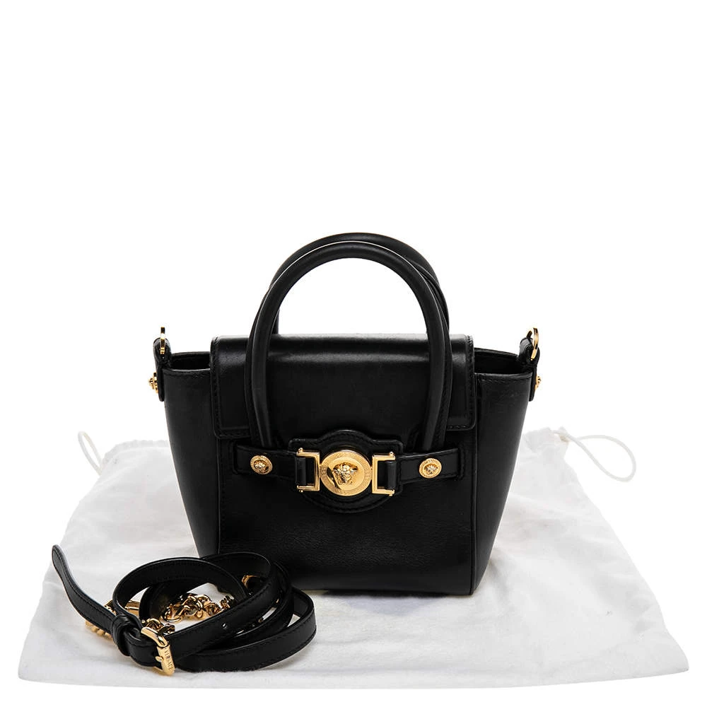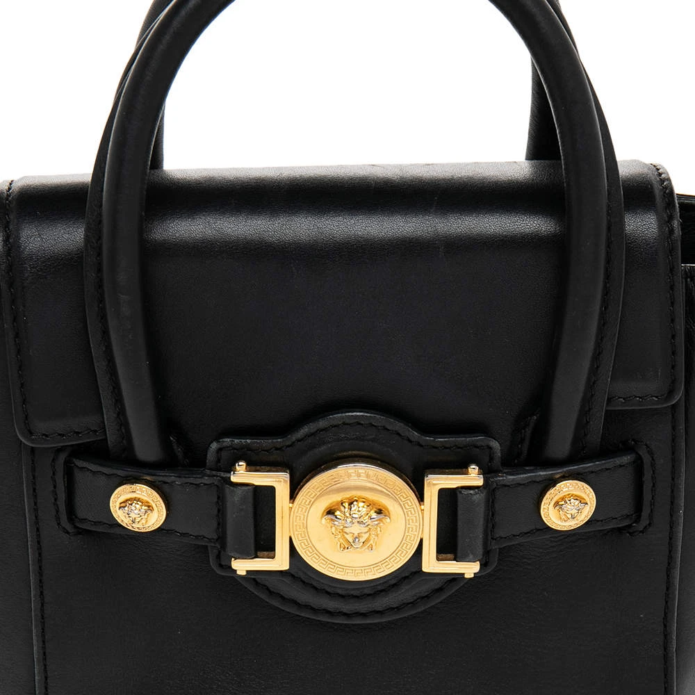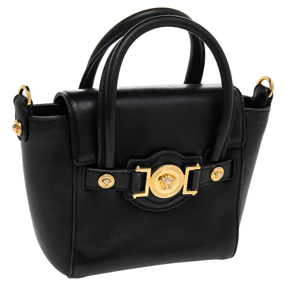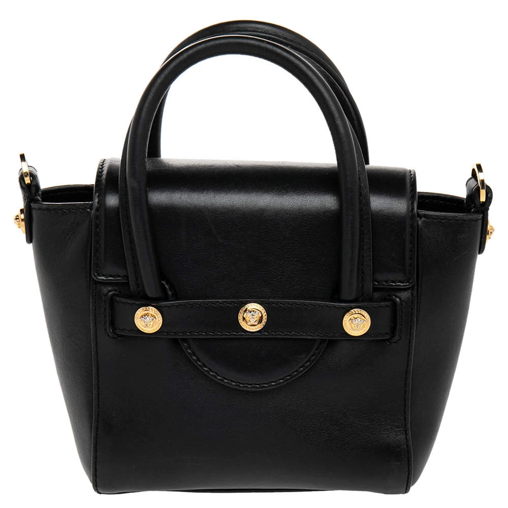 This Versace leather satchel has an alluring design. Beautifully crafted, the bag comes with a highly durable exterior detailed with the Medusa motif on the front, a fabric interior, two handles, and a shoulder strap. The creation is ideal for daily use.