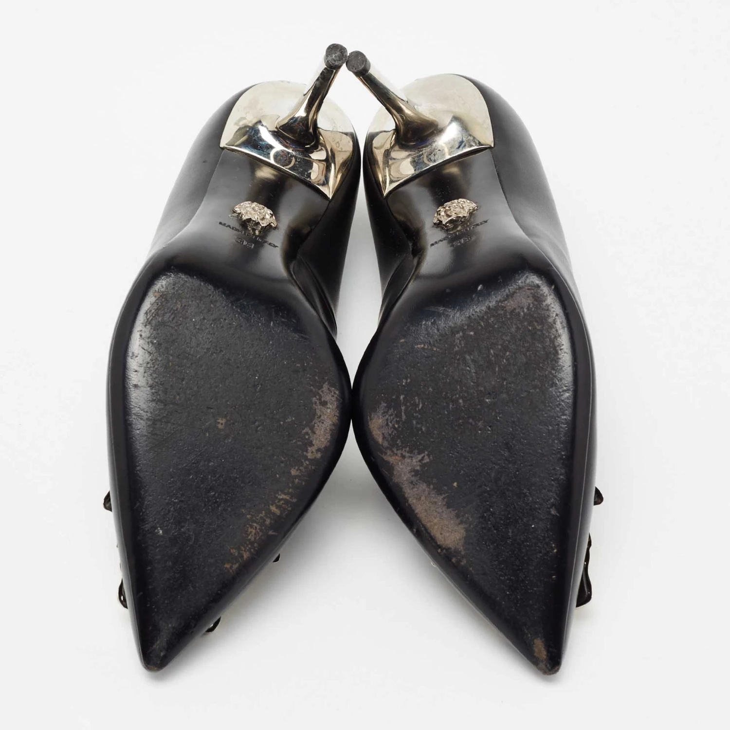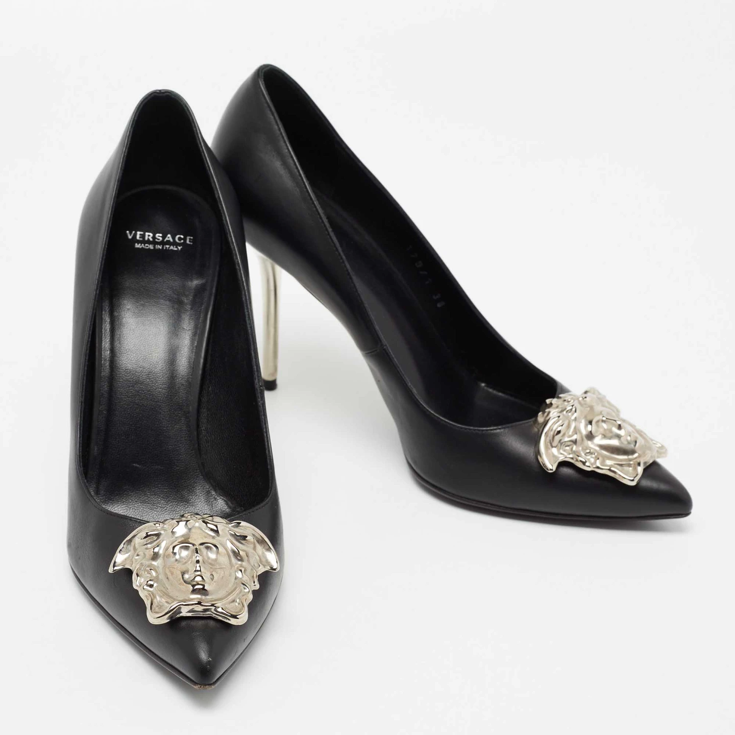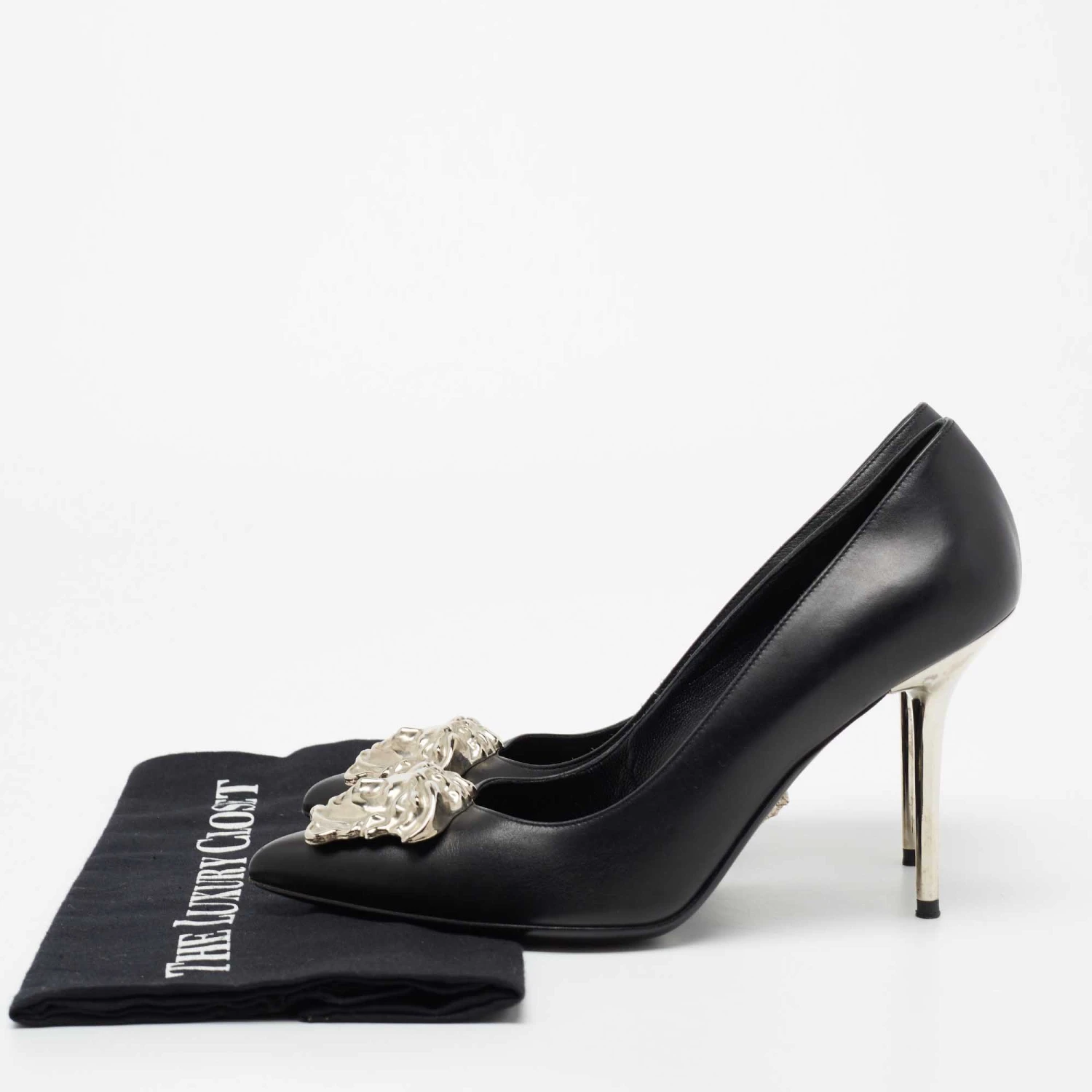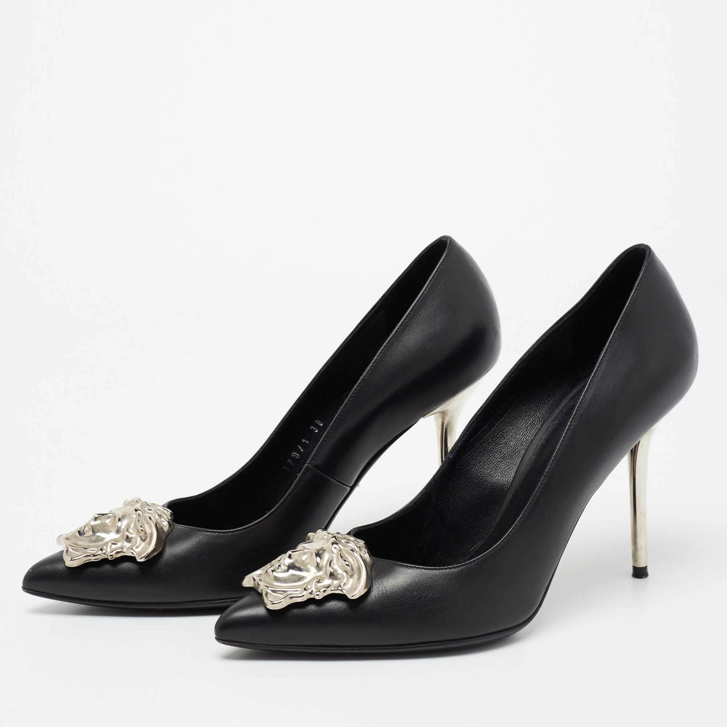 Bring signature charm and skill to your feet with these beautiful pumps from the House of Versace. They are decorated with a silver-tone Medusa Head motif on the black leather exterior. They showcase pointed toes, a slip-on style, and 10 cm heels. Pair them with your attire for a classy touch.
