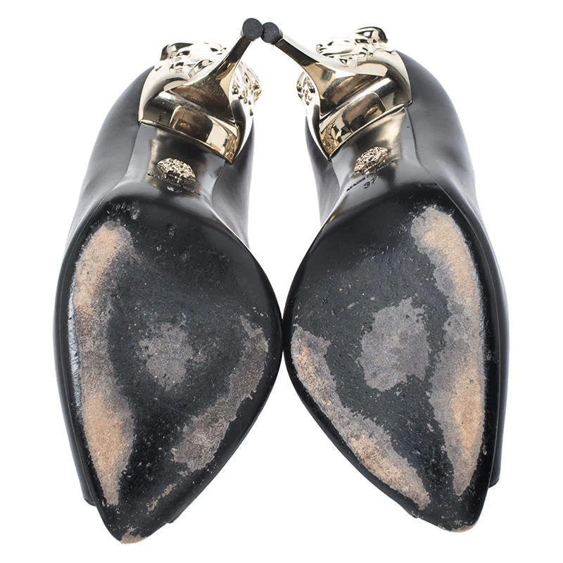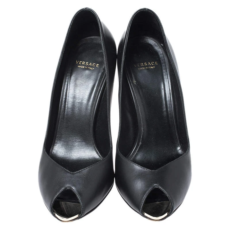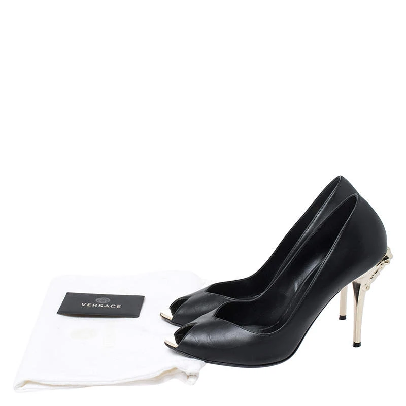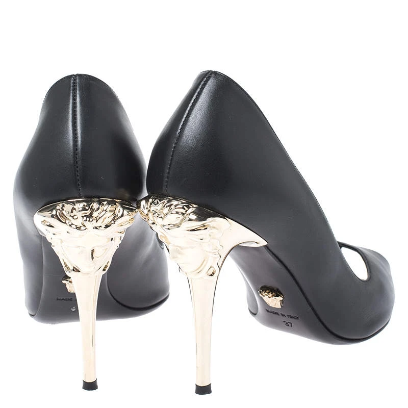 Treat your feet to the best by choosing these durable pumps from Versace! The black pumps have been crafted in Italy and made from quality leather. They are designed to deliver subtle glamour and sophistication. They come with peep toes and the signature Medusa detailing in gold-tone on the 10.5 cm heels. Grab these beauties now!
