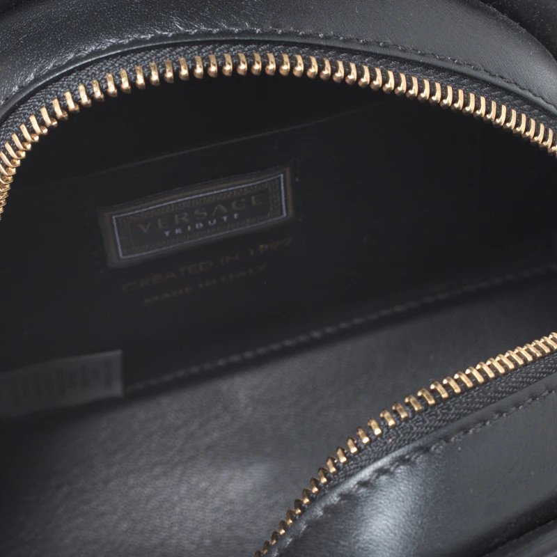 This Versace Tribute Medallion bag is one of a kind and a complete must-have. Crafted meticulously in Italy, it is made of quality leather and comes in a classic shade of black. Exuding elegance and glamour, the front exterior is adorned with gold-tone medallions that carry the signature Medusa motif. It is held by dual handles and comes with a zip closure that leads to a spacious leather interior. It is finished with protective metal feet, a detachable shoulder strap and gold-tone hardware.