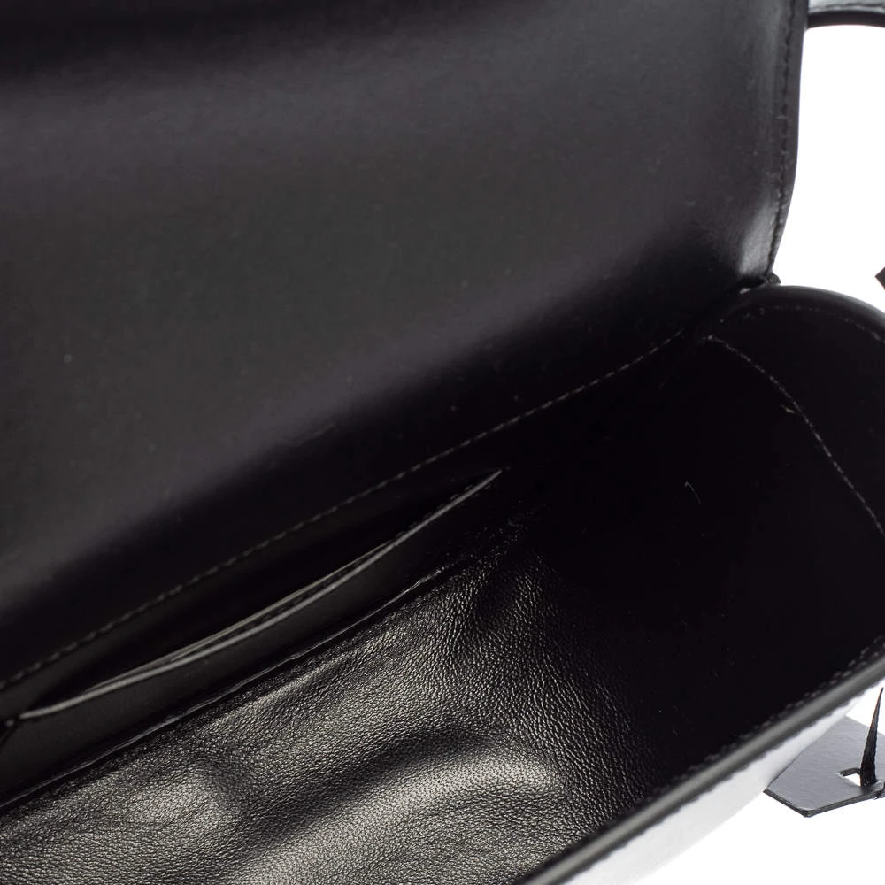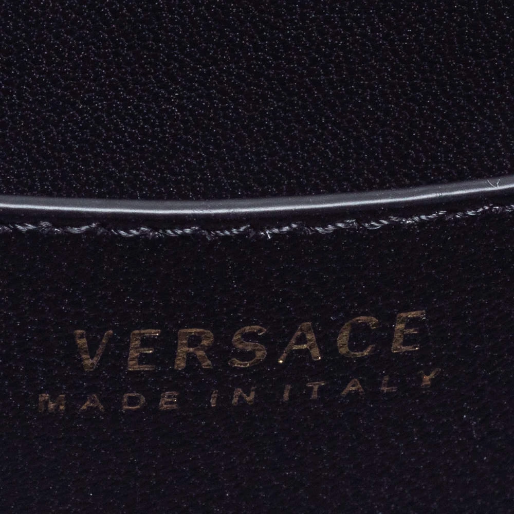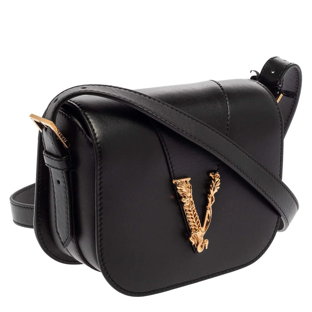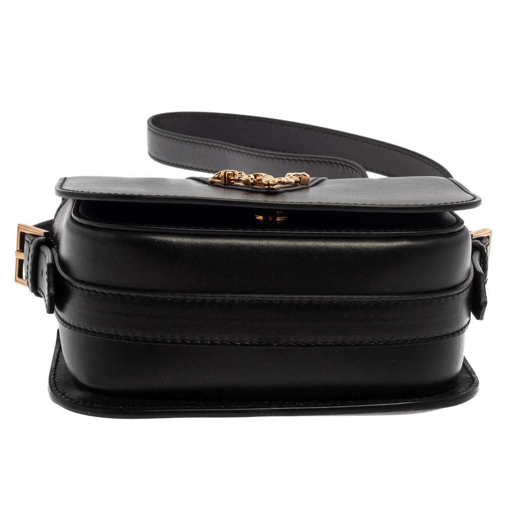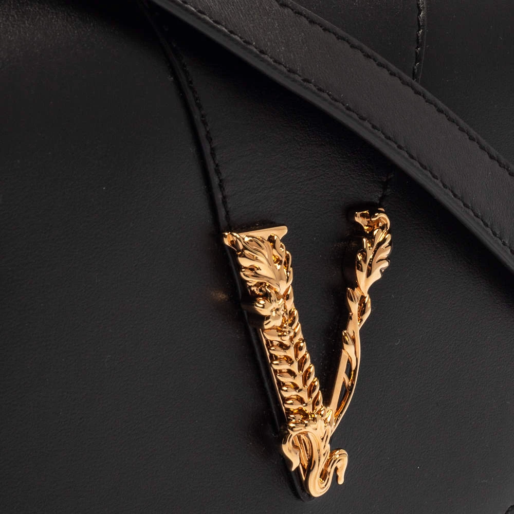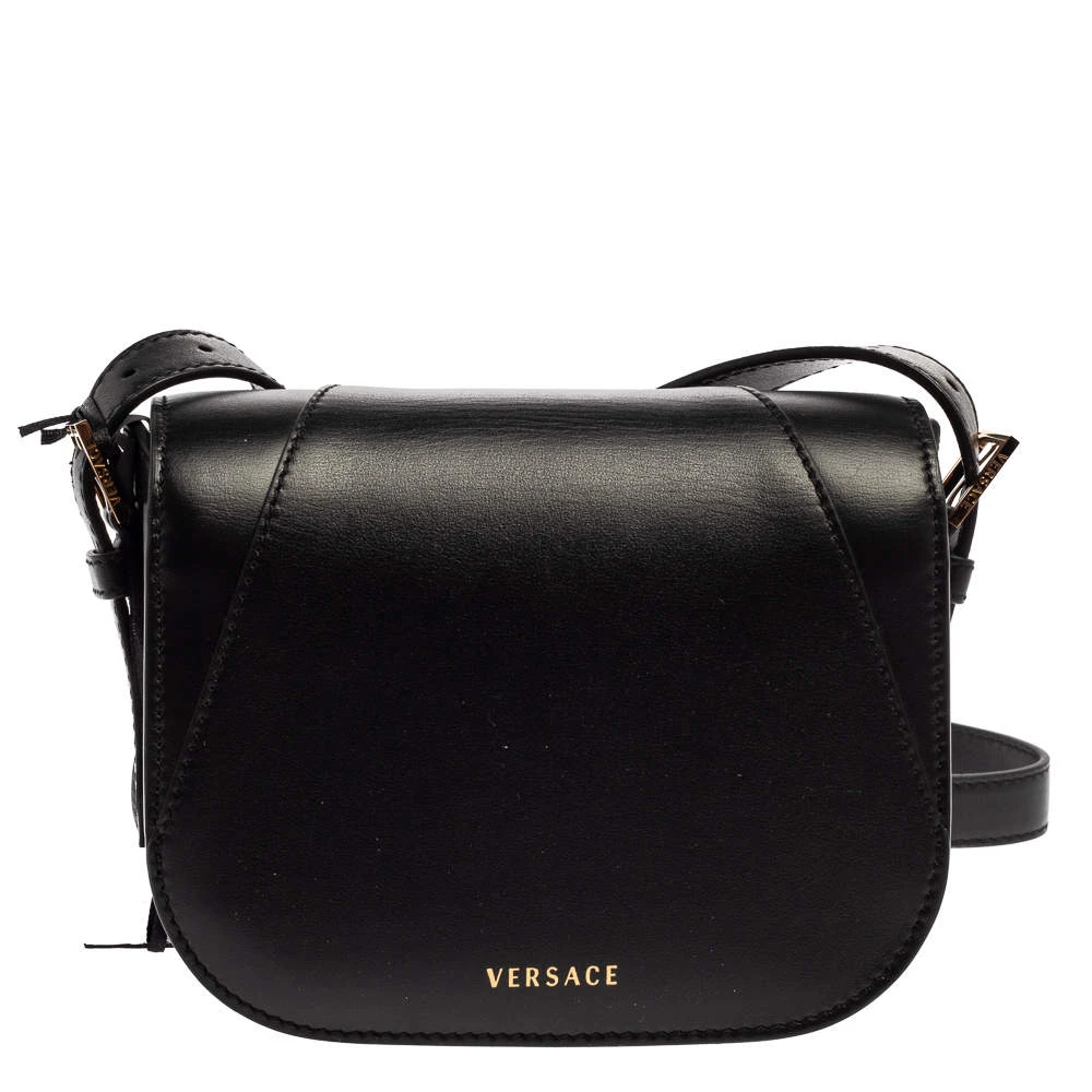Refresh your closet with this covetable Versace bag. The pretty V logo in gold-tone hardware on the black leather base is the winning feature of this bag. Equipped with a flap and a shoulder strap, it has a leather-lined interior for the things you need.