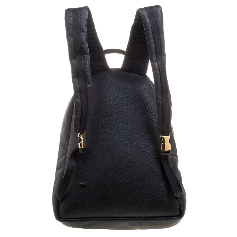 Get set to look uber stylish with this black backpack from Versace. Crafted from leather, it flaunts double zippers that reveal a spacious satin-lined interior, a zip pocket on the front and shoulder straps. Lastly, the bag is complete with stud detailing and the Medusa emblem on the front. This piece is very much in vogue, so get your hands on this today!