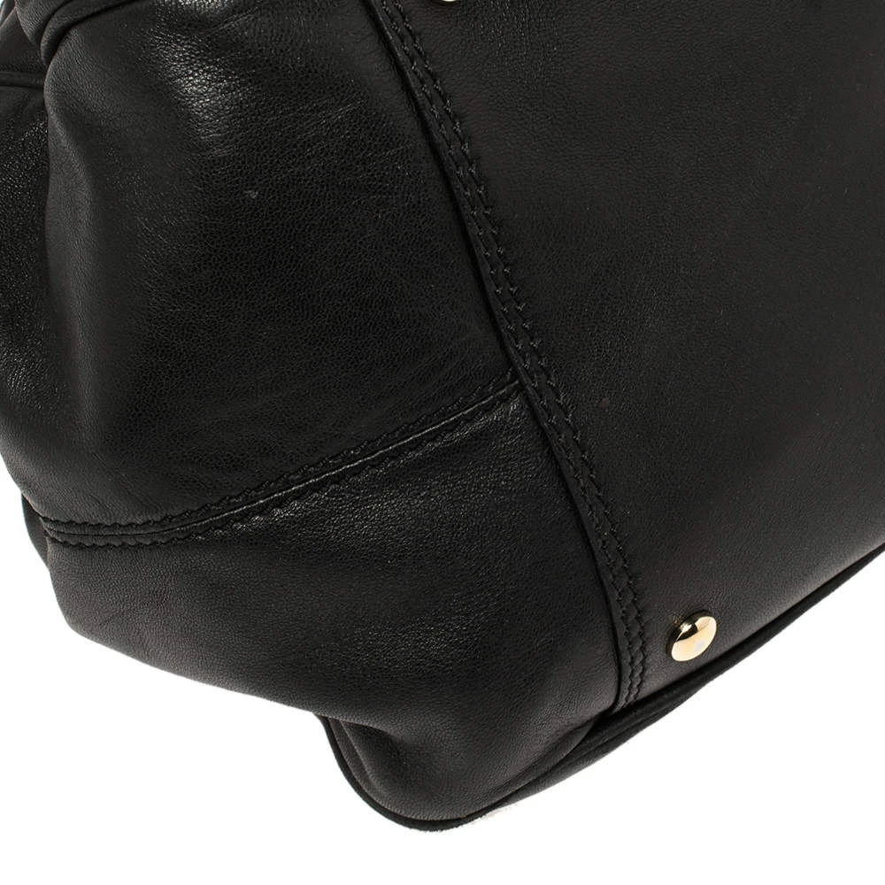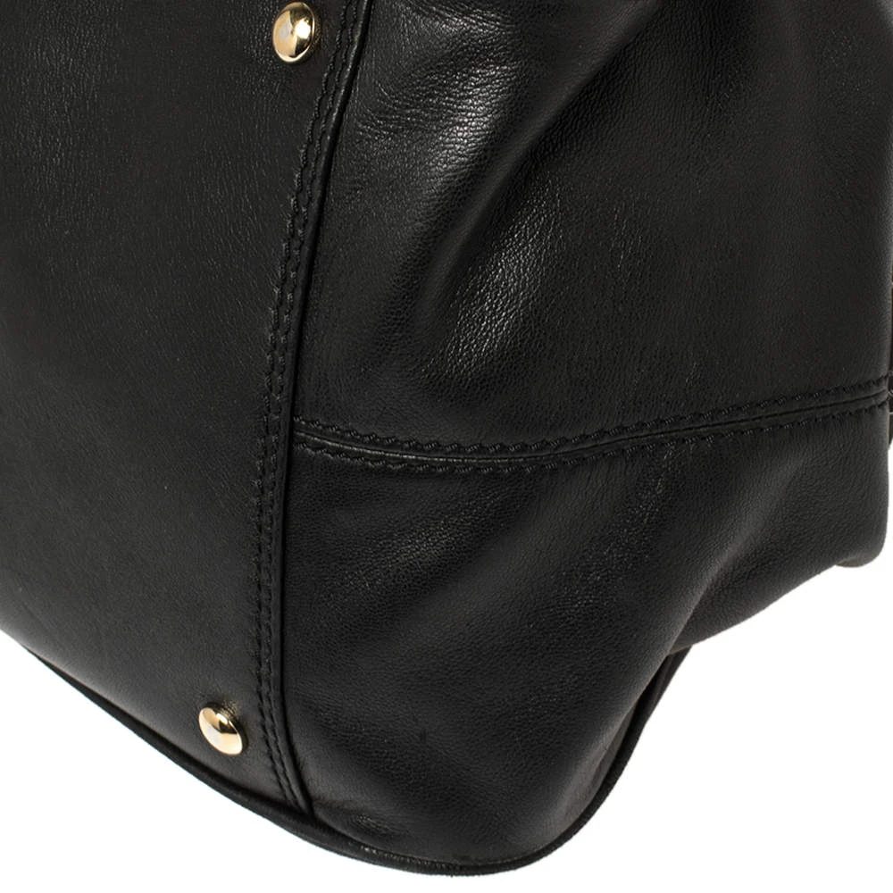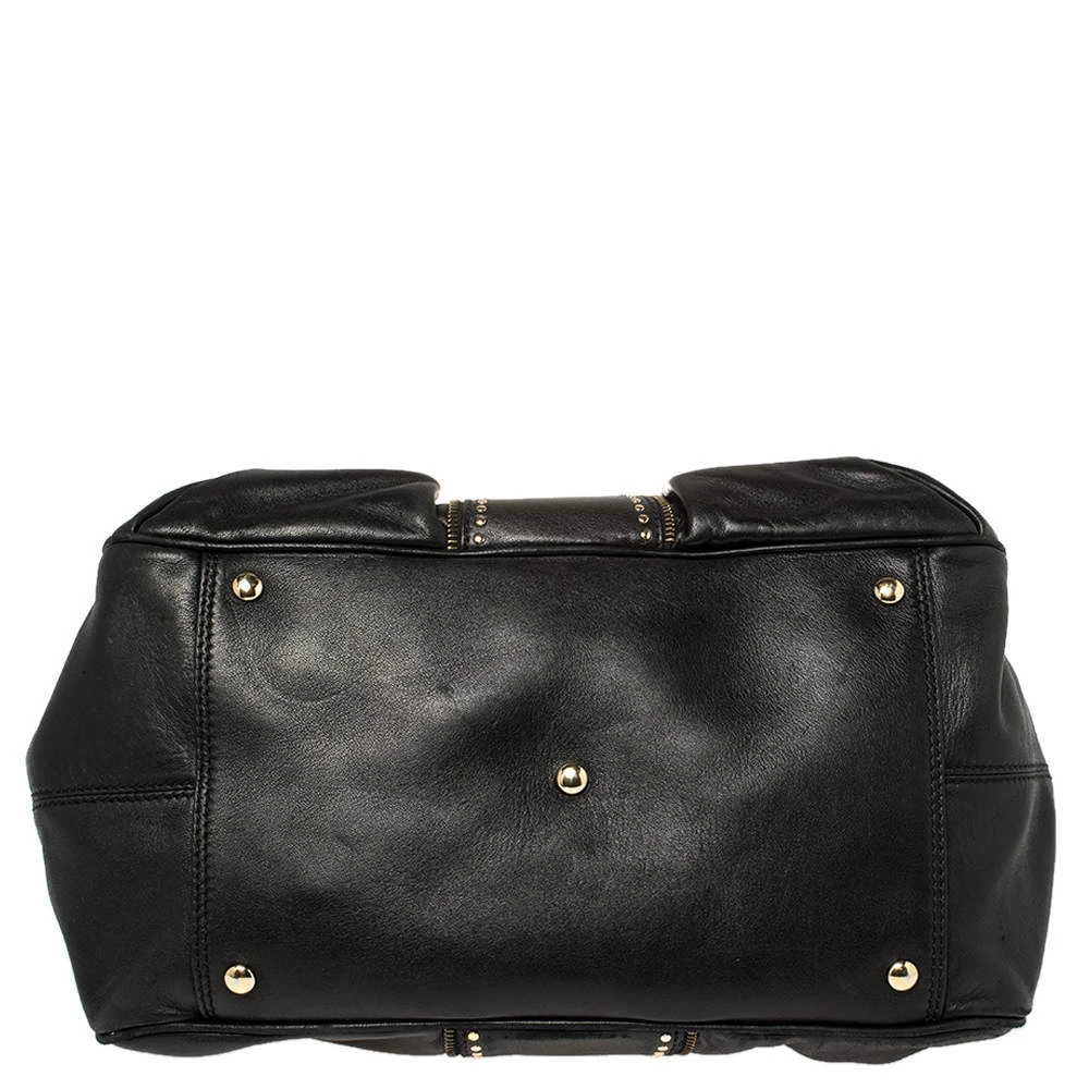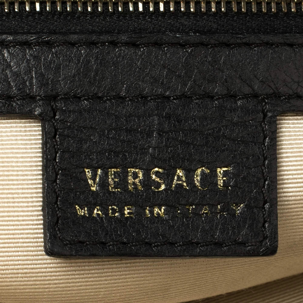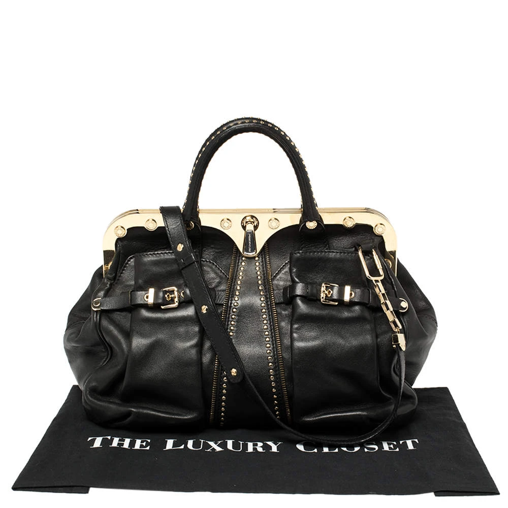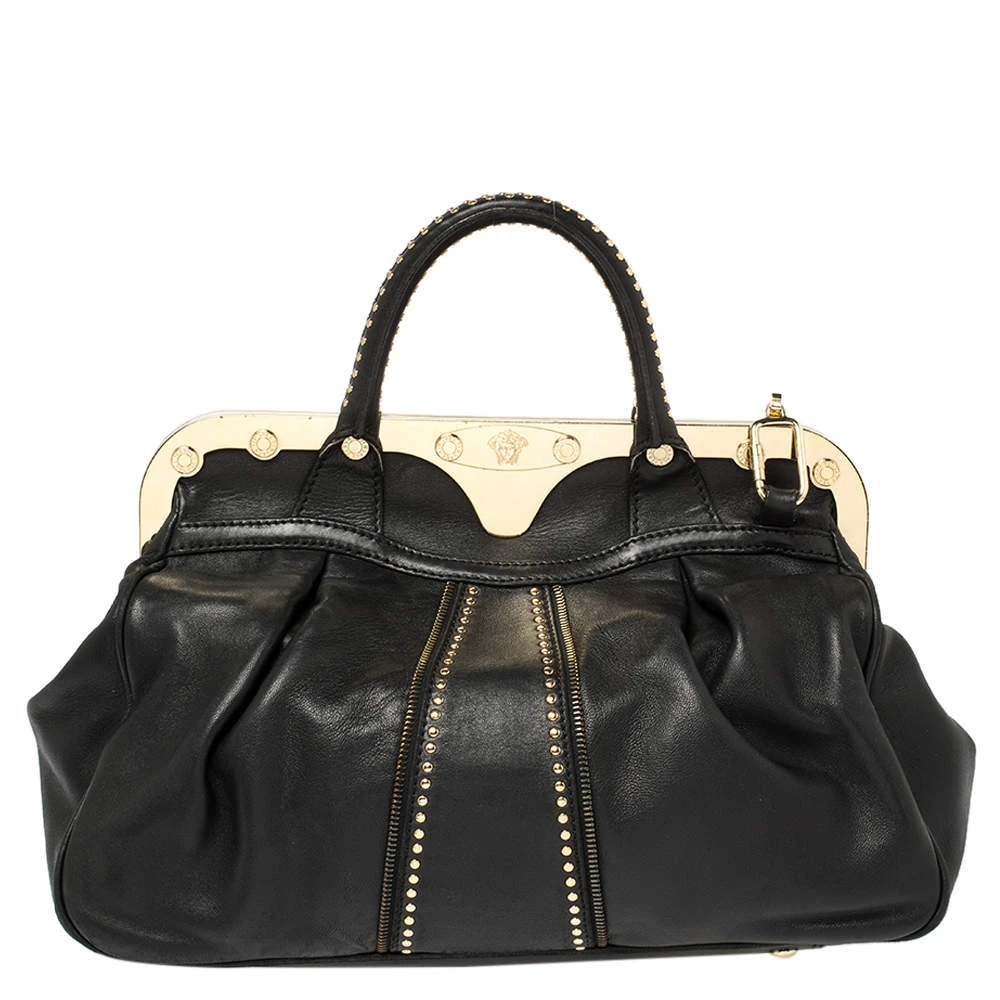 Giving satchel bags an elegant update, this Versace Reve bag is meant to be a valuable addition to your closet. It has been crafted from leather and styled with a gold-tone frame top, studs, and belts. It is complete with two top handles, a shoulder strap, and a perfectly sized nylon interior.