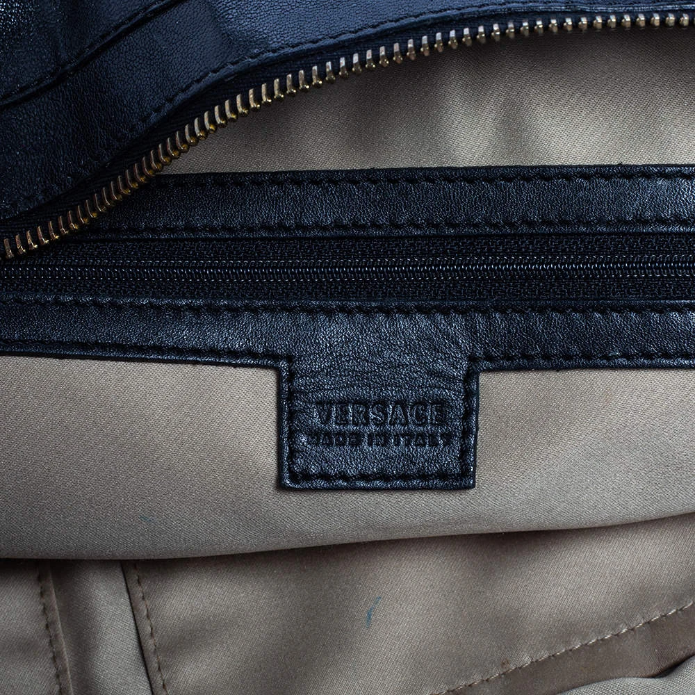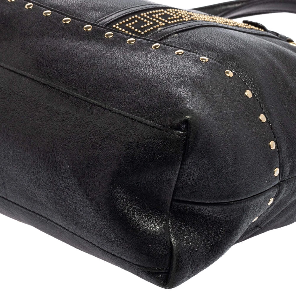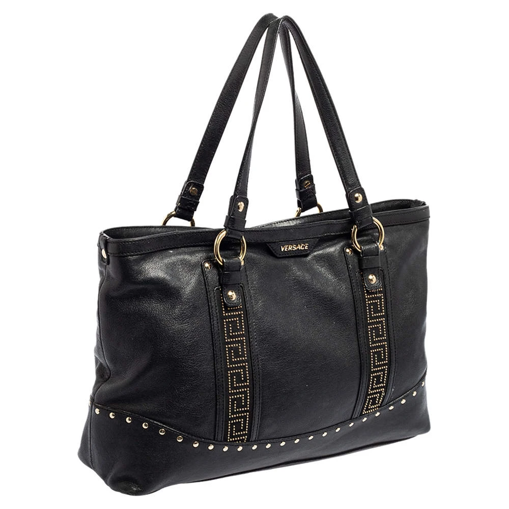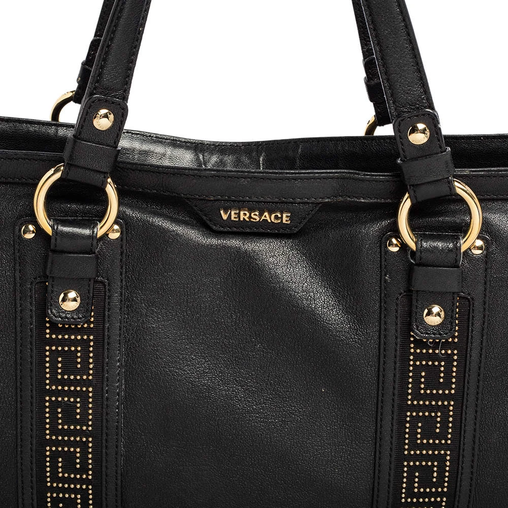 This beautifully stitched leather tote is by Versace. With a capacious satin-lined interior, it will house more than your essentials. Boasting two handles, metal stud details, and a fine finish, this tote offers style and practical ease.