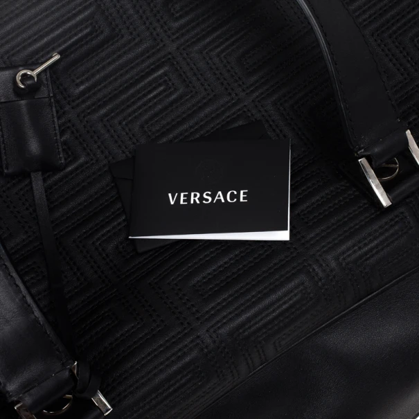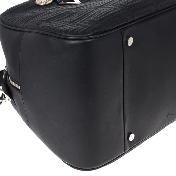 Look dapper even while you travel with this Versace luggage bag from the Gianni Versace line. Its exterior is embossed with Versace’s Couture motif, and its big design gives it a masculine look. It features a shoulder strap as well as a handle, making it versatile and convenient to carry. The silver-tone hardware on the monogrammed plaque, oversized studs, and Medusa charm add a dashing shine to the bag. The interior, lined whit cream textile, provides ample space to fit all your travelling essentials.Original Retail Price: US $2,663