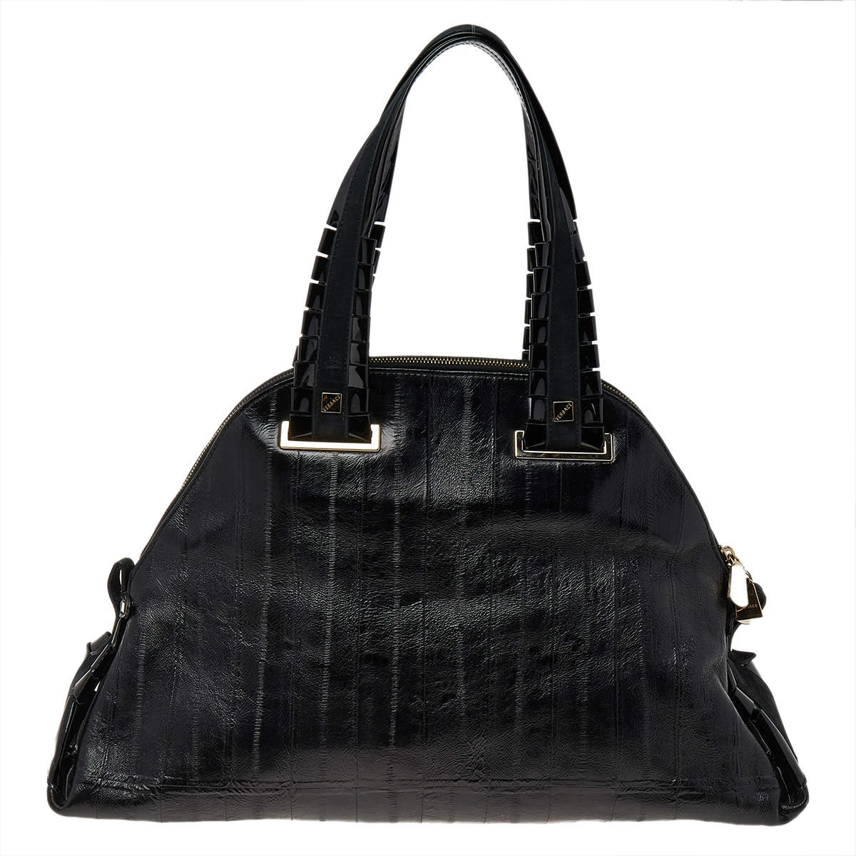 Designed from leather, this Versace satchel in black will complement your everyday look. It features two flat handles, the brand plaque at the front, metal studs to protect the base, and a spacious satin interior.
