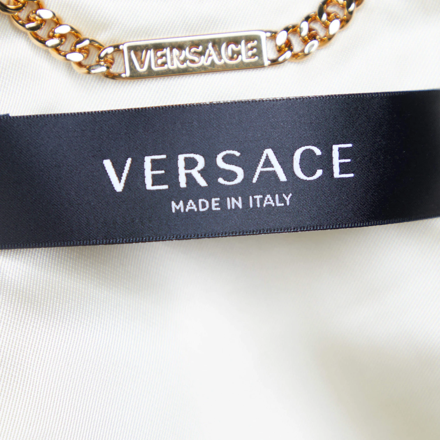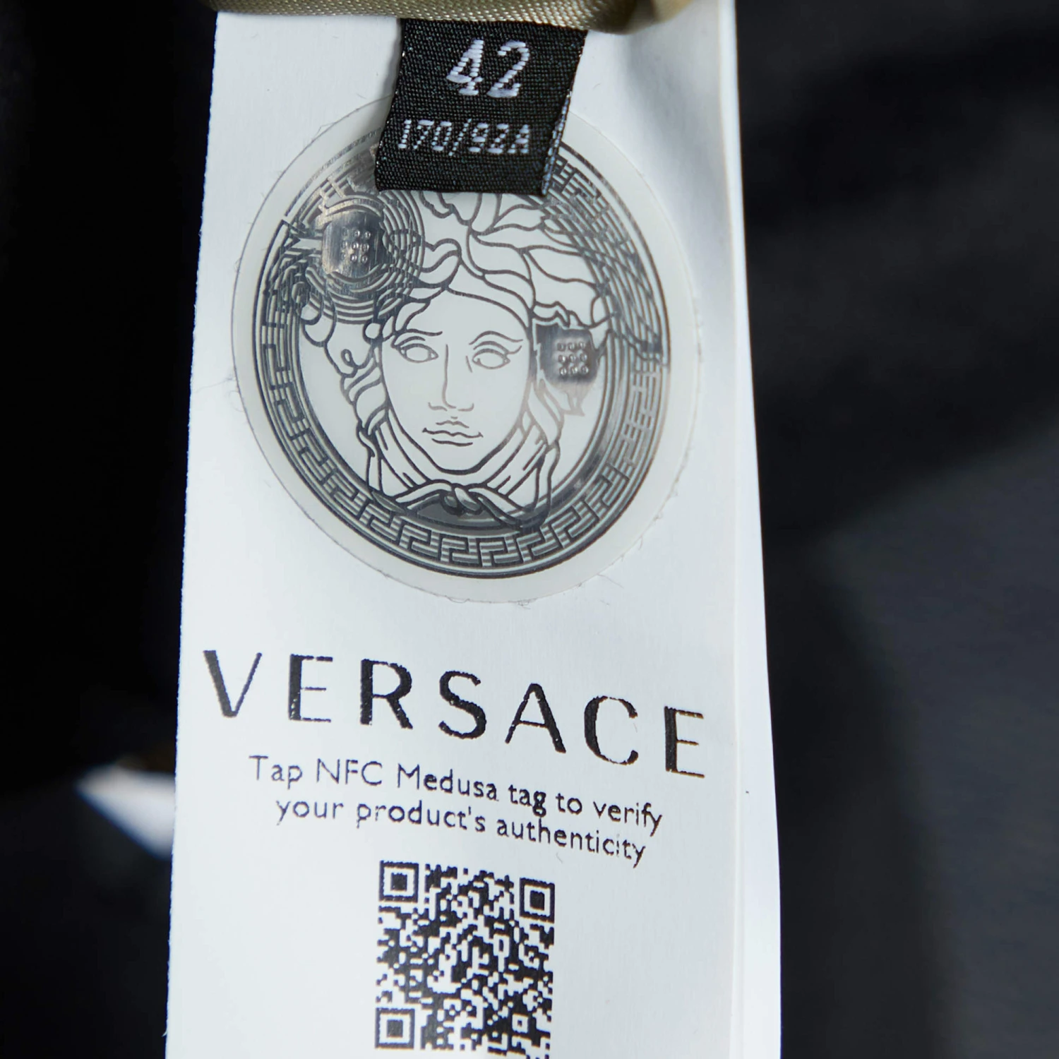 Lend a sharp, fashionable finish to your look with this Versace women’s blazer. Tailored carefully using linen blend fabric, the black blazer is added with a single front button, flap pocket detailing, and long sleeves.