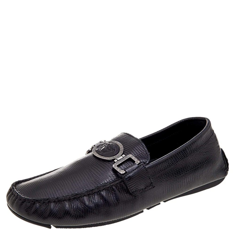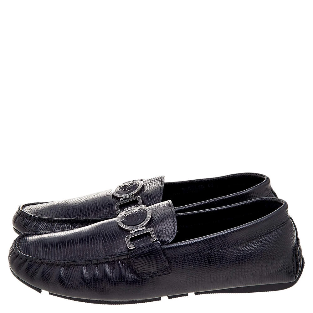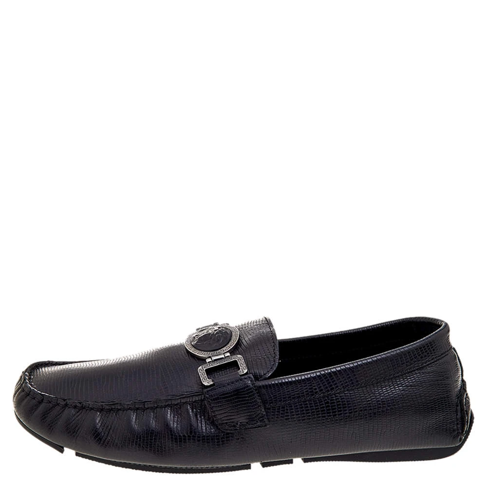 Exude sophistication and signature class as you walk in these luxuriously-made loafers from the House of Versace. They are designed using black lizard leather, with gunmetal-toned accents and a Medusa motif highlighting the vamps. They are made in a slip-on style and are very comfortable.
