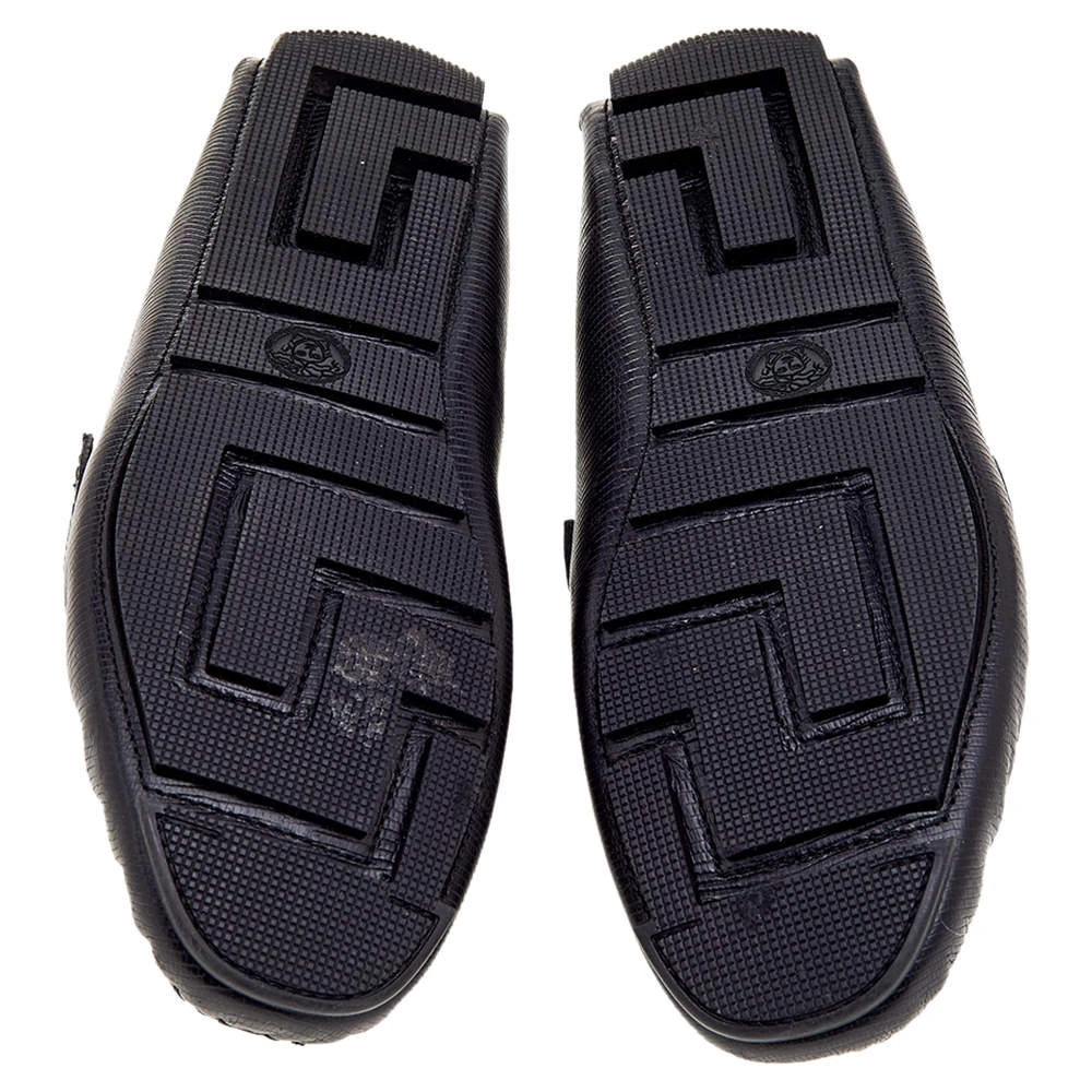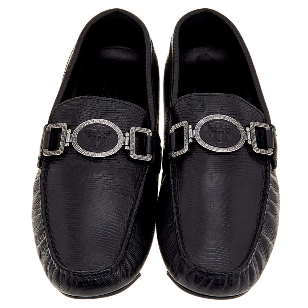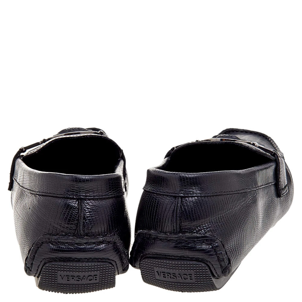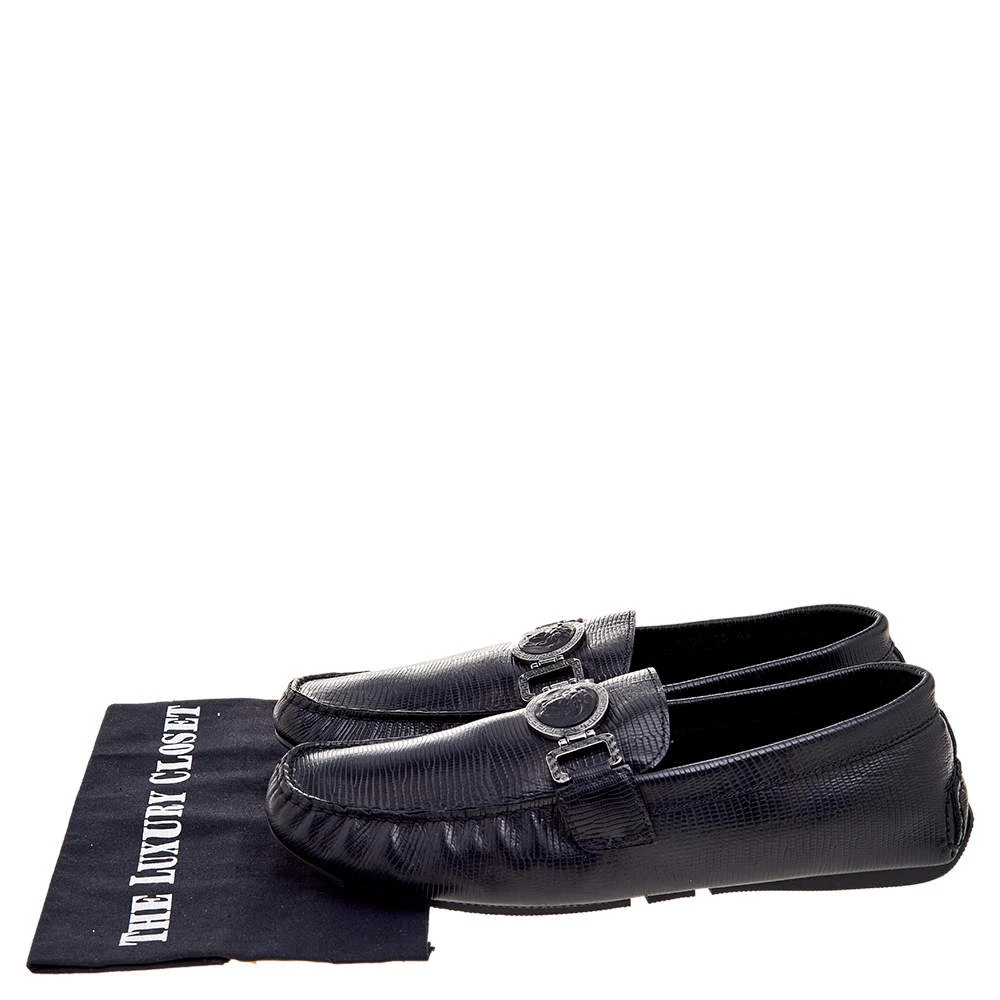Exude sophistication and signature class as you walk in these luxuriously-made loafers from the House of Versace. They are designed using black lizard leather, with gunmetal-toned accents and a Medusa motif highlighting the vamps. They are made in a slip-on style and are very comfortable.