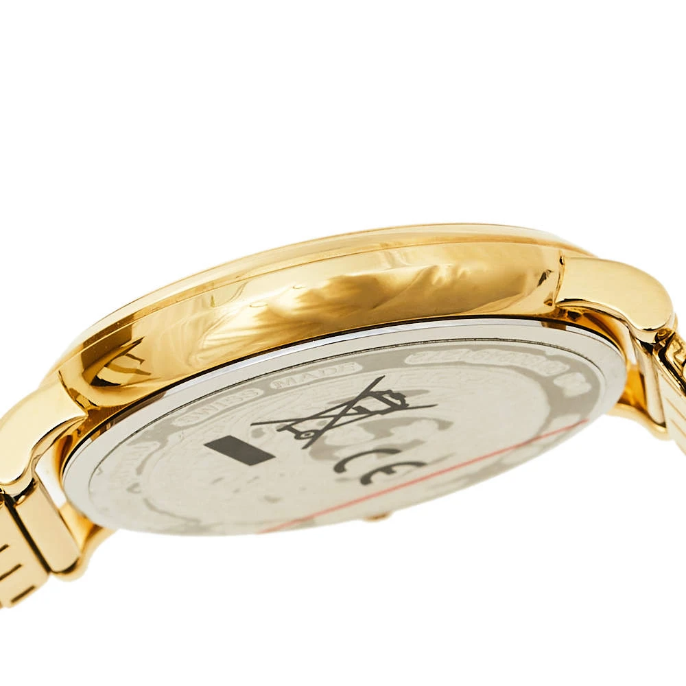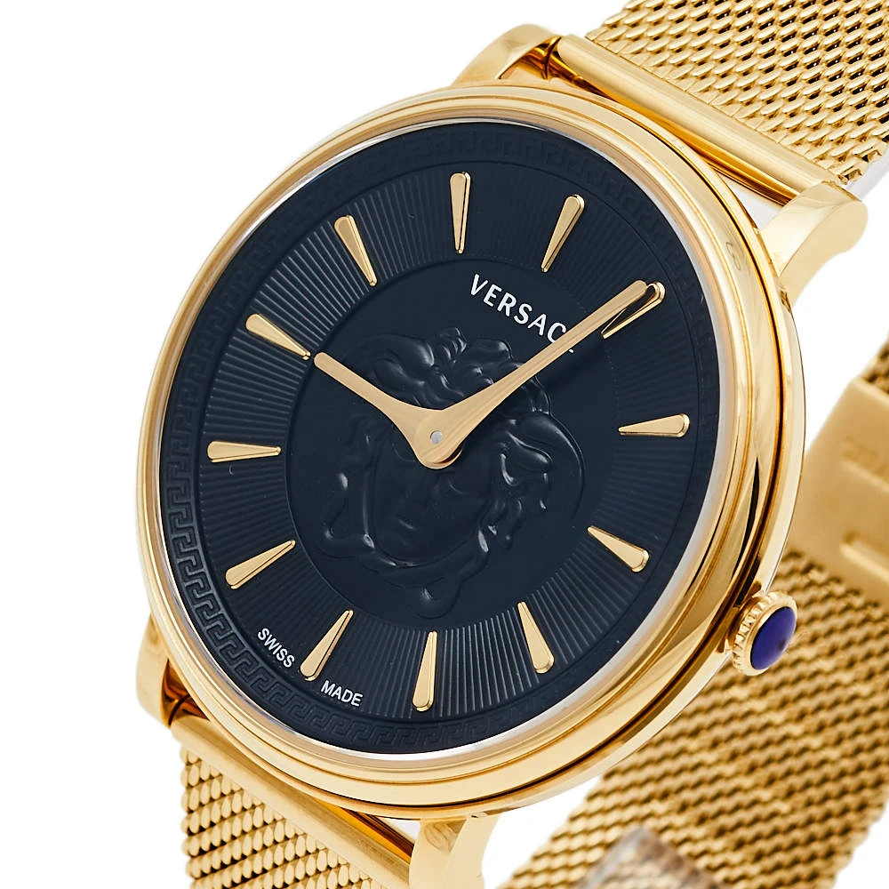 This Versace watch is set in a bold design. Constructed using gold-toned metal, this watch features a matching stainless steel link bracelet and a black dial. The round dial features index hour markers, the Medusa motif, and two hands. The watch is finished with a smooth bezel and 50 meters water resistance level.