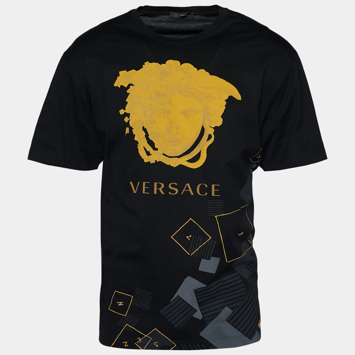 Versace brings you a simple t-shirt elevated by logo and Medusa prints on the front. It has been tailored from cotton in a black shade and features short sleeves. Style the creation with sneakers and denim pants for a cool and casual look.