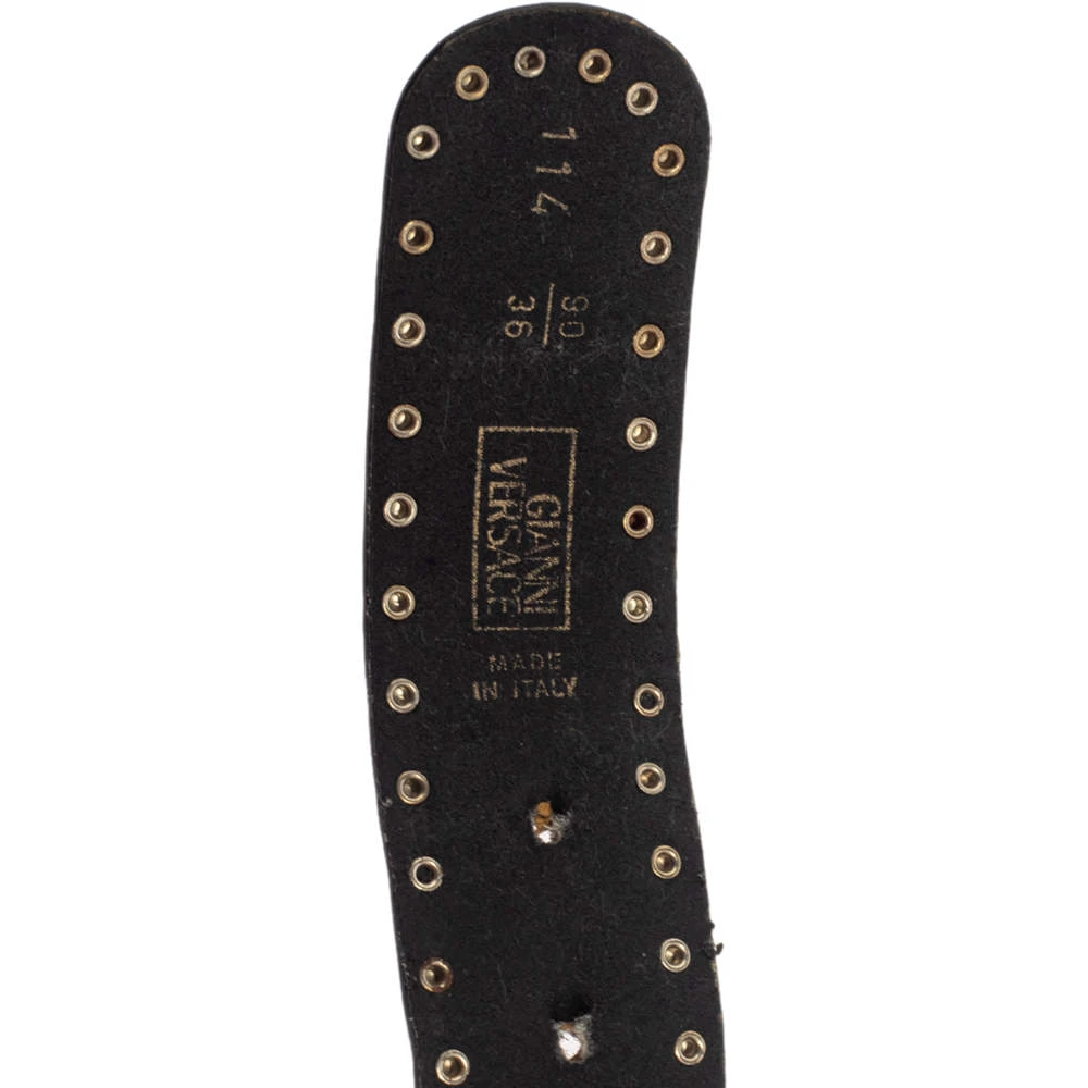 A statement designer belt for men by Versace. The belt is made from leather and elevated into a striking design by using studs in varied tones and the signature Medusa motif. It is sized to comfortably fit your waist.
