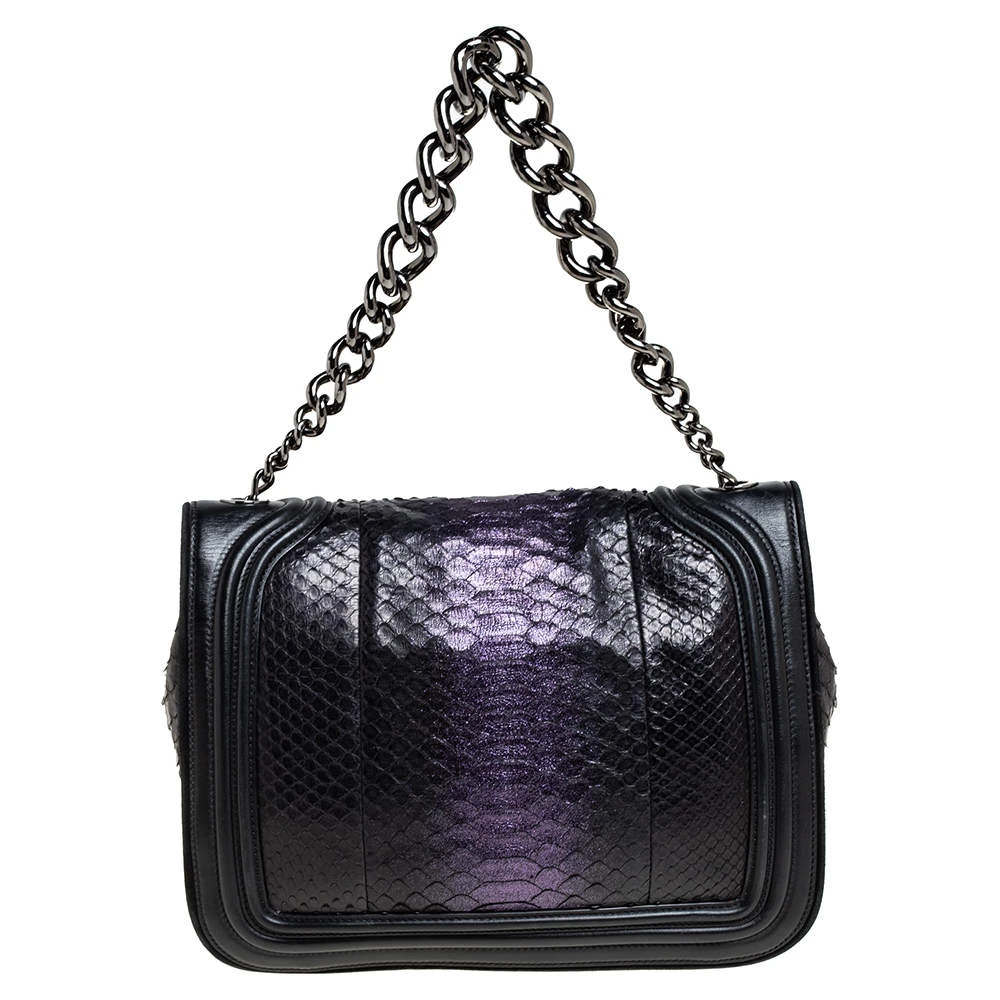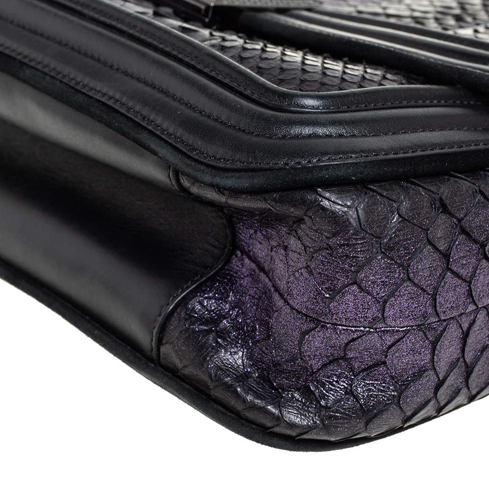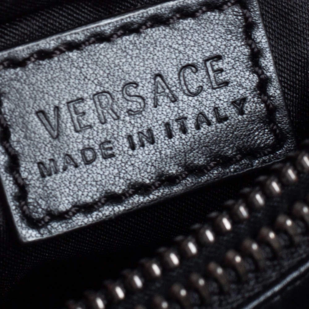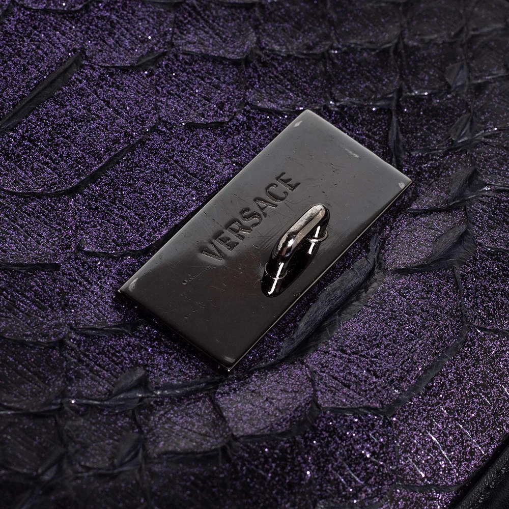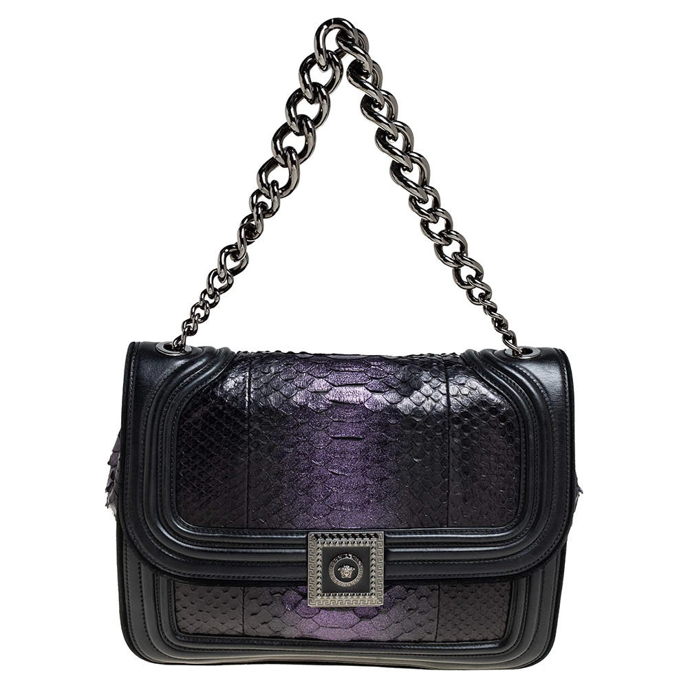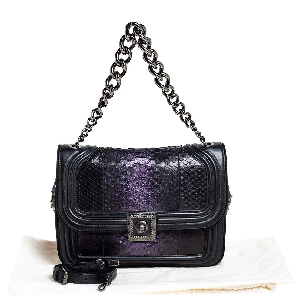 Make a striking appearance with this fashionable shoulder bag by Versace. This elegant creation is at once a fashion statement as well as a rational necessity. It is crafted from leather, python leather & suede and is adorned with a gunmetal-tone signature Medusa motif. Lined with satin, it has a spacious interior where you can stow your basics. This pretty piece is complete with a chainlink handle. (NOTE: FOR UAE CUSTOMERS ONLY)
