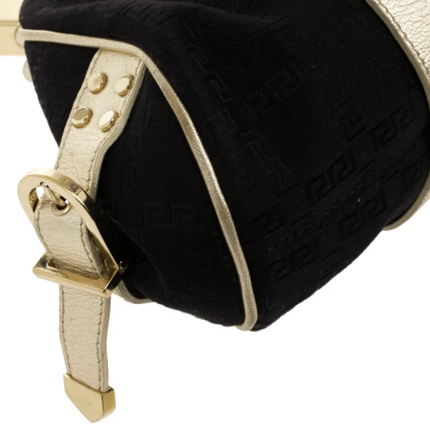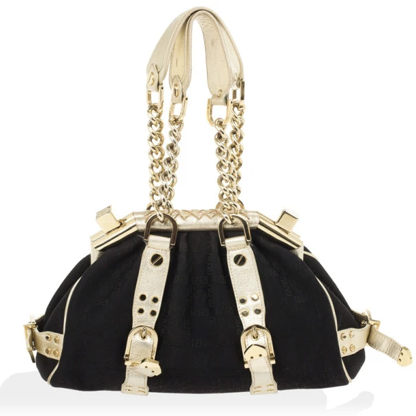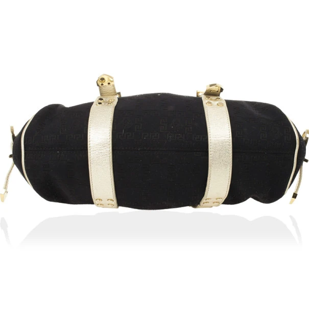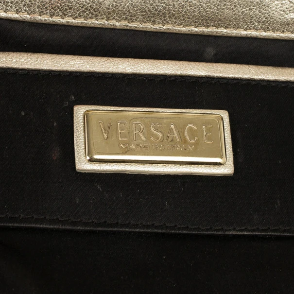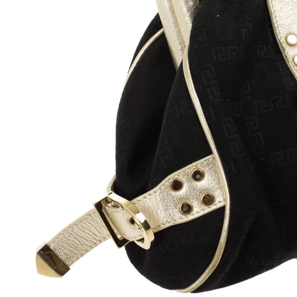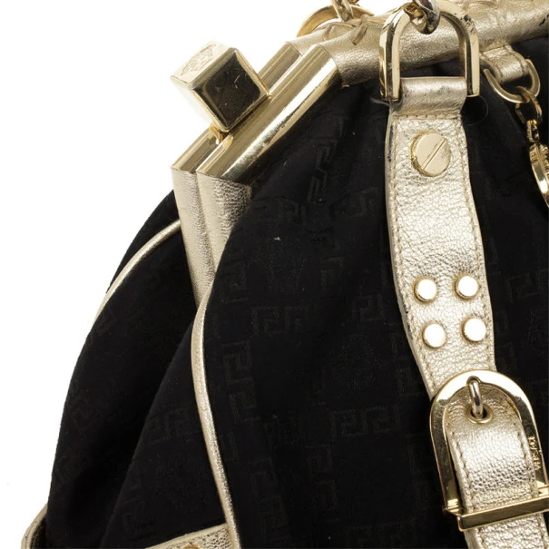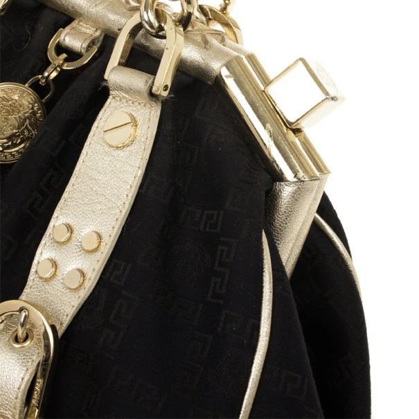 This posh Versace Madonna Boston bag will dress up both casual and evening wear. Crafted from black monogram with gold leather trim and snakeskin leather trim, it features a decorative Versace medallion, gold buckle detailing, a snap closure and chain-link and leather handles. Lined with patterned black satin, the interior features a zip pocket with a Versace label.
