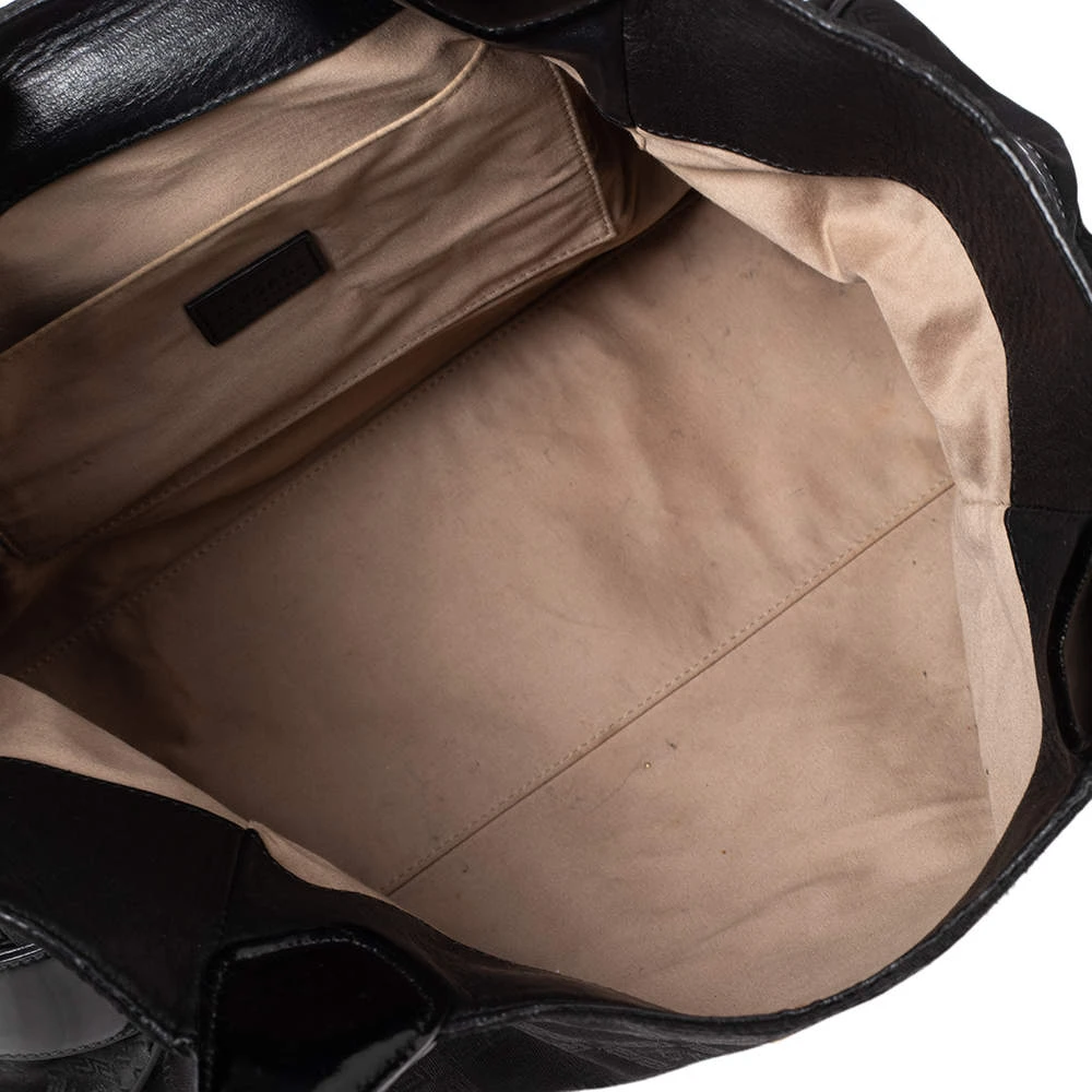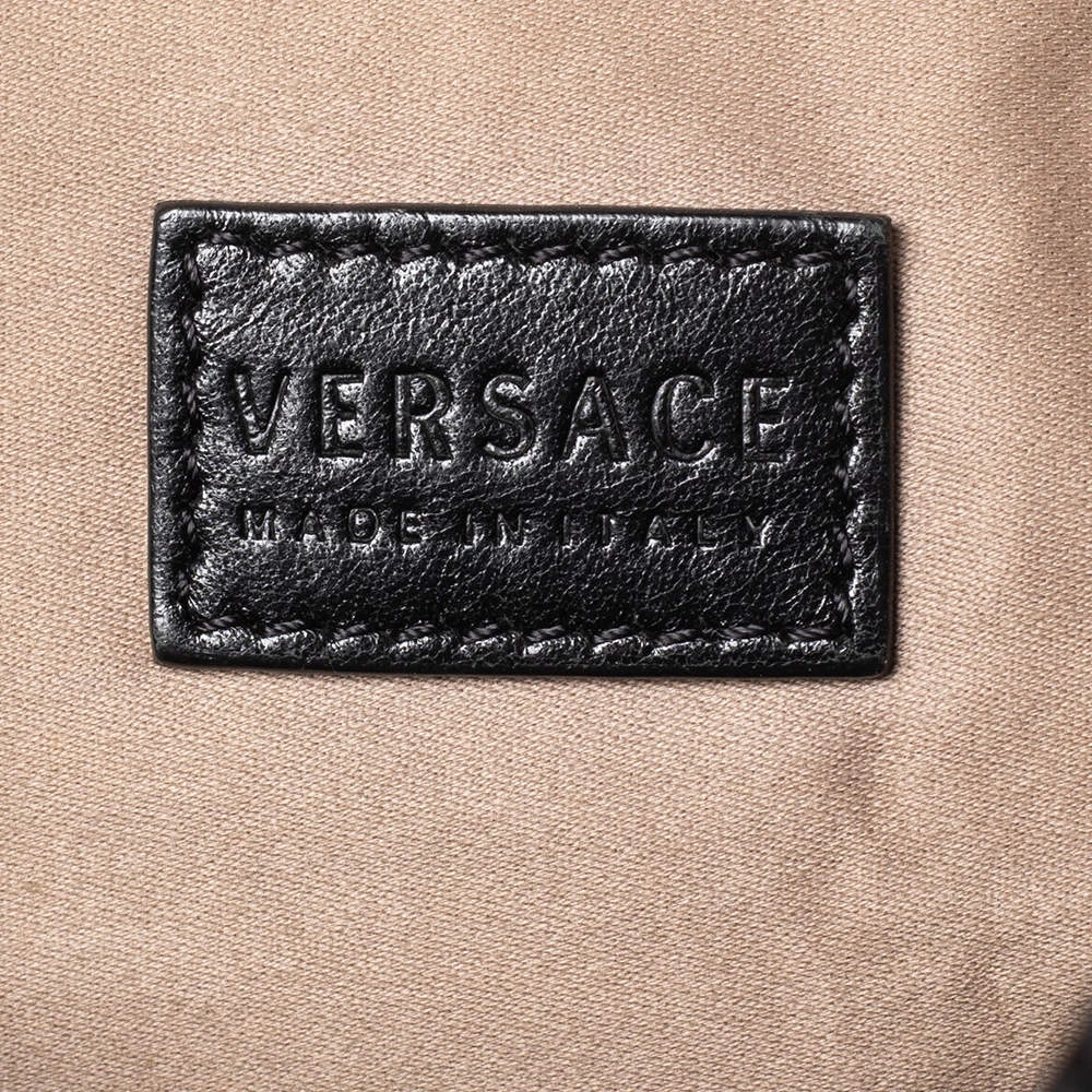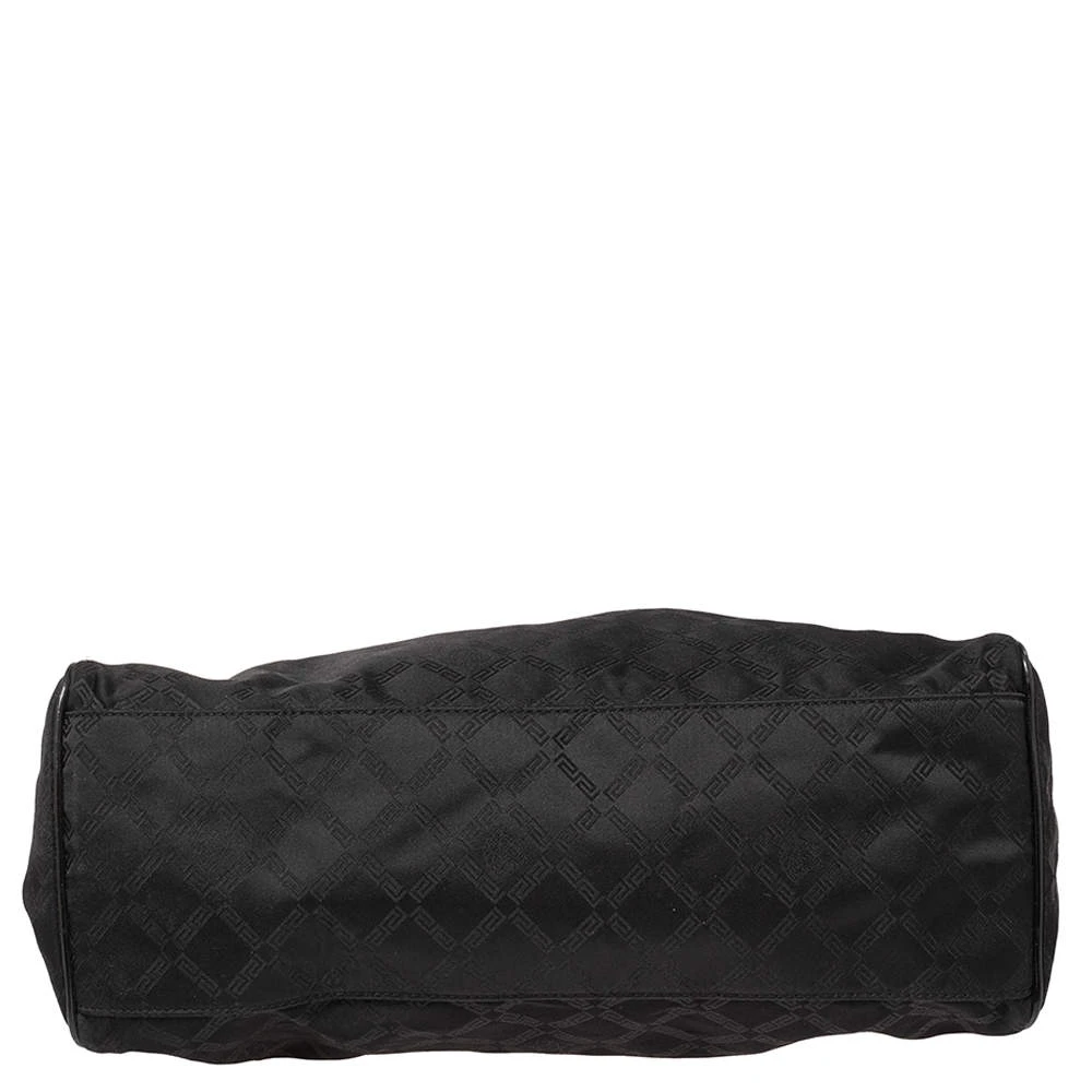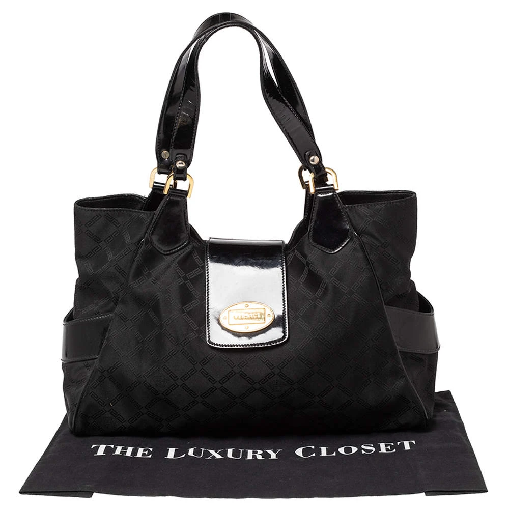 Made from monogram nylon and patent leather, this Versace tote brings a spacious size and a refined appeal. It features two handles, gold-tone hardware, exterior pockets, and a fabric-lined interior.